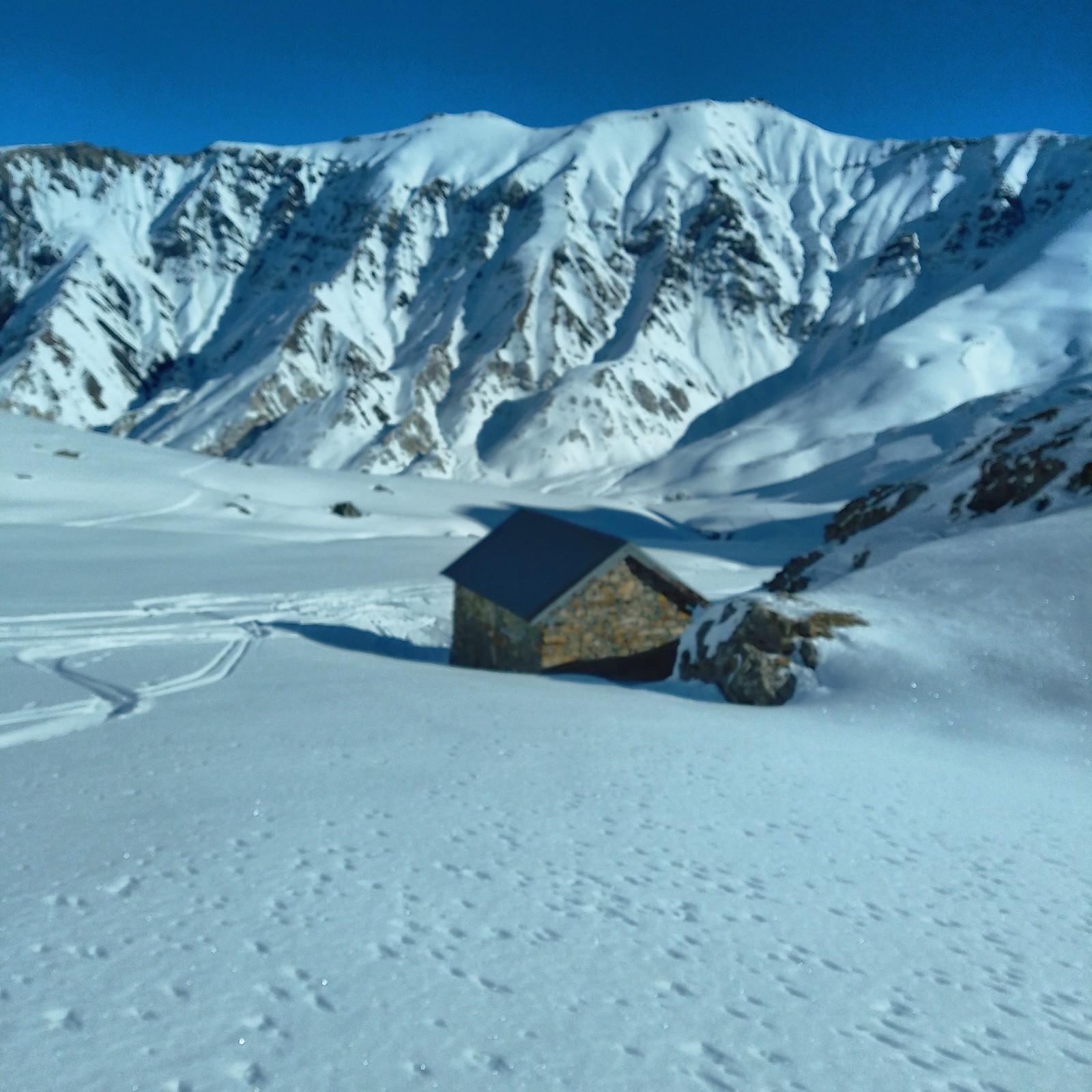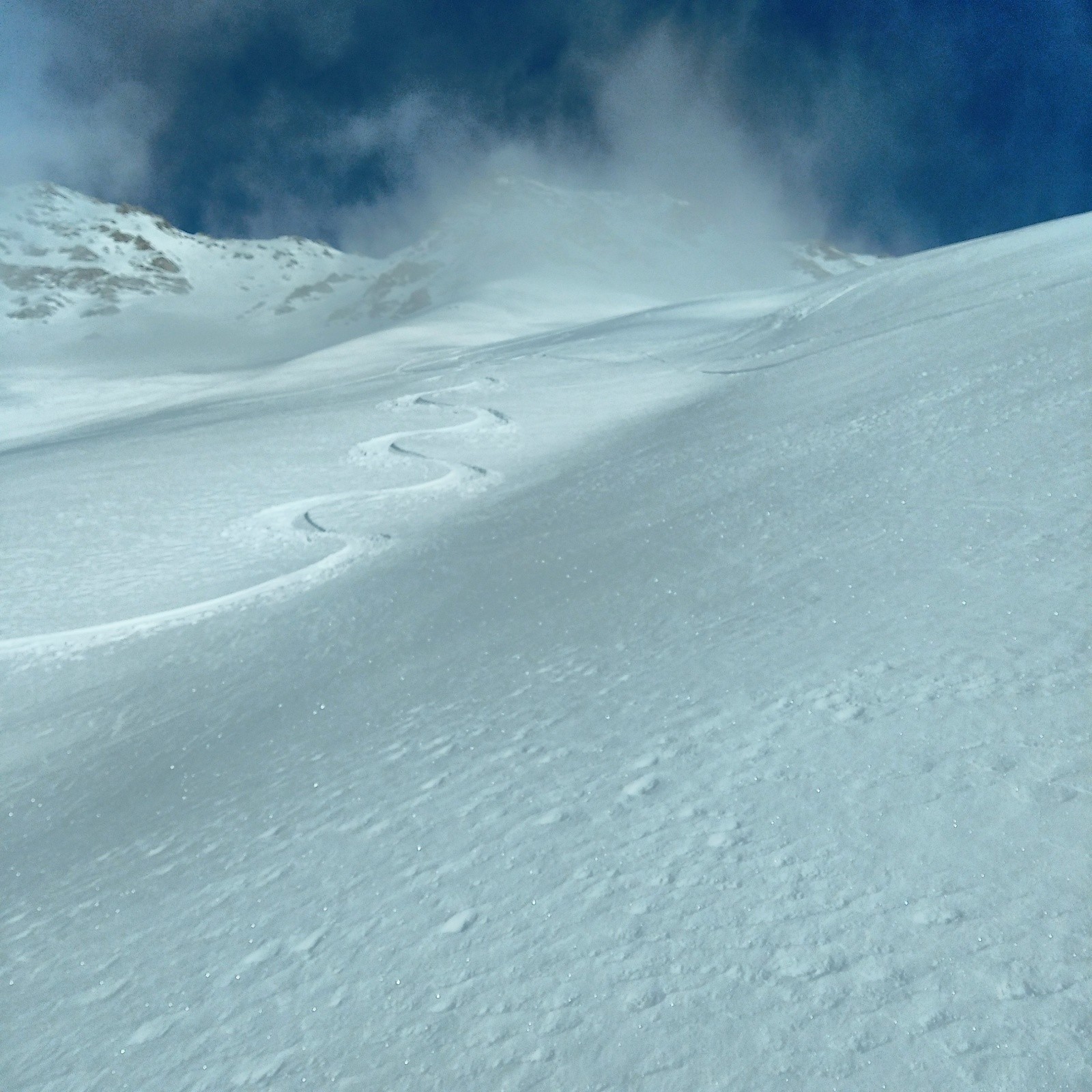 Je redescends l'arête jusqu'au sommet sous le Crêt, et je commence une belle descente vers le chalet de Valbuche...avec en prime un goulet a 40° non skié et bien bon...il faut chercher la poudreuse, il y a des zones soufflées et dures..mais il y a de quoi faire...ce vallon est magnifique et sauvage...sympa jusqu'au chalet... nouvelle pause, et contemplation...puis direction la combe des chevriers...je passe sous le Mollard des Bœufs, et direction un col a droite de la pointe de valbuche....un beau couloir large à 40° m'attend, et me permettra de rejoindre la trace de montée du matin, puis de plonger vers Bonvillard par le ruisseau..