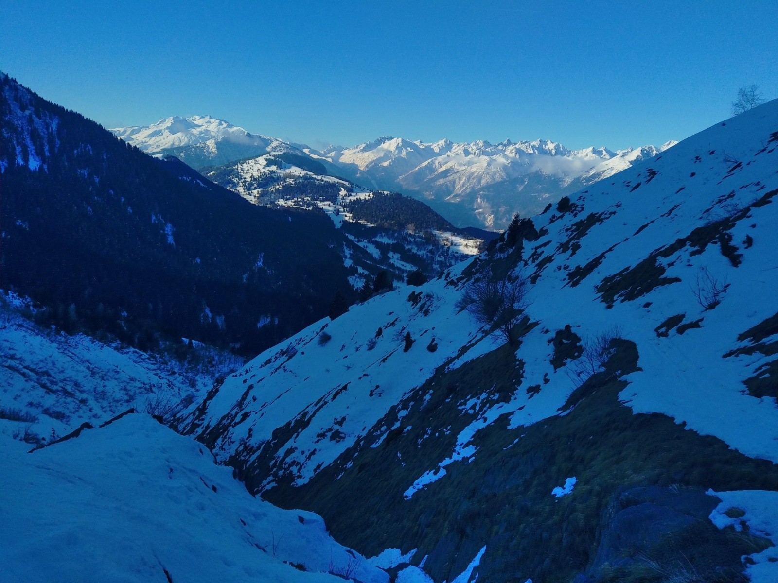 Le paysage est époustouflant... Belledonne derrière, un vallon sauvage a souhait devant...et seul au monde... j'apprécie pleinement cette solitude...et prend le temps de me restaurer, boire...et me réchauffer...puis direction le Crêt Lognan...la trace soufflée porte bien, a côté c'est poudreux 😎 ça présage une belle descente sur le chalet de Valbuche..je passe un premier sommet, puis une arête plane qui monte au final vers le Crêt Lognan... j'avais prévu d'aller dans la foulée au Grand Coin juste après sur l'arête mais c'était bien dur la neige, et je voulais redescendre sous le sommet d'avant Crêt Lognan...la face Nord du grand coin est toujours bien chargée avec d'énormes corniches formées par le vent d'ouest..je prends le temps de manger au soleil avec vue sur saint jean de Maurienne en contrebas...on est bien tout la haut.