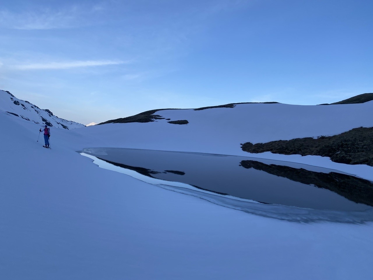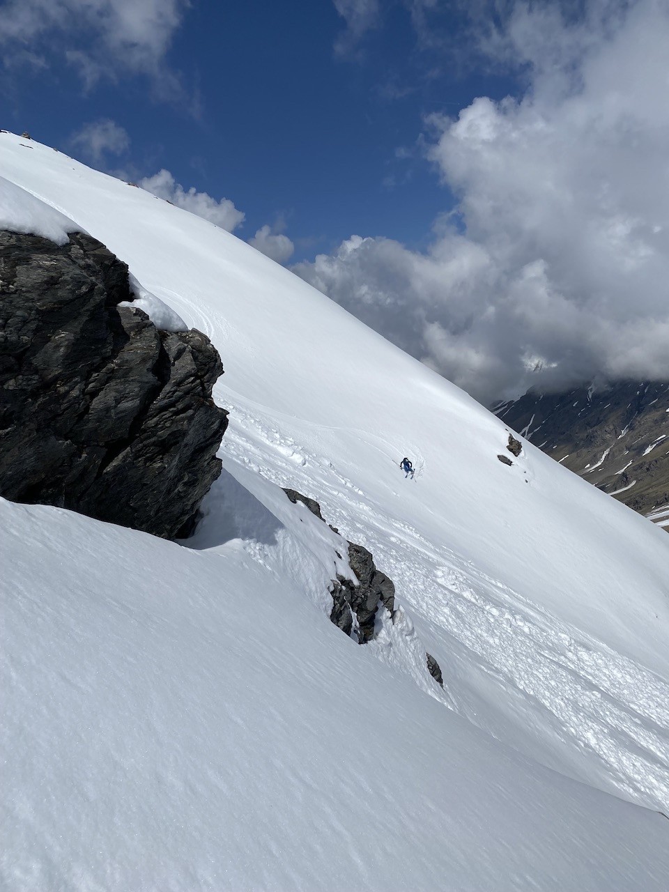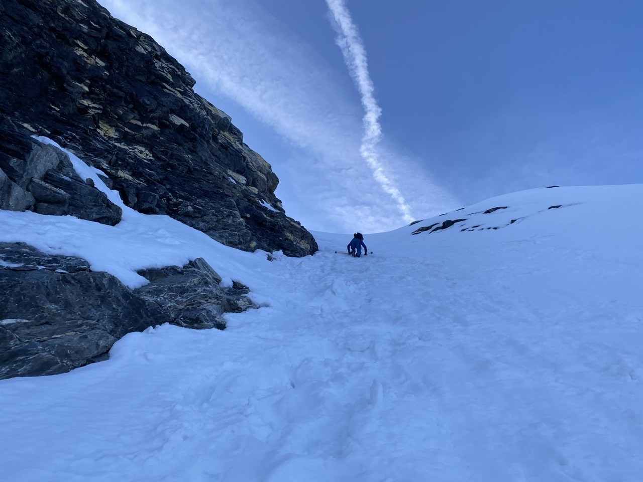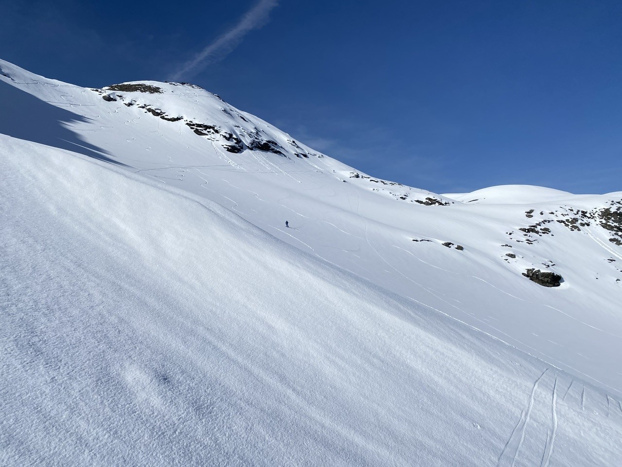 Conditions pour le ski : plutôt abimé / boulettes gelées dans la partie médiane, mais en louvoyant on arrive à se tenir principalement sur des parties lisses qui transforme