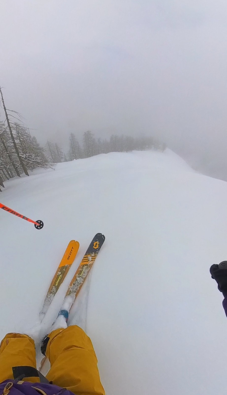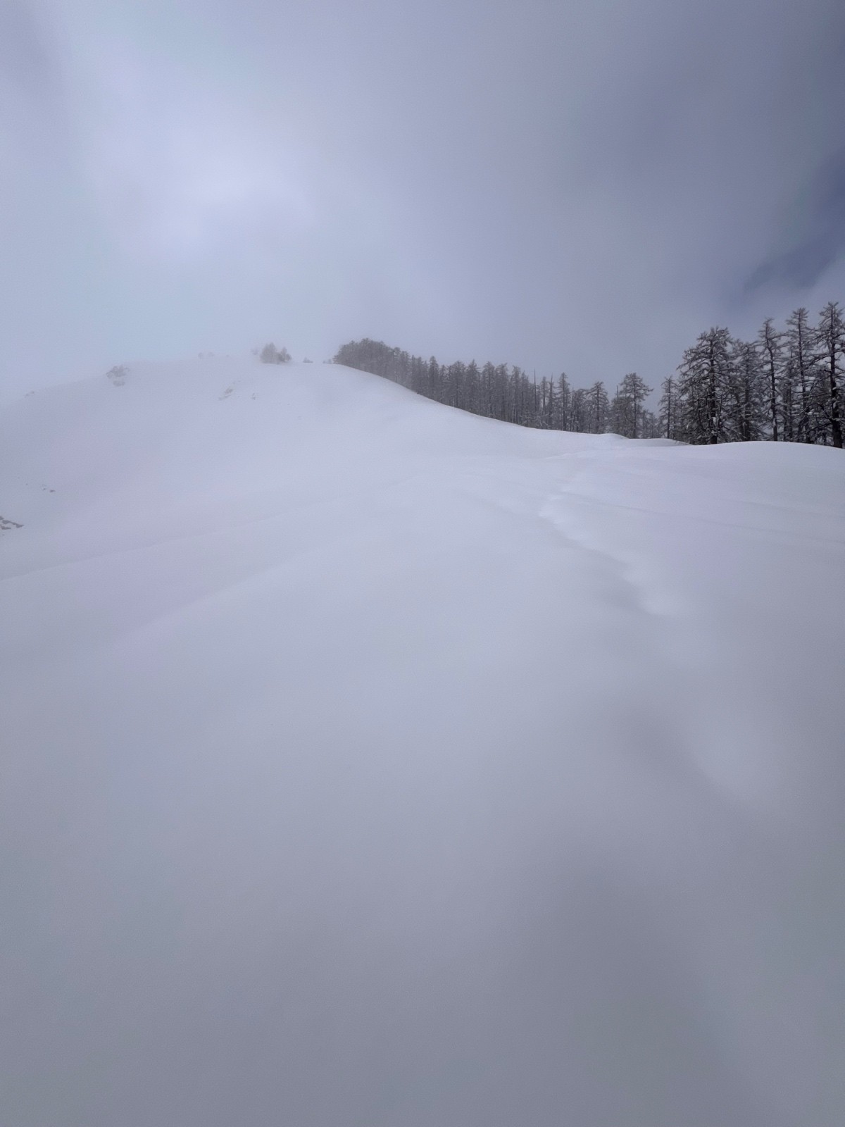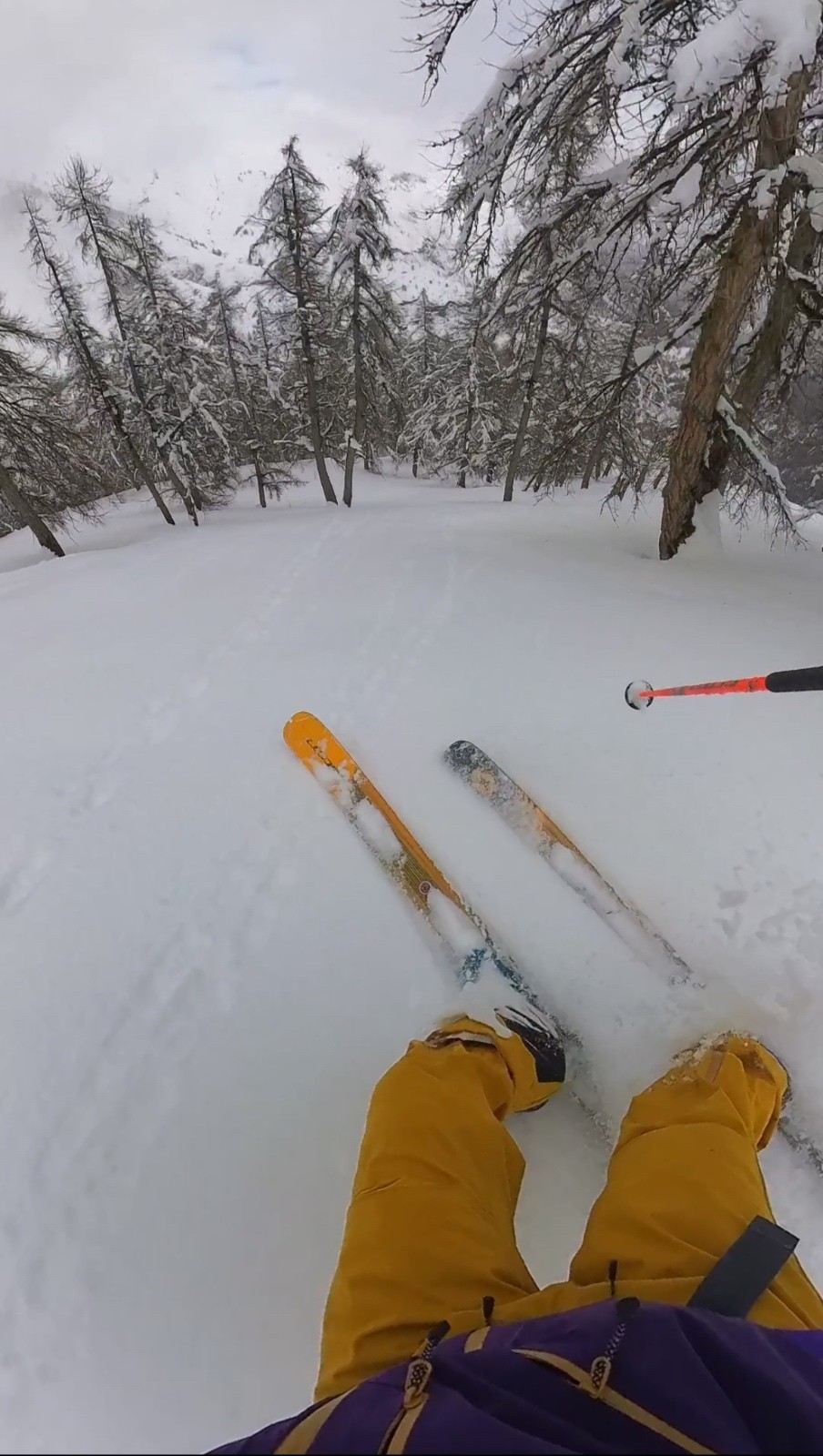 Étant seul, la neige ne s’améliorant pas et croisant personne je préfère m’arrêter autour de 2300m au-dessus des blocs. La descente jusqu’à 1900 est technique mais ça ce skis pas mal finalement. En dessous ça colle.