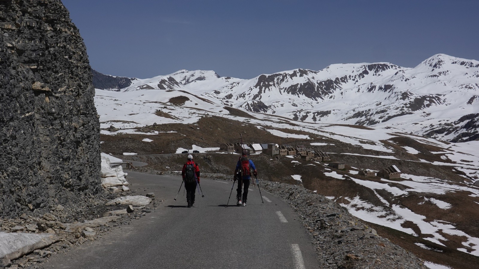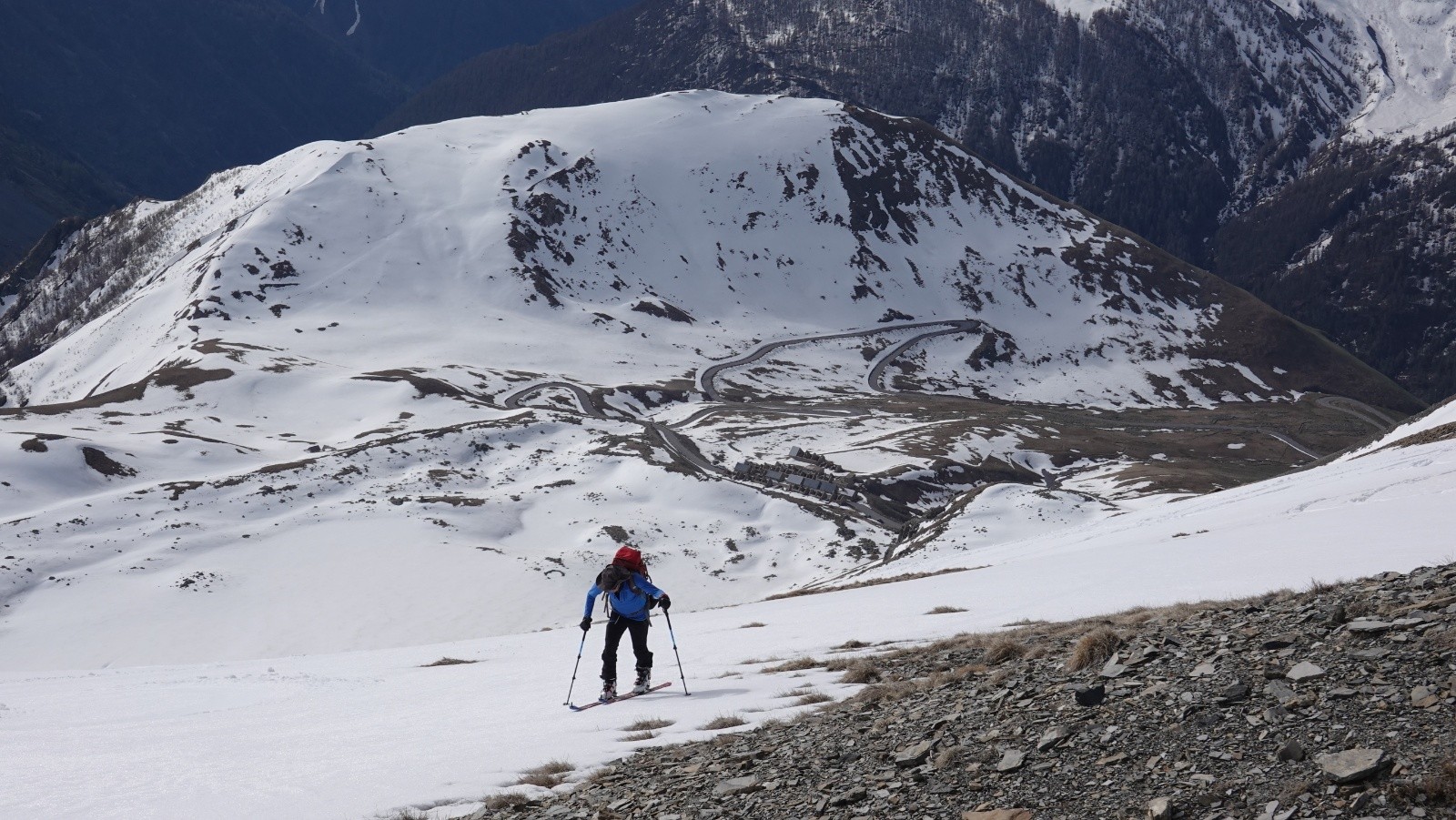 Avec la météo annoncée pour ces premiers quinze jours de mai, il fallait profiter de ce dernier créneau de beau temps car l'enneigement risque de régresser rapidement avec les averses prévues. Notre choix se porte sur la Haute Tinée au départ du Camp des Fourches. Nous partons avec des bonnes conditions de regel sur ce versant Est menant à la Cime de Pelousette qui est encore enneigé en continu mais plus pour très longtemps. Nous mettons d'ailleurs les couteaux pour une progression plus confortable. Arrivés à 8h30 au sommet avec un vent frais et toujours un large panorama s'étendant vers le Nord jusqu'au Viso et aux sommets des Ecrins masqués par ce nuage de sable en provenance du Sahara donnant cet aspect laiteux au ciel. Le haut de la descente est encore en neige un peu dure puis ensuite ce sera une bonne moquette rase jusque dans le bas du vallon de Pelouse. Repeautage pour la Cime de Voga avec un léger vent bien agréable qui tempère l'ardeur du soleil. Marc s'arrêtera au-dessus du Col de Pelouse et avec David nous atteignons le sommet un peu avant midi avant une descente qui va s'avérer toujours en bonnes conditions jusque 100m sous le Col de Pelouse. Un dernier court repeautage nous permettra de rejoindre la bosse au-dessus du Col de Pelouse pour notre pause déjeuner. La dernière descente en versant Sud puis Ouest permet encore du ski très correct jusqu'à la route avant une petite marche pour rejoindre le Camp des Fourches. Peu de monde en ce vendredi, juste deux groupes de skieurs sur le tour de l'Enchastraye et quelques cyclistes profitant du déneigement complet de la route jusqu'au Col de la Bonette.