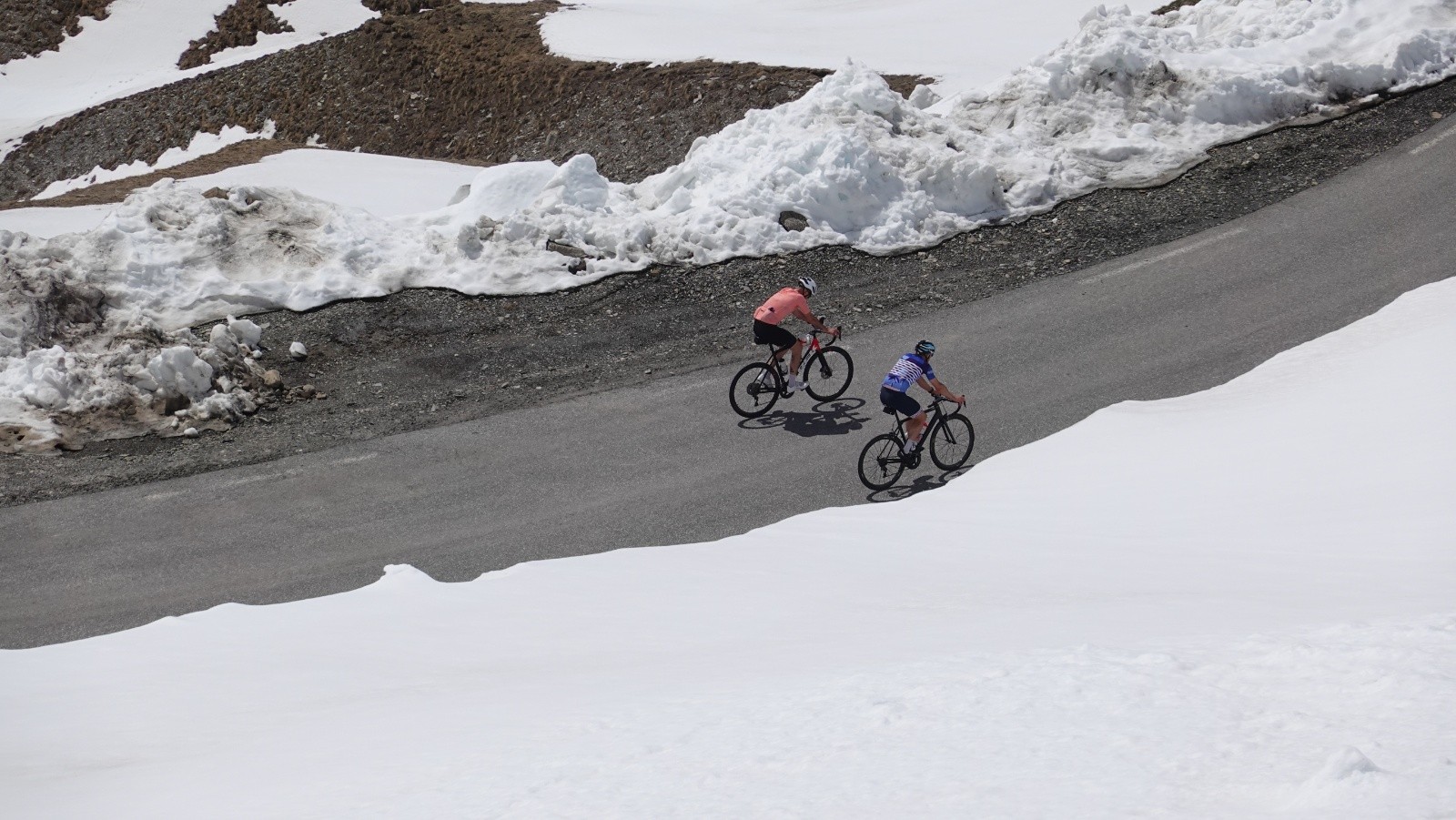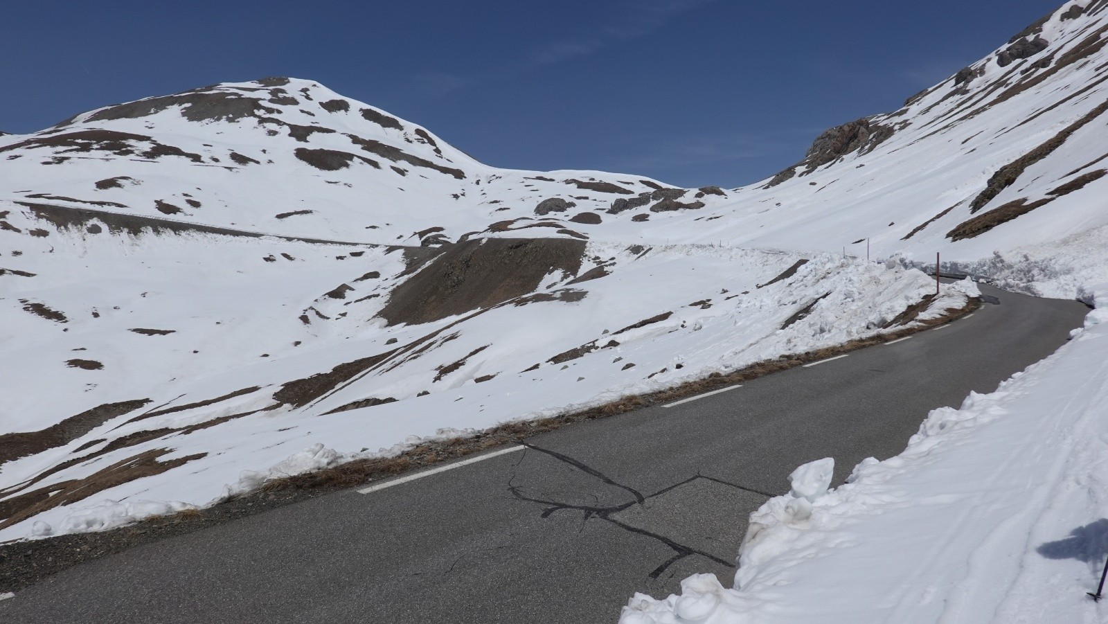 Pause sommitale sur fond de Pelat, Bonette et Cimet et la route entièrement déneigée jusqu'au Col de la Bonette