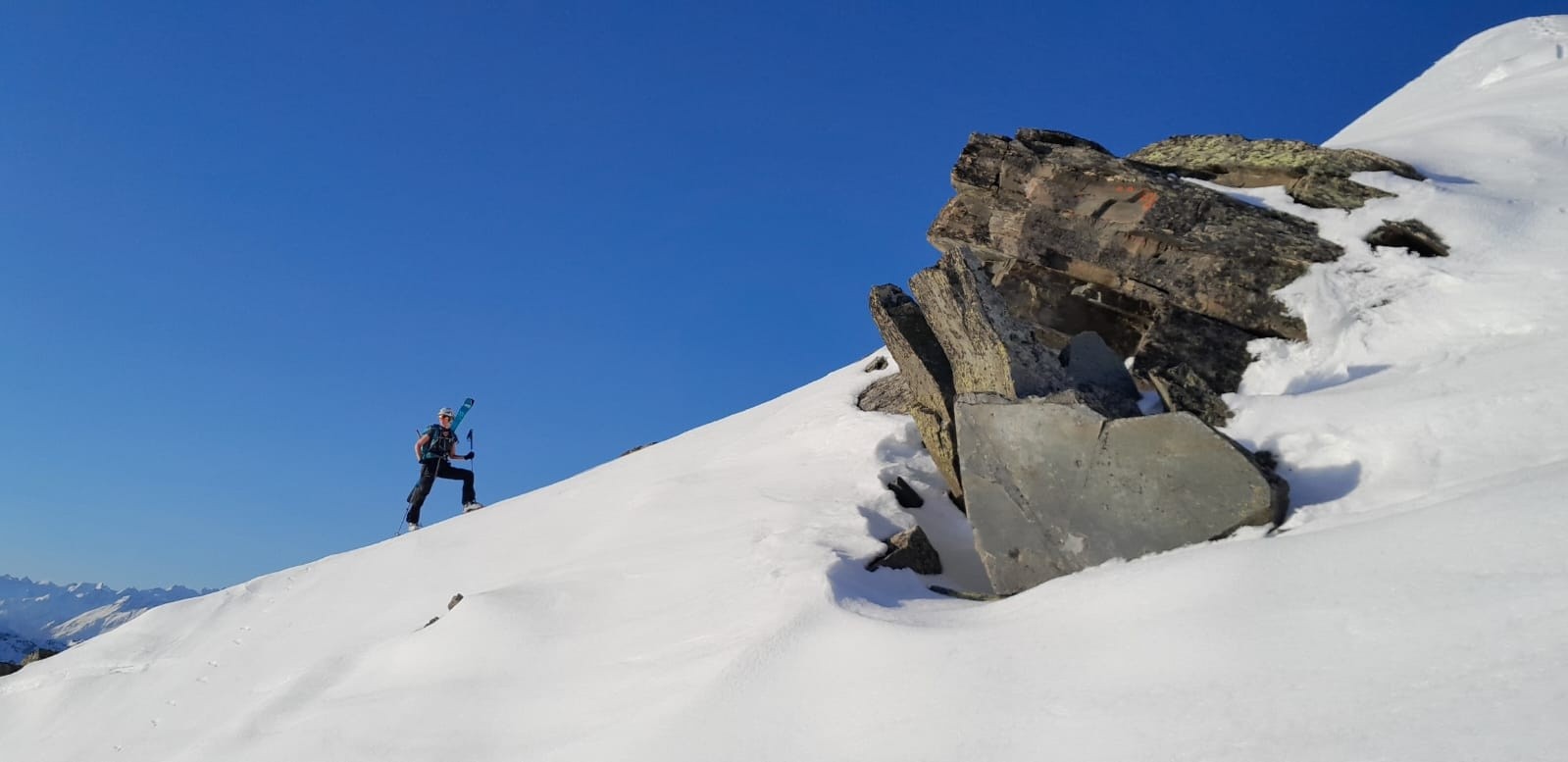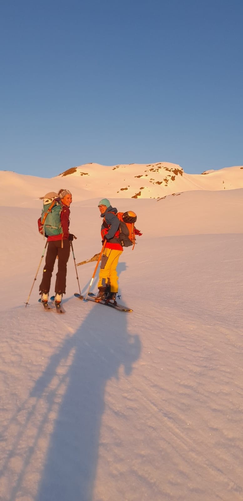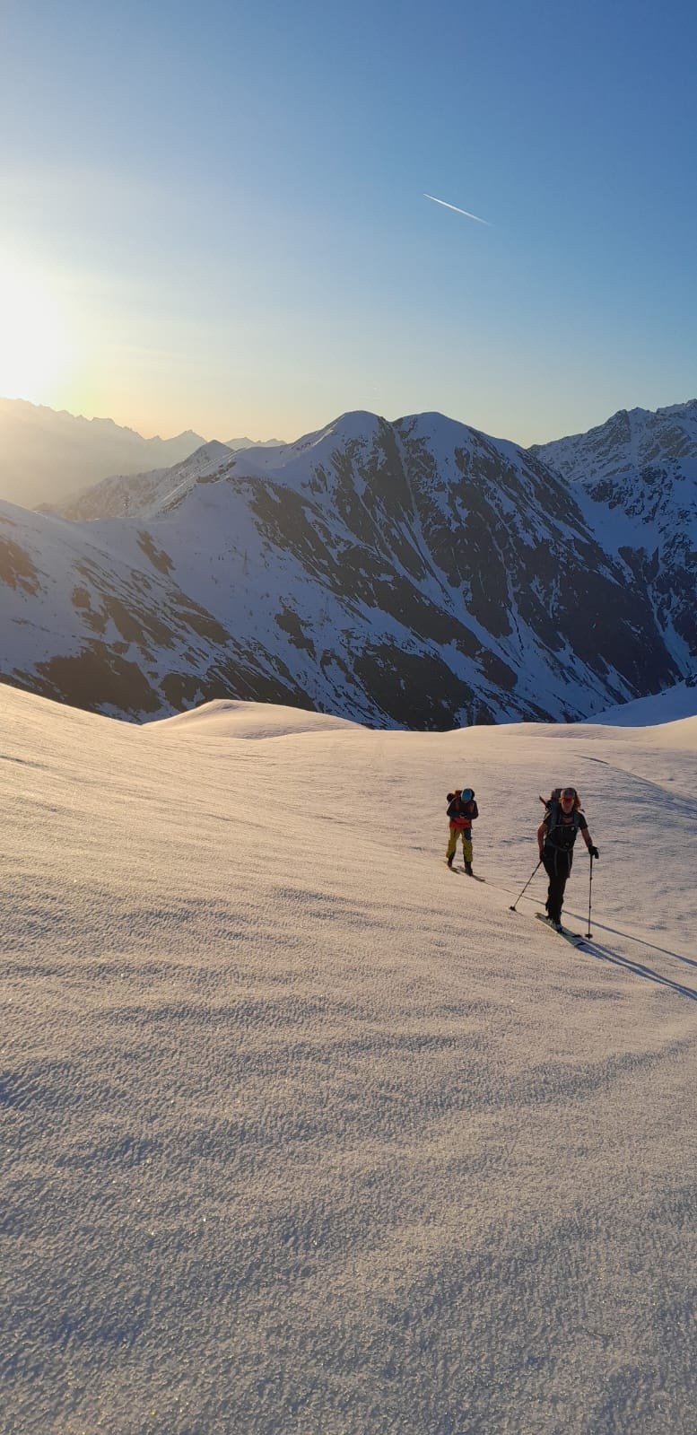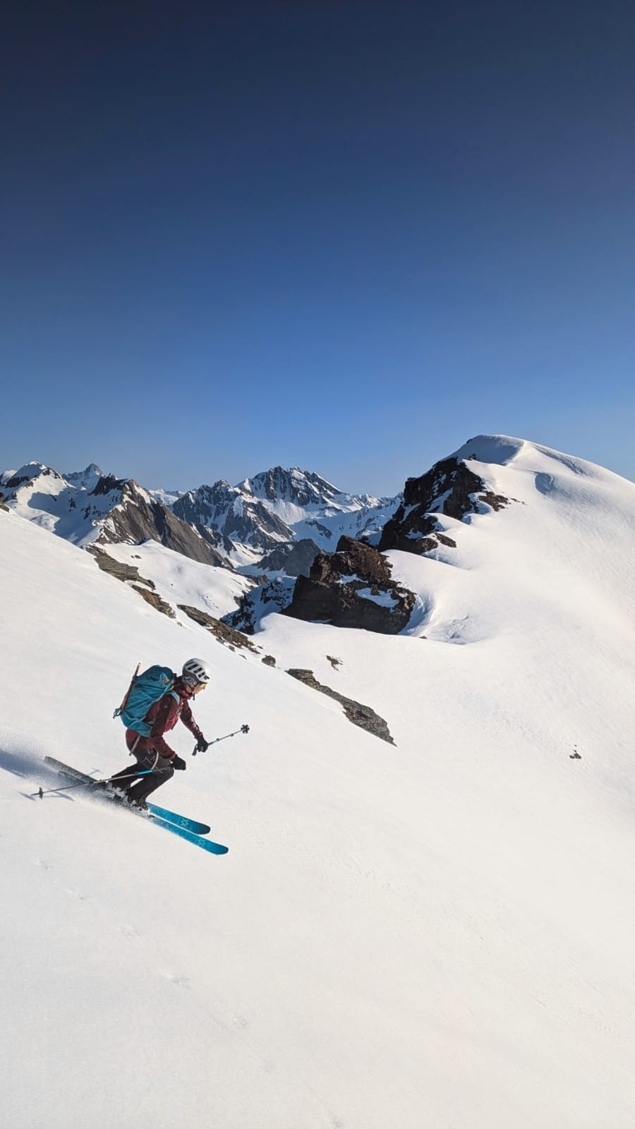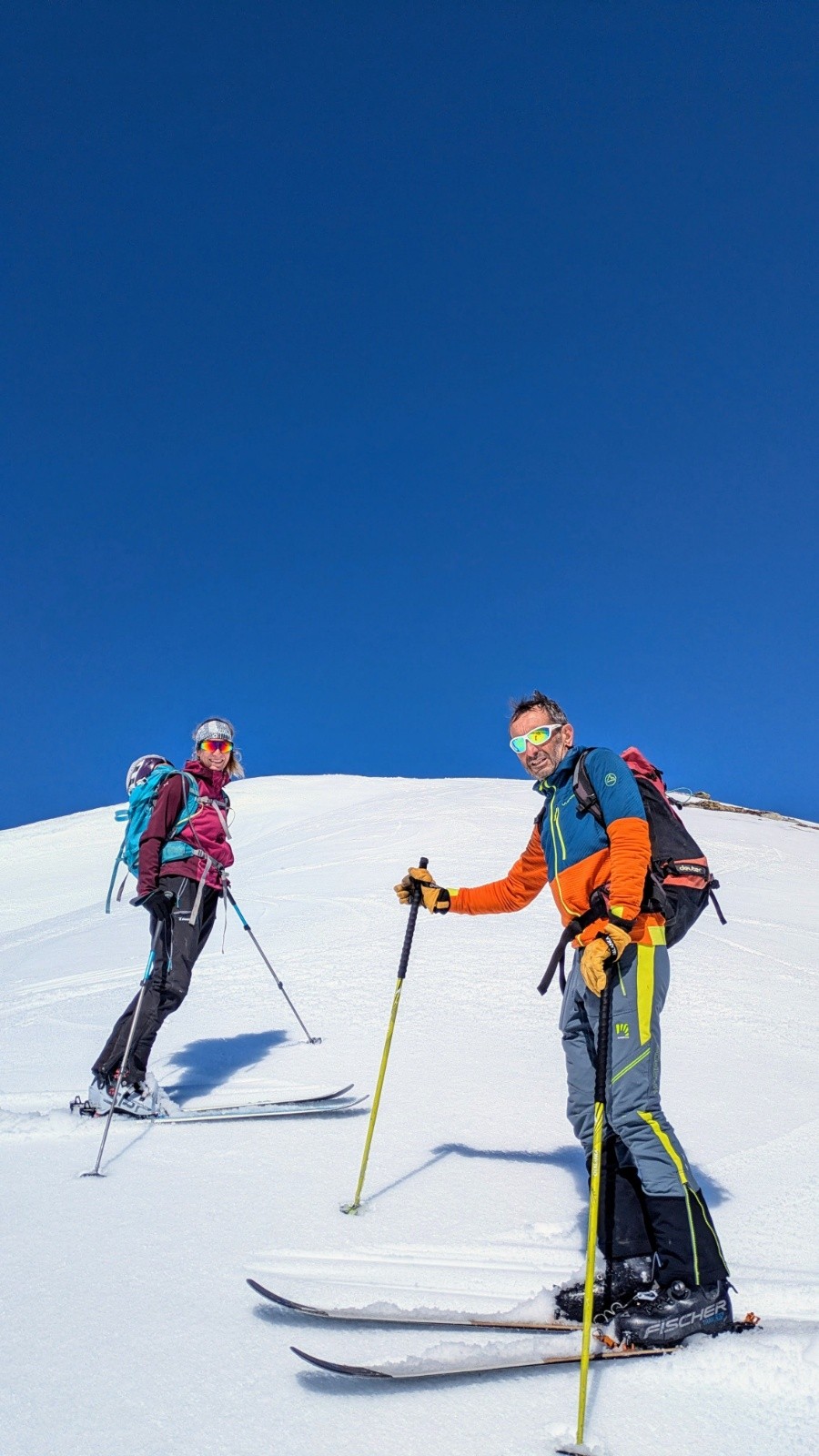 une première petite montée sur un petit sommet contrefort de la pointe de Sereina qui offre une belle pente à skier. la Lumière est juste sublime ! On se régale. Arrivés à la pointe on pousse vers une autre bosse un peu plus raide on laisse les skis . puis on redescend en direction de la pointe de Dziule la descente est bonne même si c'est pas encore décaillé. on contourne la barre rocheuse de la pointe de Dziule pour la remonter plein Est. Du sommet on redescend plein sud c'est encore meilleur, puis on revient en direction de la face Est de la teste di Fra. La ca commence à chauffer sévère ! Dans la pente finale plus raide , je veux remonter skis sur le sac mais mauvais pioche j'enfonce à mort et je m'épuise sur les 50 deniers mètres, sous le rire goguenard de mon collègue et néanmoins ami Manu. La descente est top on s'éclate. on remonte à un petit col qui nous ramène dans le vallon du bivouac sur une troisième pointe sans nom de la on se refait une belle descente plus bas que le bivouac pour profiter encore . Quand ça devient trop lourd on repeaute et on remonte au bivouac et une dernière pour la route on remonte à la tête de sereina. Le manège enchanté..