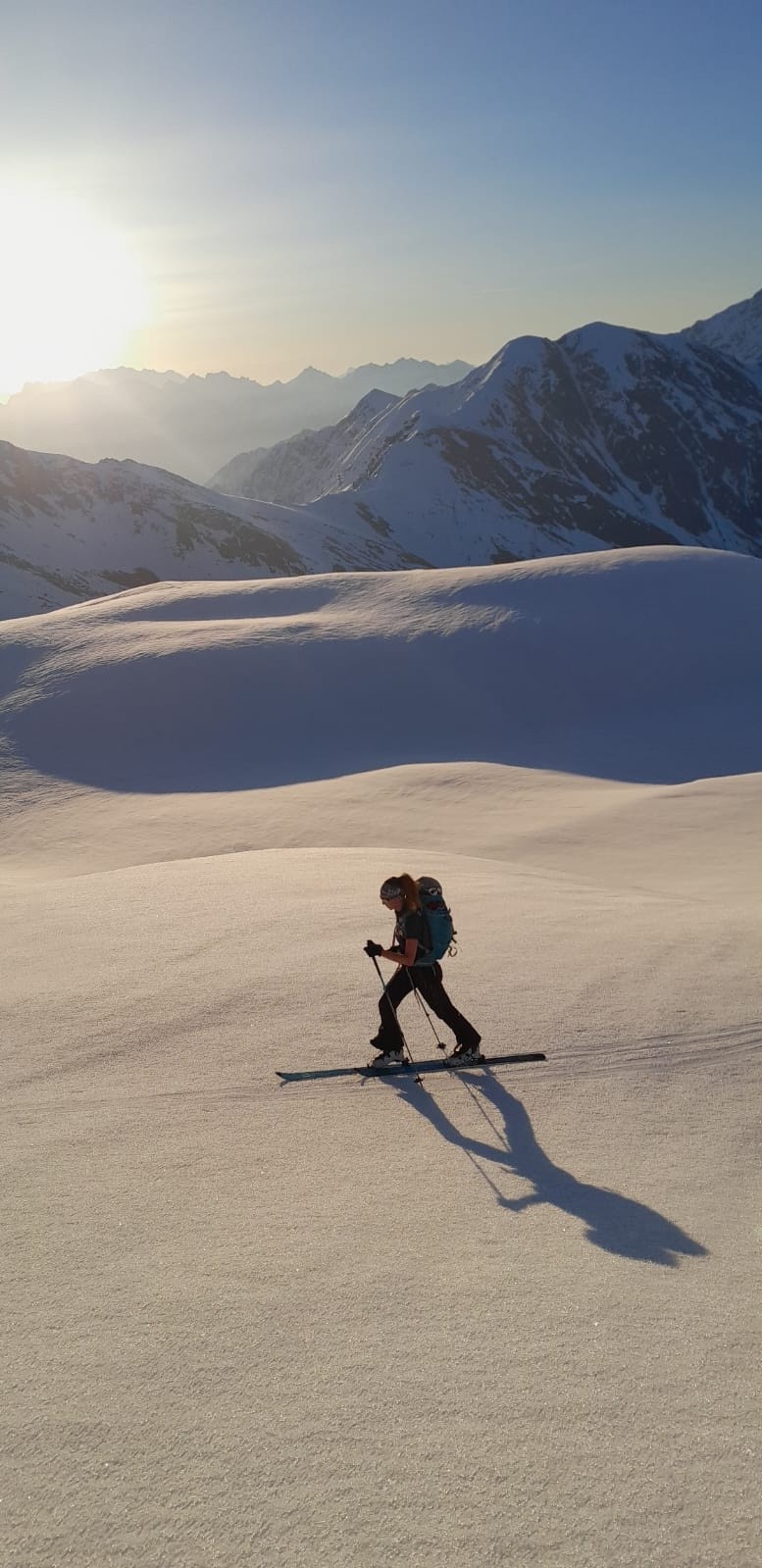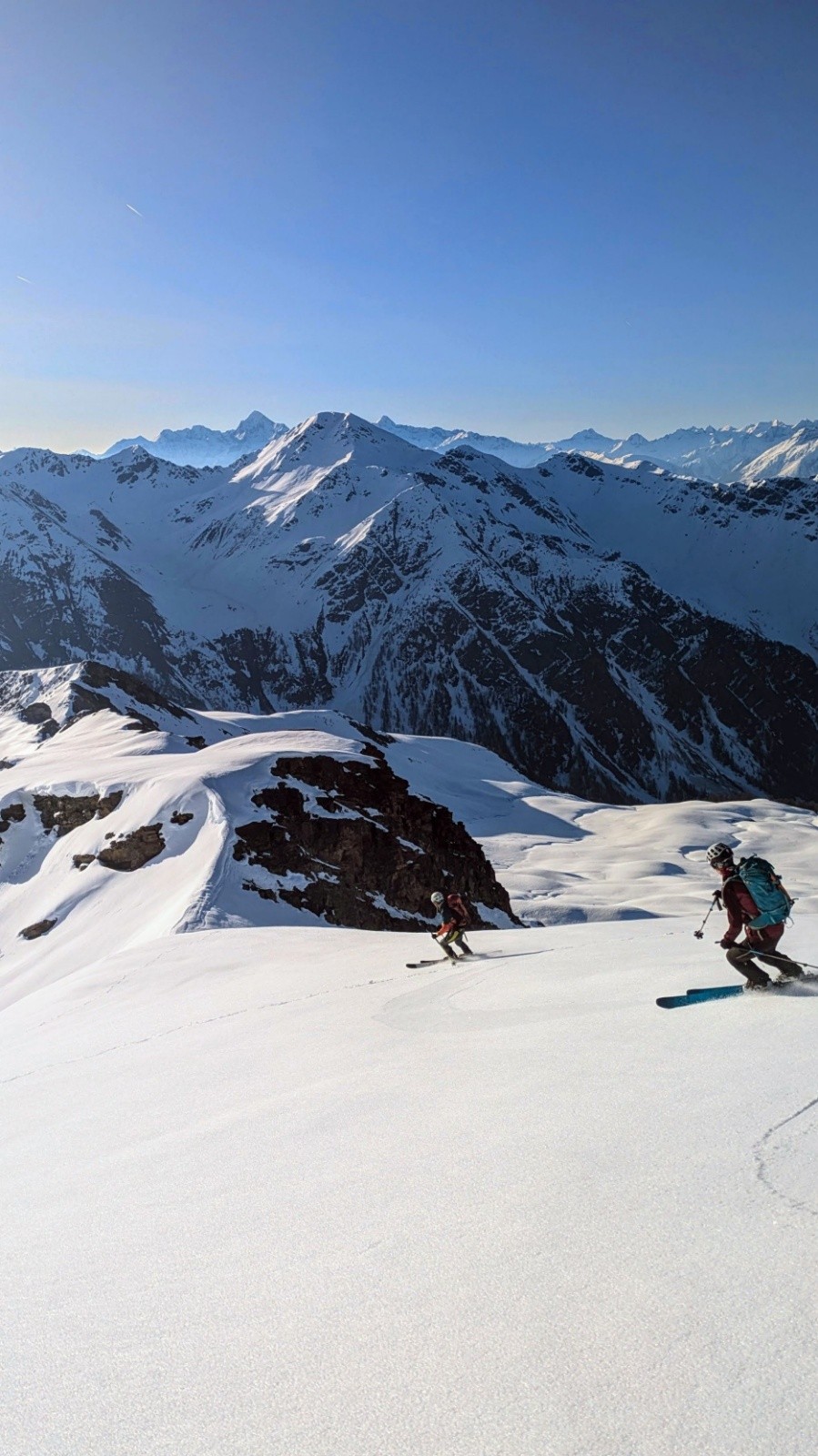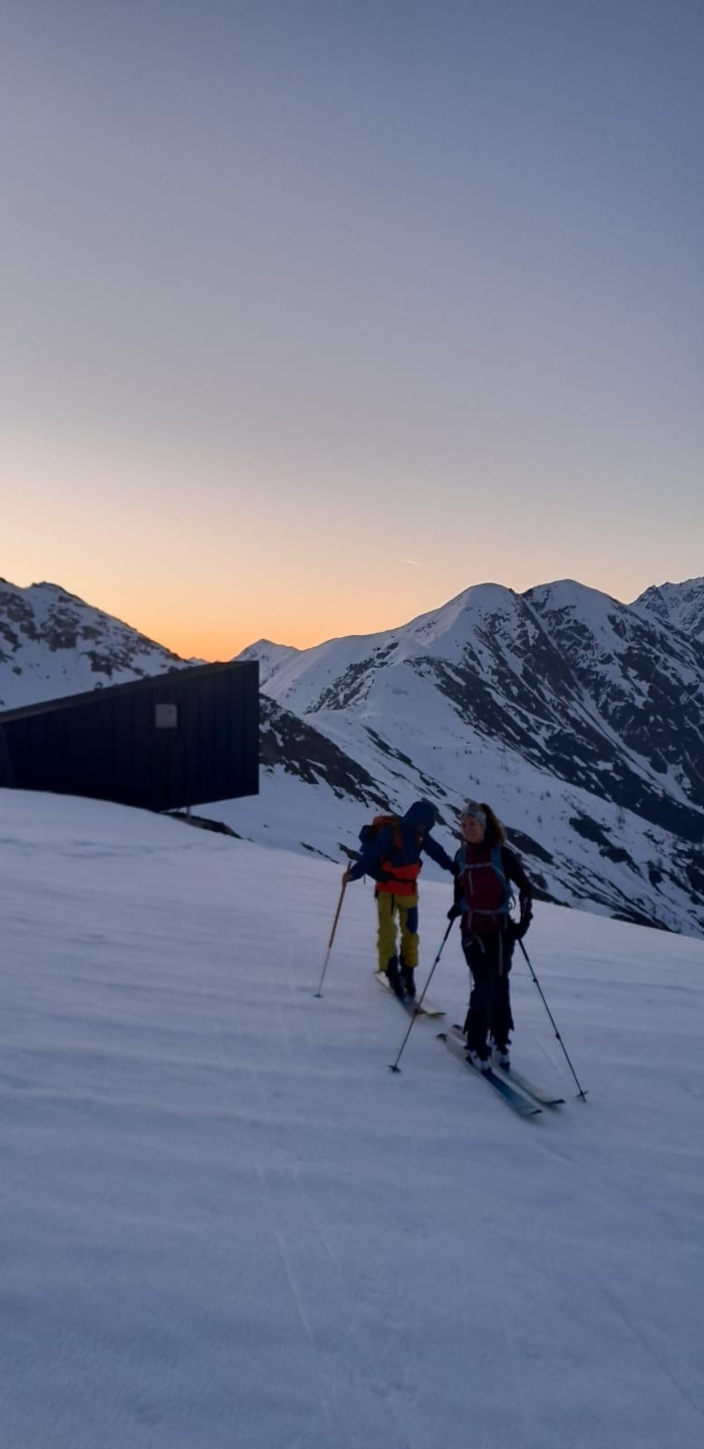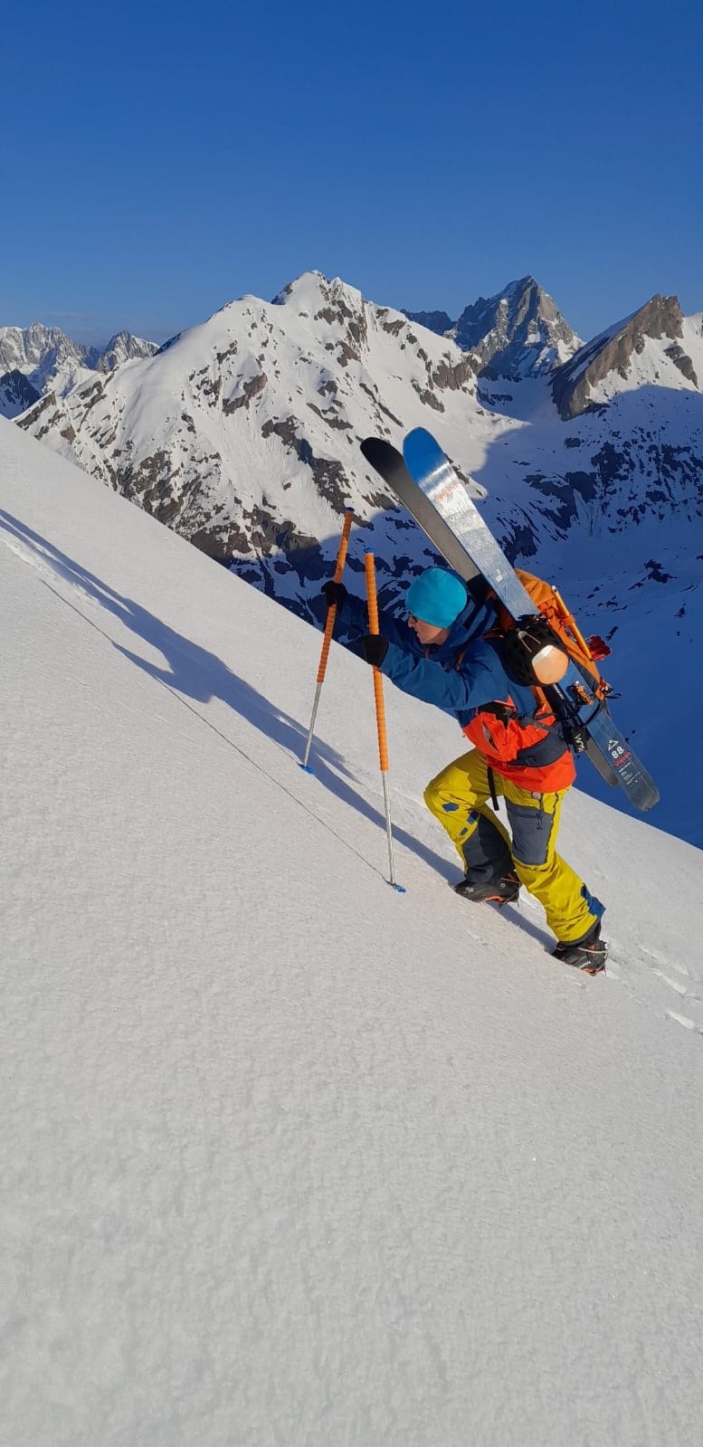 une première petite montée sur un petit sommet contrefort de la pointe de Sereina qui offre une belle pente à skier. la Lumière est juste sublime ! On se régale. Arrivés à la pointe on pousse vers une autre bosse un peu plus raide on laisse les skis . puis on redescend en direction de la pointe de Dziule la descente est bonne même si c'est pas encore décaillé. on contourne la barre rocheuse de la pointe de Dziule pour la remonter plein Est. Du sommet on redescend plein sud c'est encore meilleur, puis on revient en direction de la face Est de la teste di Fra. La ca commence à chauffer sévère ! Dans la pente finale plus raide , je veux remonter skis sur le sac mais mauvais pioche j'enfonce à mort et je m'épuise sur les 50 deniers mètres, sous le rire goguenard de mon collègue et néanmoins ami Manu. La descente est top on s'éclate. on remonte à un petit col qui nous ramène dans le vallon du bivouac sur une troisième pointe sans nom de la on se refait une belle descente plus bas que le bivouac pour profiter encore . Quand ça devient trop lourd on repeaute et on remonte au bivouac et une dernière pour la route on remonte à la tête de sereina. Le manège enchanté..
