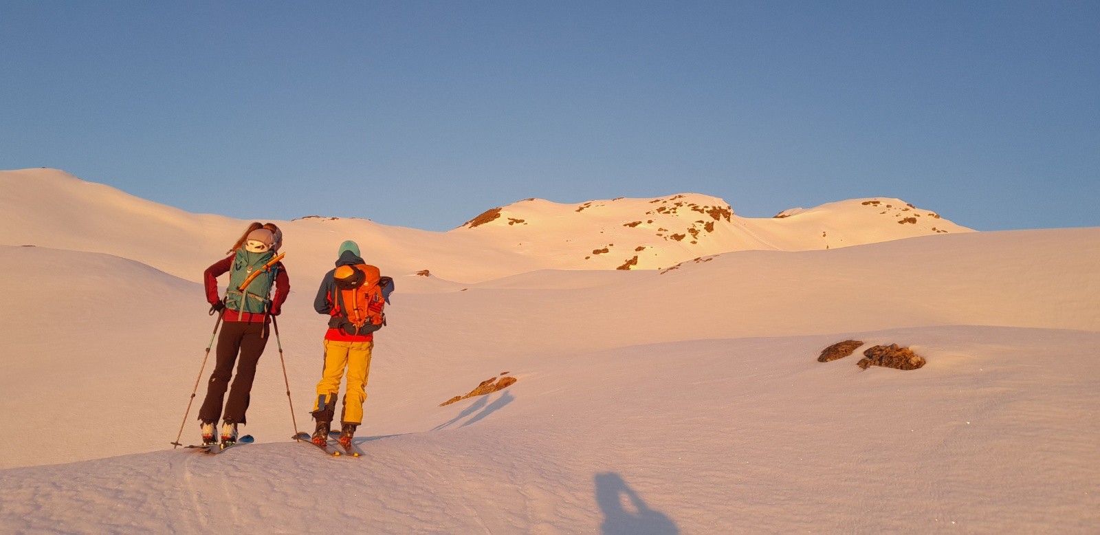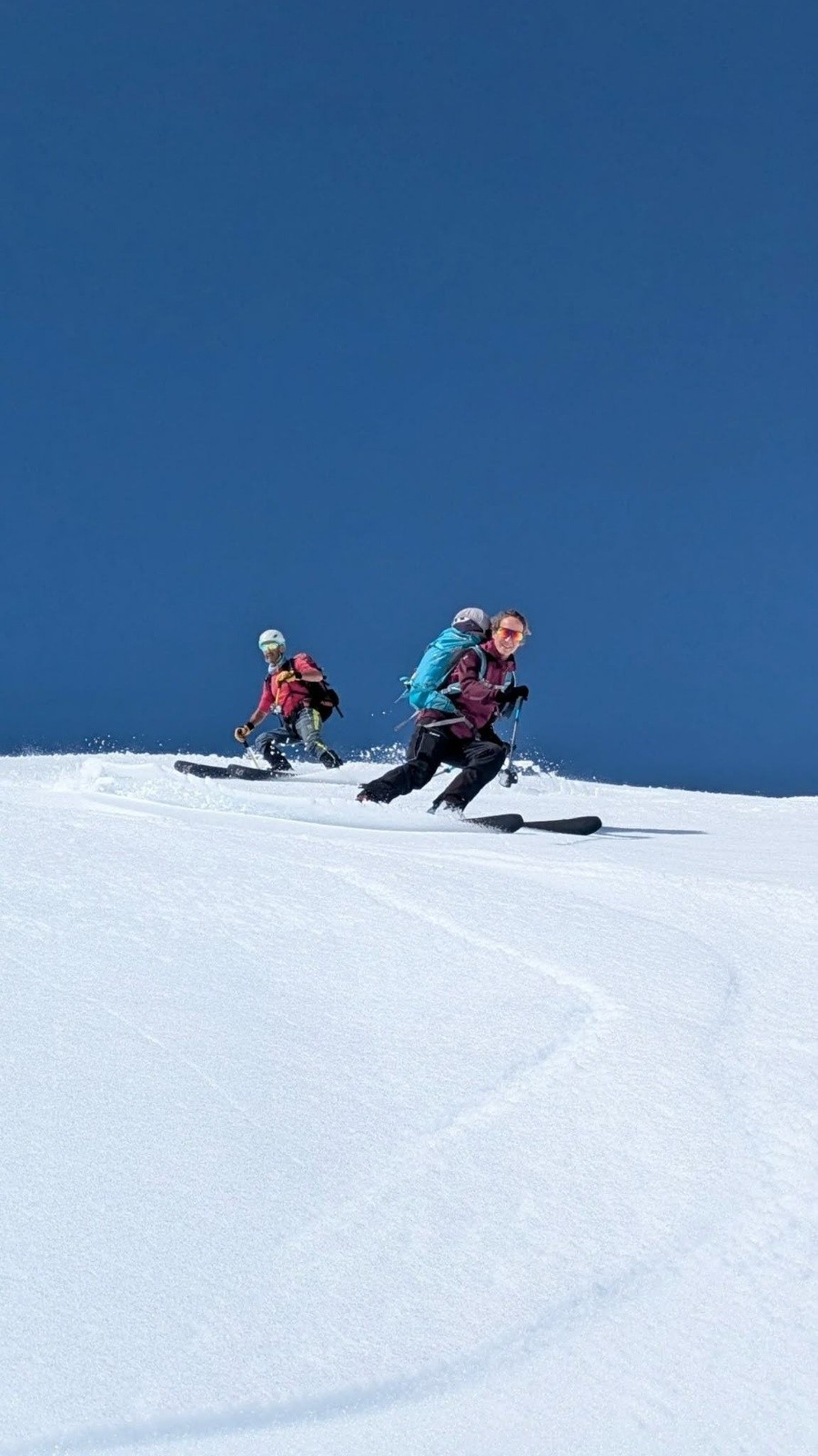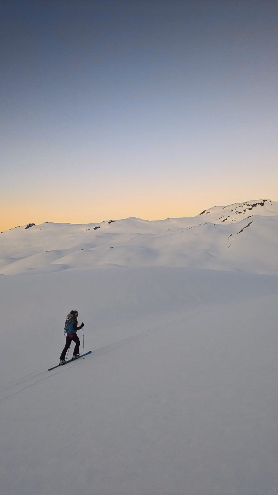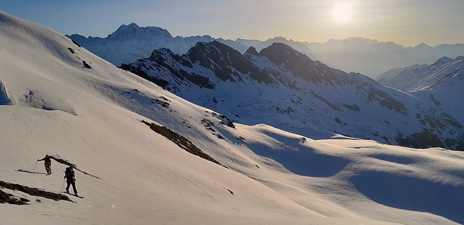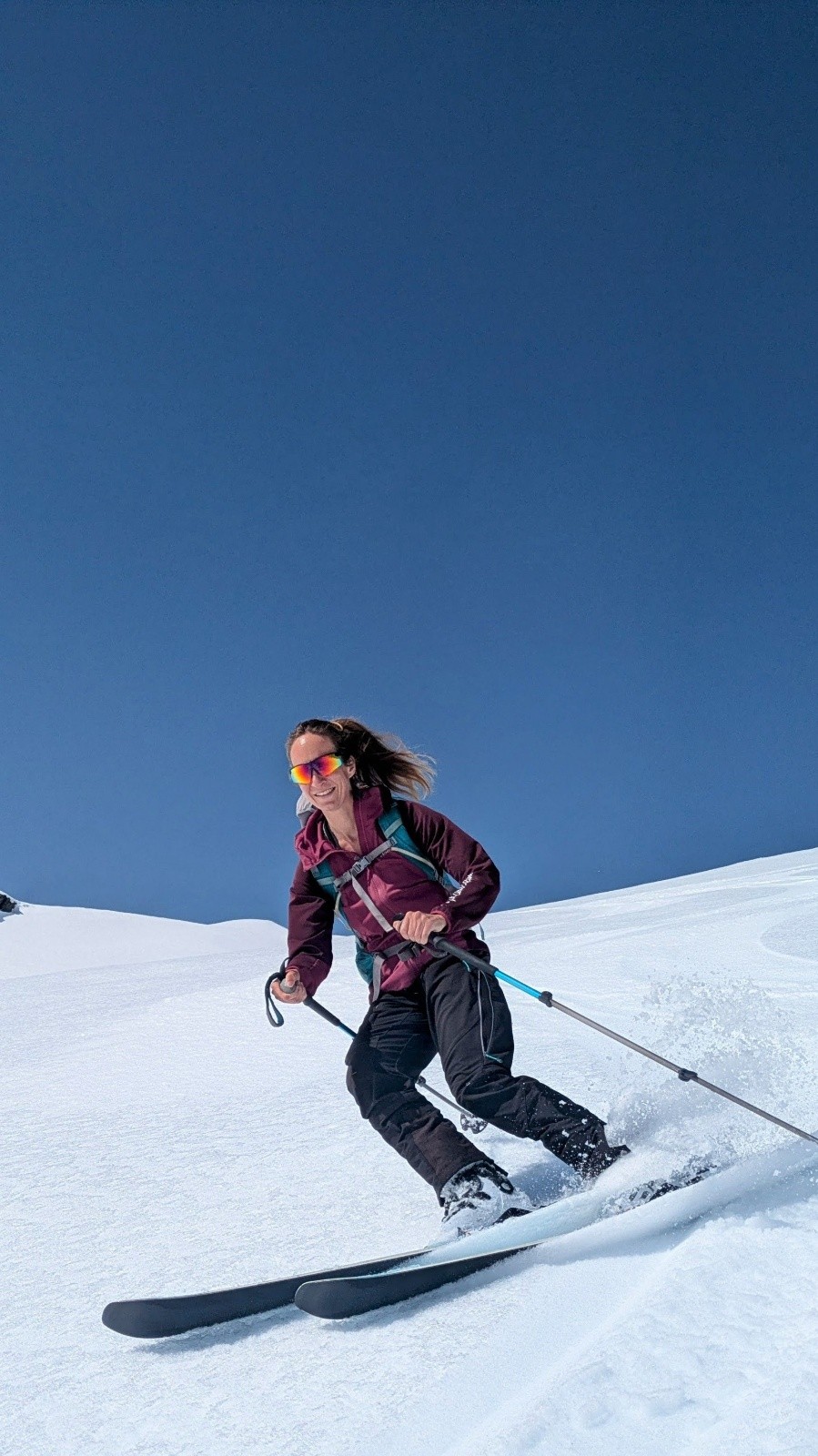 une première petite montée sur un petit sommet contrefort de la pointe de Sereina qui offre une belle pente à skier. la Lumière est juste sublime ! On se régale. Arrivés à la pointe on pousse vers une autre bosse un peu plus raide on laisse les skis . puis on redescend en direction de la pointe de Dziule la descente est bonne même si c'est pas encore décaillé. on contourne la barre rocheuse de la pointe de Dziule pour la remonter plein Est. Du sommet on redescend plein sud c'est encore meilleur, puis on revient en direction de la face Est de la teste di Fra. La ca commence à chauffer sévère ! Dans la pente finale plus raide , je veux remonter skis sur le sac mais mauvais pioche j'enfonce à mort et je m'épuise sur les 50 deniers mètres, sous le rire goguenard de mon collègue et néanmoins ami Manu. La descente est top on s'éclate. on remonte à un petit col qui nous ramène dans le vallon du bivouac sur une troisième pointe sans nom de la on se refait une belle descente plus bas que le bivouac pour profiter encore . Quand ça devient trop lourd on repeaute et on remonte au bivouac et une dernière pour la route on remonte à la tête de sereina. Le manège enchanté..