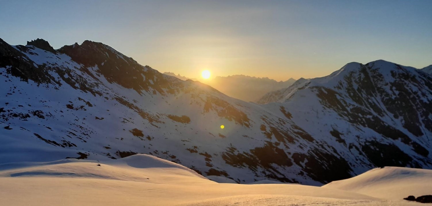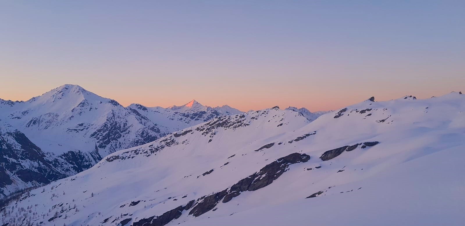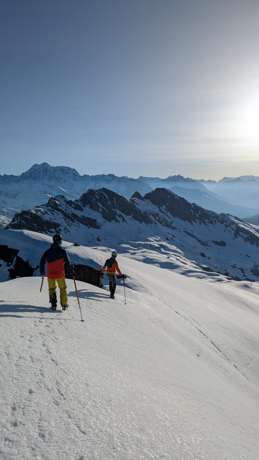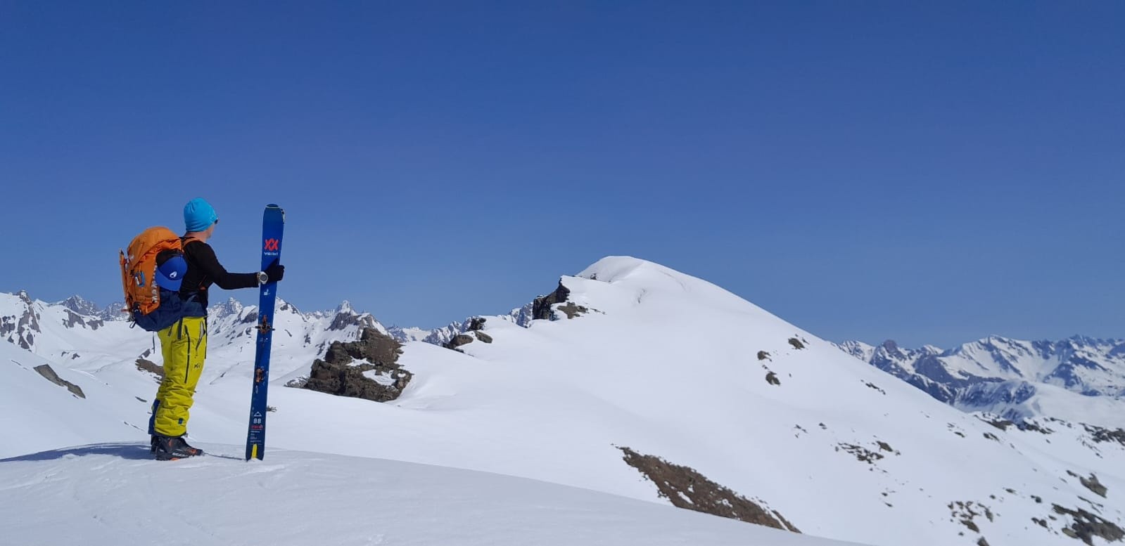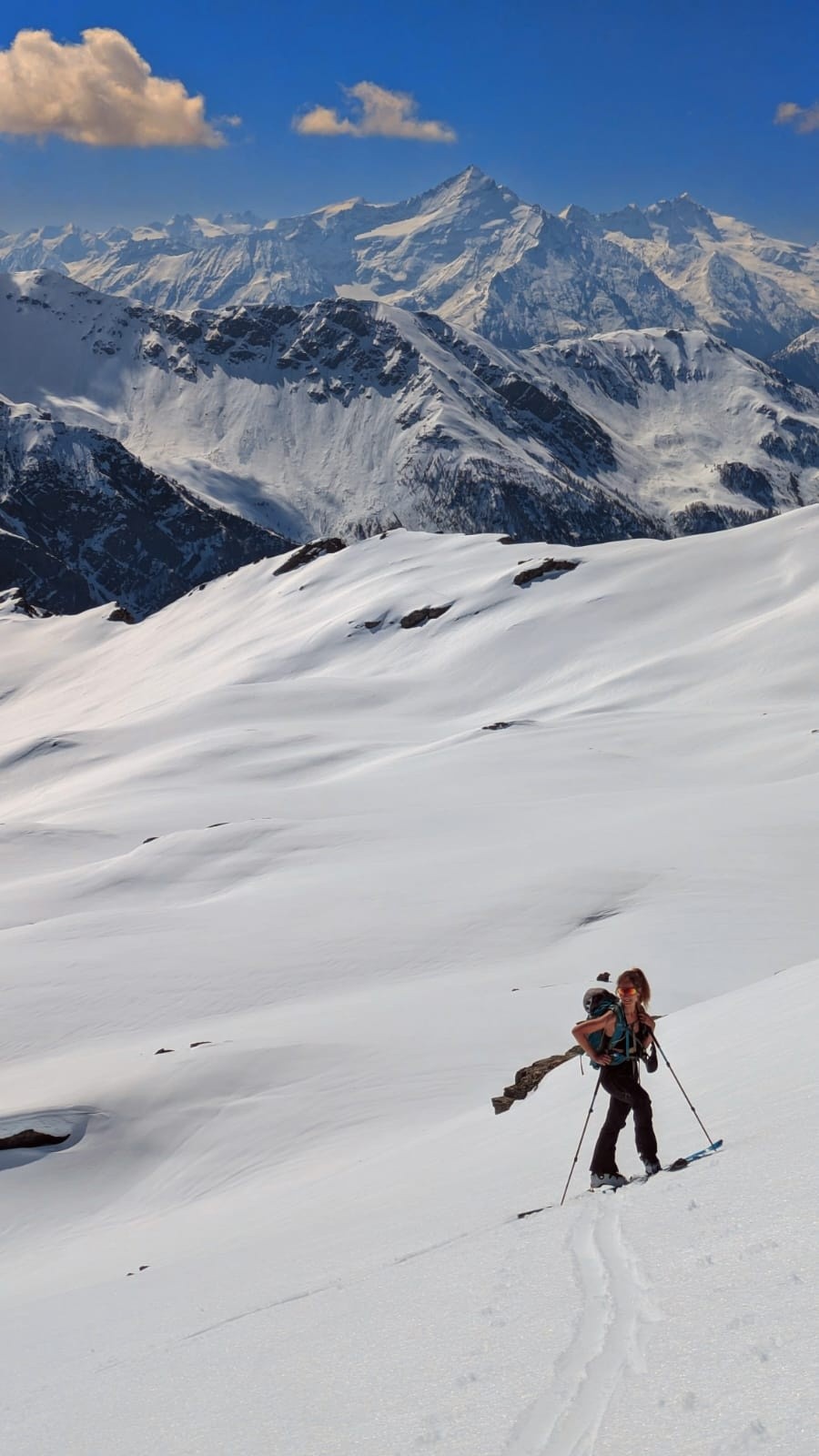 une première petite montée sur un petit sommet contrefort de la pointe de Sereina qui offre une belle pente à skier. la Lumière est juste sublime ! On se régale. Arrivés à la pointe on pousse vers une autre bosse un peu plus raide on laisse les skis . puis on redescend en direction de la pointe de Dziule la descente est bonne même si c'est pas encore décaillé. on contourne la barre rocheuse de la pointe de Dziule pour la remonter plein Est. Du sommet on redescend plein sud c'est encore meilleur, puis on revient en direction de la face Est de la teste di Fra. La ca commence à chauffer sévère ! Dans la pente finale plus raide , je veux remonter skis sur le sac mais mauvais pioche j'enfonce à mort et je m'épuise sur les 50 deniers mètres, sous le rire goguenard de mon collègue et néanmoins ami Manu. La descente est top on s'éclate. on remonte à un petit col qui nous ramène dans le vallon du bivouac sur une troisième pointe sans nom de la on se refait une belle descente plus bas que le bivouac pour profiter encore . Quand ça devient trop lourd on repeaute et on remonte au bivouac et une dernière pour la route on remonte à la tête de sereina. Le manège enchanté..