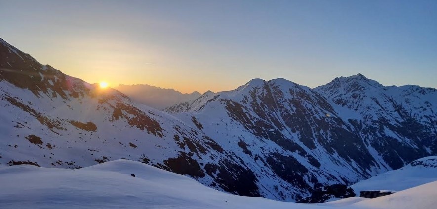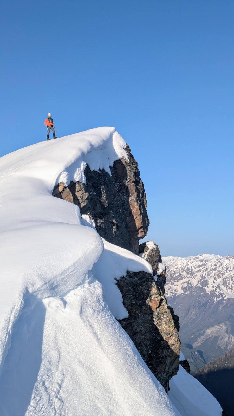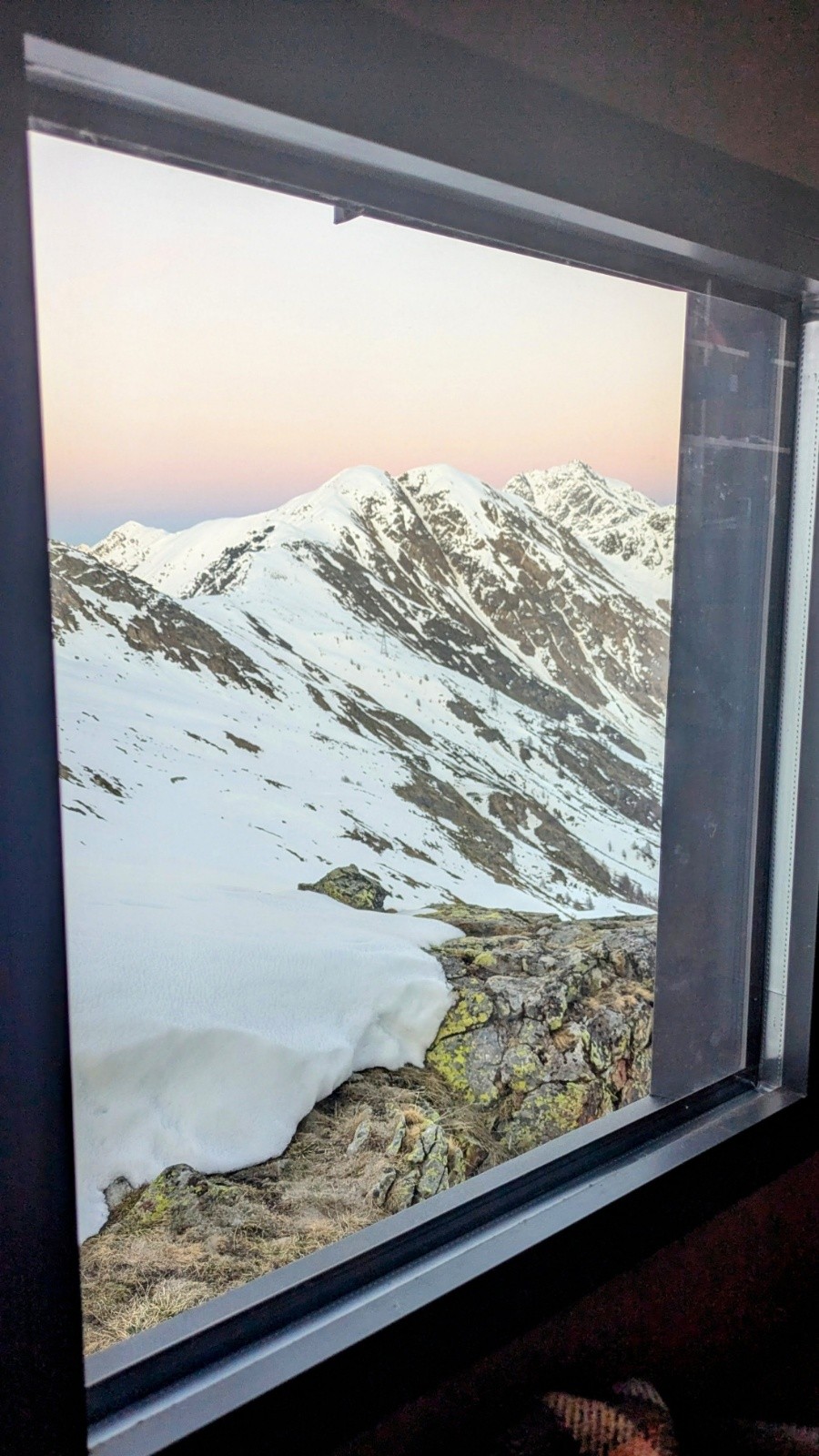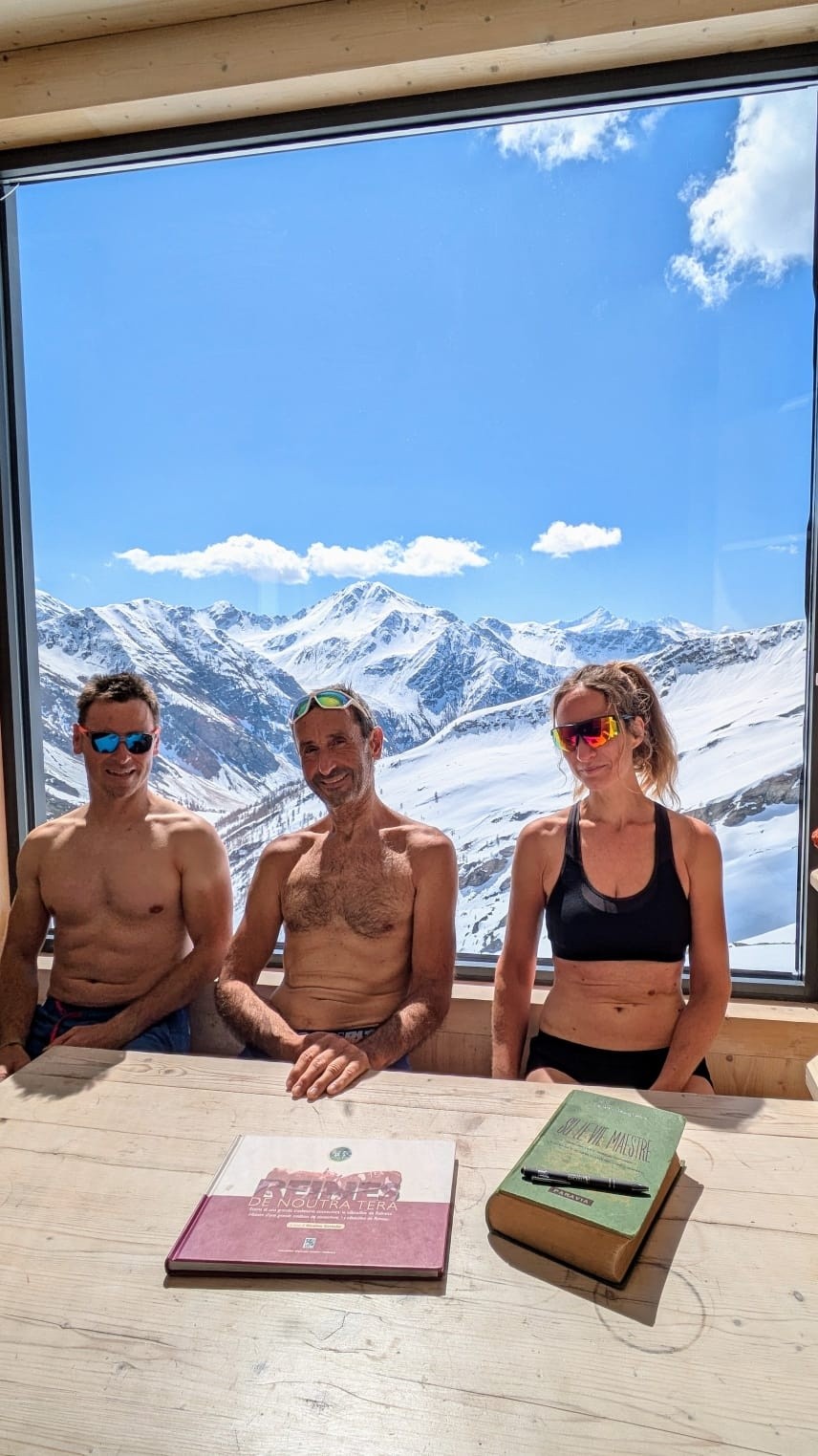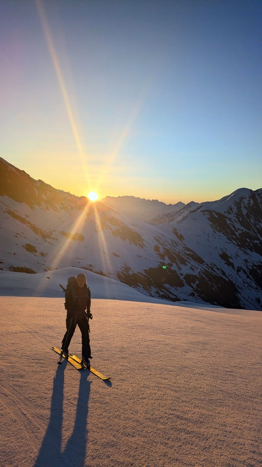 une première petite montée sur un petit sommet contrefort de la pointe de Sereina qui offre une belle pente à skier. la Lumière est juste sublime ! On se régale. Arrivés à la pointe on pousse vers une autre bosse un peu plus raide on laisse les skis . puis on redescend en direction de la pointe de Dziule la descente est bonne même si c'est pas encore décaillé. on contourne la barre rocheuse de la pointe de Dziule pour la remonter plein Est. Du sommet on redescend plein sud c'est encore meilleur, puis on revient en direction de la face Est de la teste di Fra. La ca commence à chauffer sévère ! Dans la pente finale plus raide , je veux remonter skis sur le sac mais mauvais pioche j'enfonce à mort et je m'épuise sur les 50 deniers mètres, sous le rire goguenard de mon collègue et néanmoins ami Manu. La descente est top on s'éclate. on remonte à un petit col qui nous ramène dans le vallon du bivouac sur une troisième pointe sans nom de la on se refait une belle descente plus bas que le bivouac pour profiter encore . Quand ça devient trop lourd on repeaute et on remonte au bivouac et une dernière pour la route on remonte à la tête de sereina. Le manège enchanté..