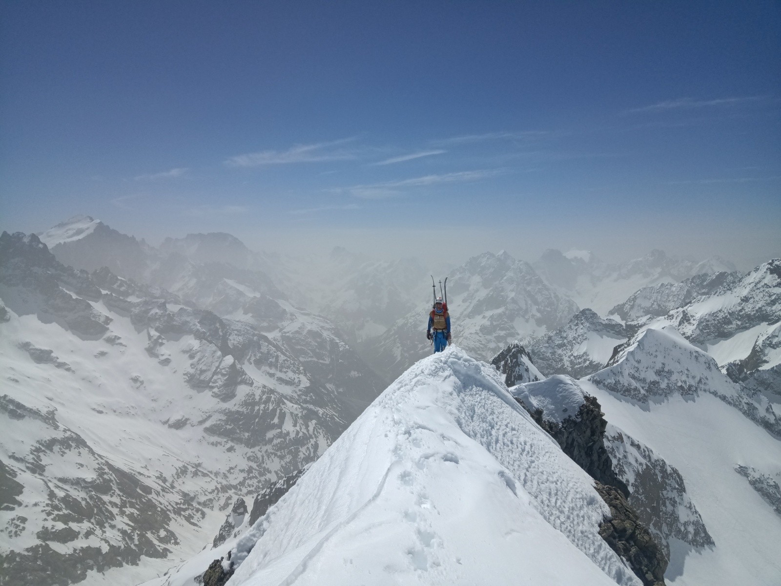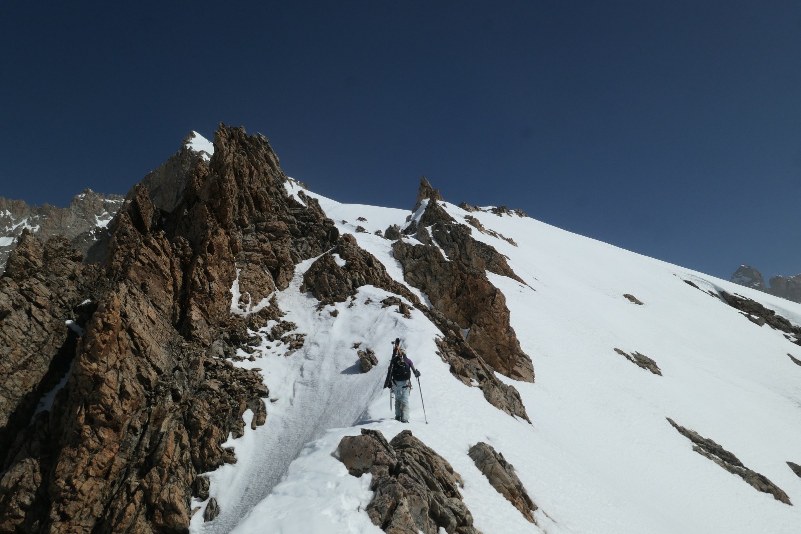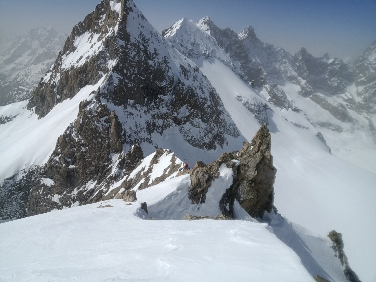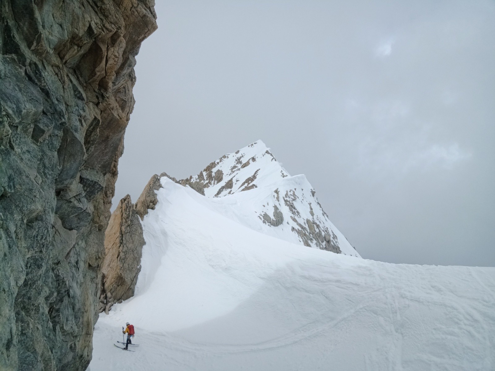 La fameuse arête commence par un passage en rocher. Le rocher a l'air plutôt bon, je m'étonne de trouver ludique cette portion expo de grimpette en crampons. Quelques passages en neige, puis de nouveau du caillou. On rejoint un replat et là la suite semble plus teigneuse. L'arête est bien effilée en rocher puis en neige, Emeric passe devant attaquer la section, c'est aérien on est bien concentrés mais ça passe. Ensuite on hésite à poursuivre dans la neige ou continuer sur l'arête rocheuse. La neige étant pourrie proche des rochers on préférera l'arête plus safe. Replat suivant, un belle pente de neige pas trop raide, on en profite pour repasser à ski remonter la moquette. Une section plus raide pour arriver à l'antécime à 3600m. Quand je pense pouvoir repasser à ski je vois Emeric passer à pied. Oula, c'est quoi la suite? Au menu du midi (car il est environ midi) on nous propose une espèce de double corniche la première plonge à gauche, la seconde à droite. Hum appétissant, je file voir ça ! Encore un truc pas mal expo pas mal aérien, bon si je mets les pieds d'un côté de l'arrête et les piolets de l'autre normalement j'irai pas bien loin, ça passe. De l'autre côté de la double corniche, je vois pas encore bien mais ça a pas l'air si débonnaire. Une traversée encore un peu expo mais en bonne neige. Emeric me rejoint et me dit, c'est pas raide ni expo, ça va. Ah ben si tu maîtrises je te laisse aller voir! Après ce dernier passage un peu engagé on finit gentiment à ski jusqu'au sommet sur des pentes bien plus débonnaires. On trouve même une trace de montée, la lameuse trace qu'on pensait trouver sur l'arête mais qui partait en fait de la face SW.