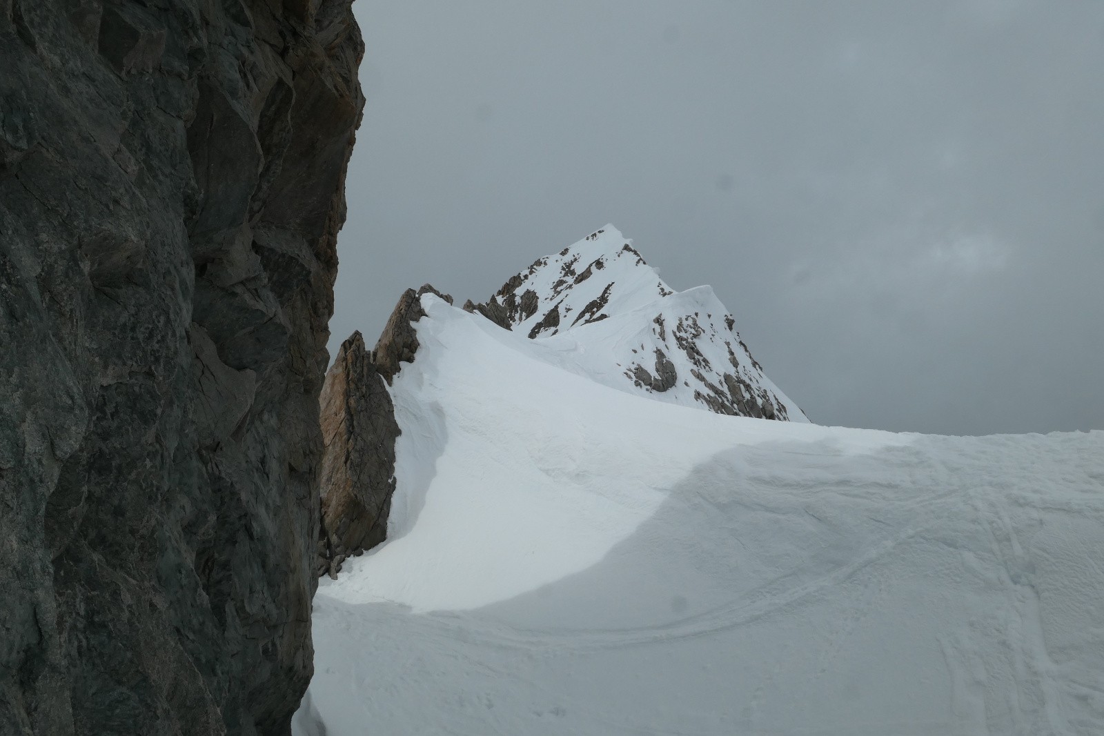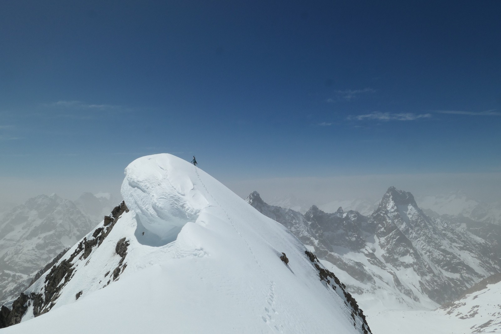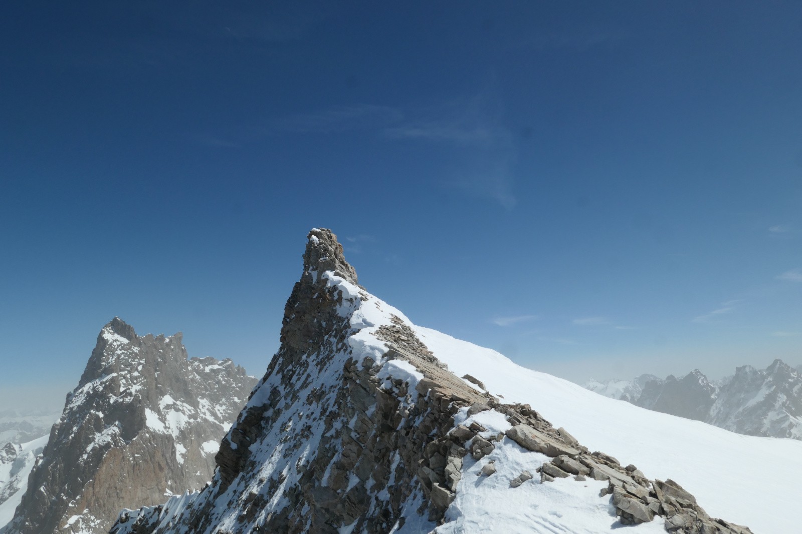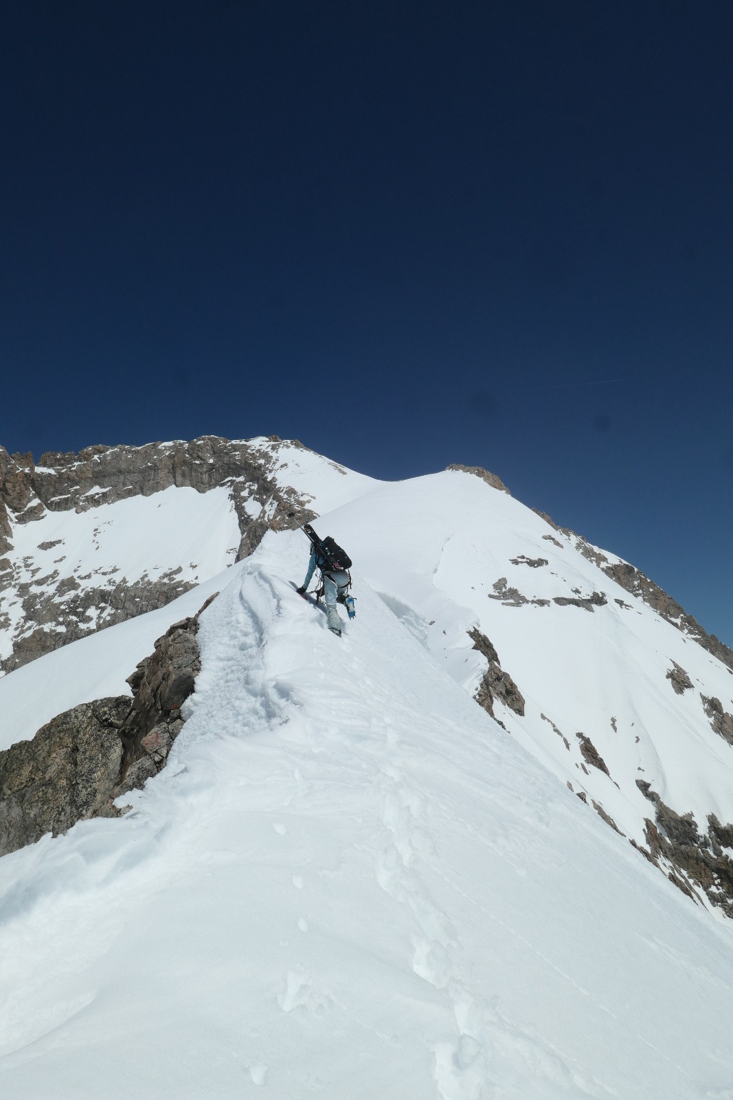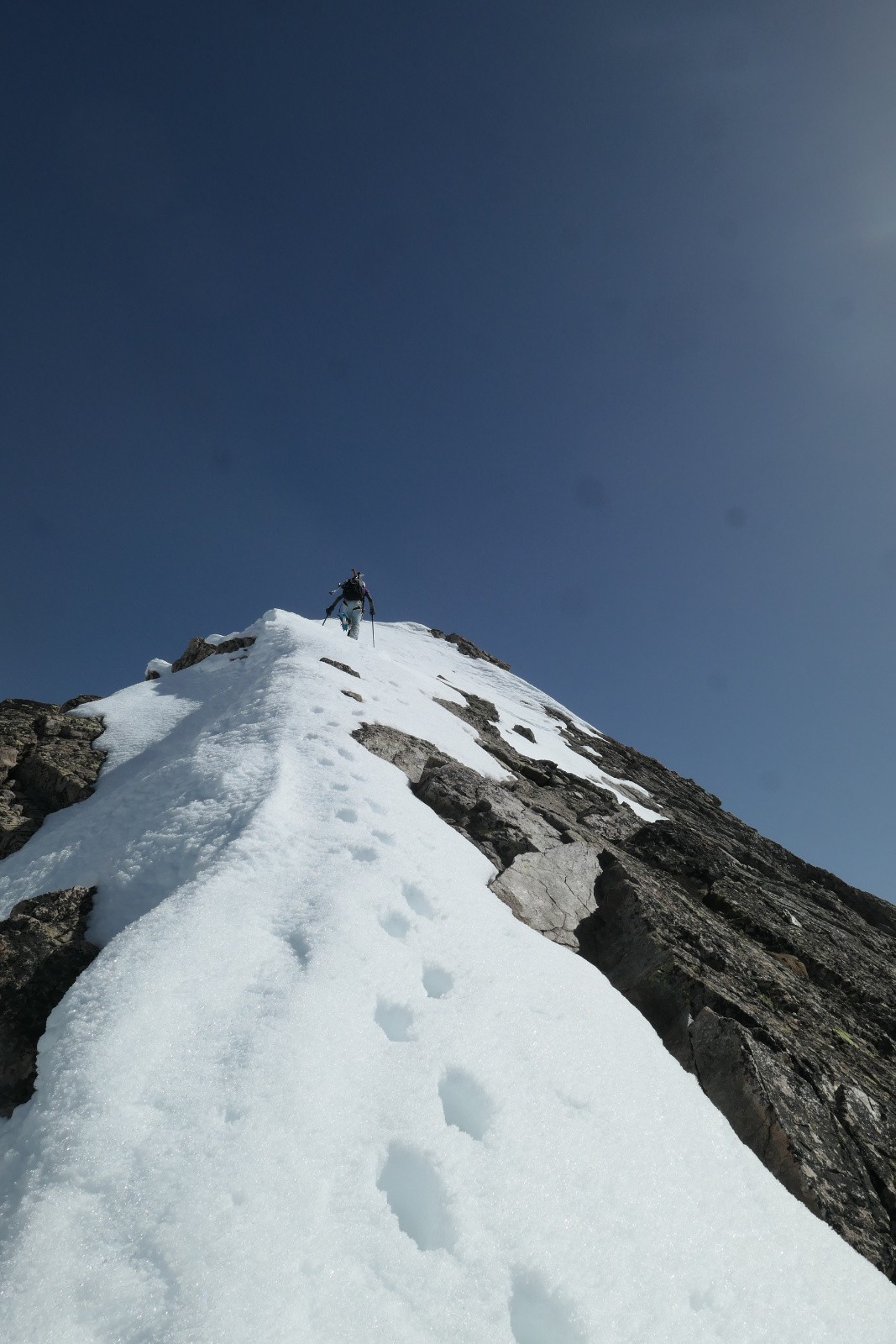 La fameuse arête commence par un passage en rocher. Le rocher a l'air plutôt bon, je m'étonne de trouver ludique cette portion expo de grimpette en crampons. Quelques passages en neige, puis de nouveau du caillou. On rejoint un replat et là la suite semble plus teigneuse. L'arête est bien effilée en rocher puis en neige, Emeric passe devant attaquer la section, c'est aérien on est bien concentrés mais ça passe. Ensuite on hésite à poursuivre dans la neige ou continuer sur l'arête rocheuse. La neige étant pourrie proche des rochers on préférera l'arête plus safe. Replat suivant, un belle pente de neige pas trop raide, on en profite pour repasser à ski remonter la moquette. Une section plus raide pour arriver à l'antécime à 3600m. Quand je pense pouvoir repasser à ski je vois Emeric passer à pied. Oula, c'est quoi la suite? Au menu du midi (car il est environ midi) on nous propose une espèce de double corniche la première plonge à gauche, la seconde à droite. Hum appétissant, je file voir ça ! Encore un truc pas mal expo pas mal aérien, bon si je mets les pieds d'un côté de l'arrête et les piolets de l'autre normalement j'irai pas bien loin, ça passe. De l'autre côté de la double corniche, je vois pas encore bien mais ça a pas l'air si débonnaire. Une traversée encore un peu expo mais en bonne neige. Emeric me rejoint et me dit, c'est pas raide ni expo, ça va. Ah ben si tu maîtrises je te laisse aller voir! Après ce dernier passage un peu engagé on finit gentiment à ski jusqu'au sommet sur des pentes bien plus débonnaires. On trouve même une trace de montée, la lameuse trace qu'on pensait trouver sur l'arête mais qui partait en fait de la face SW.