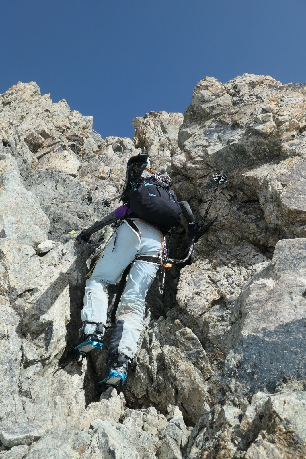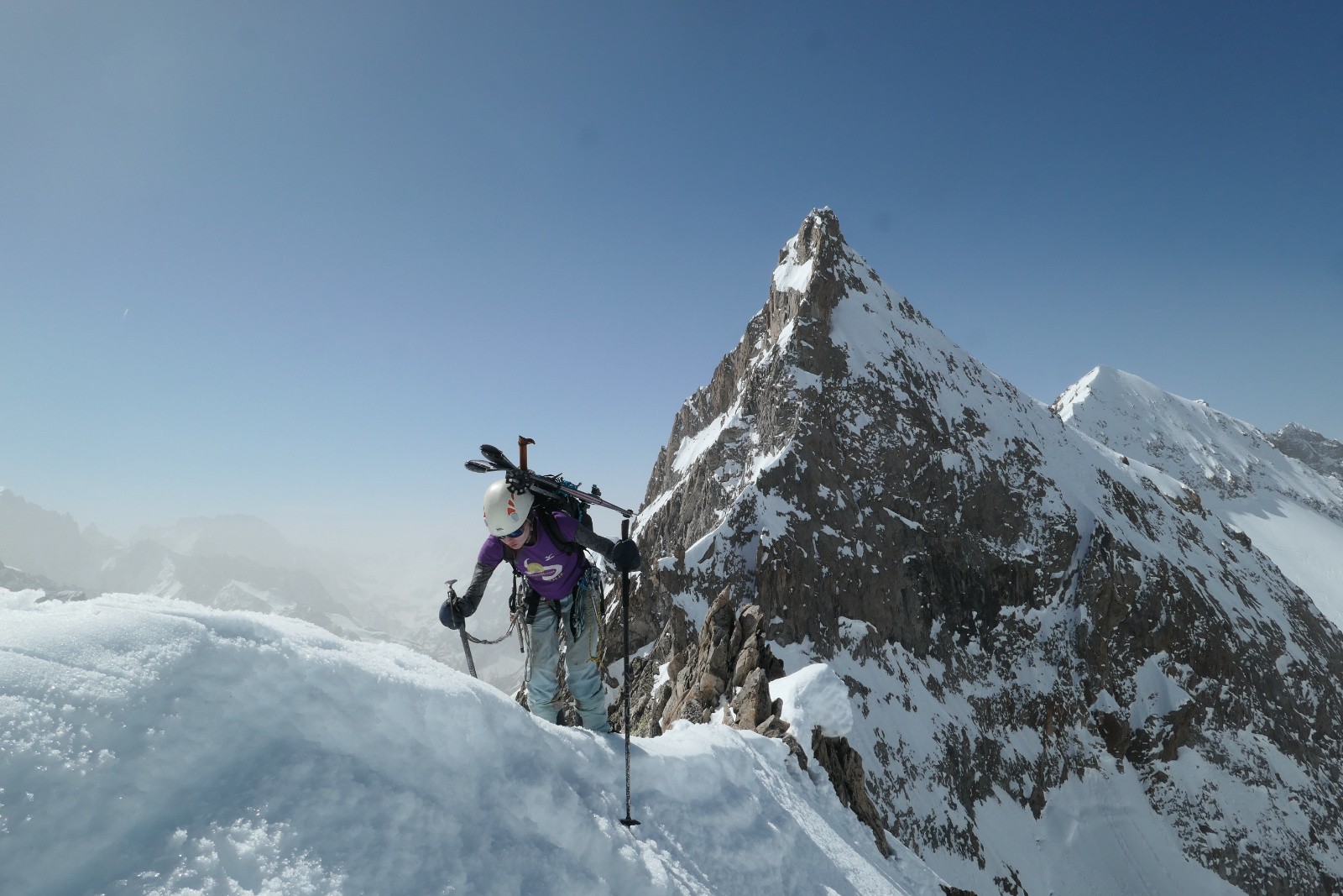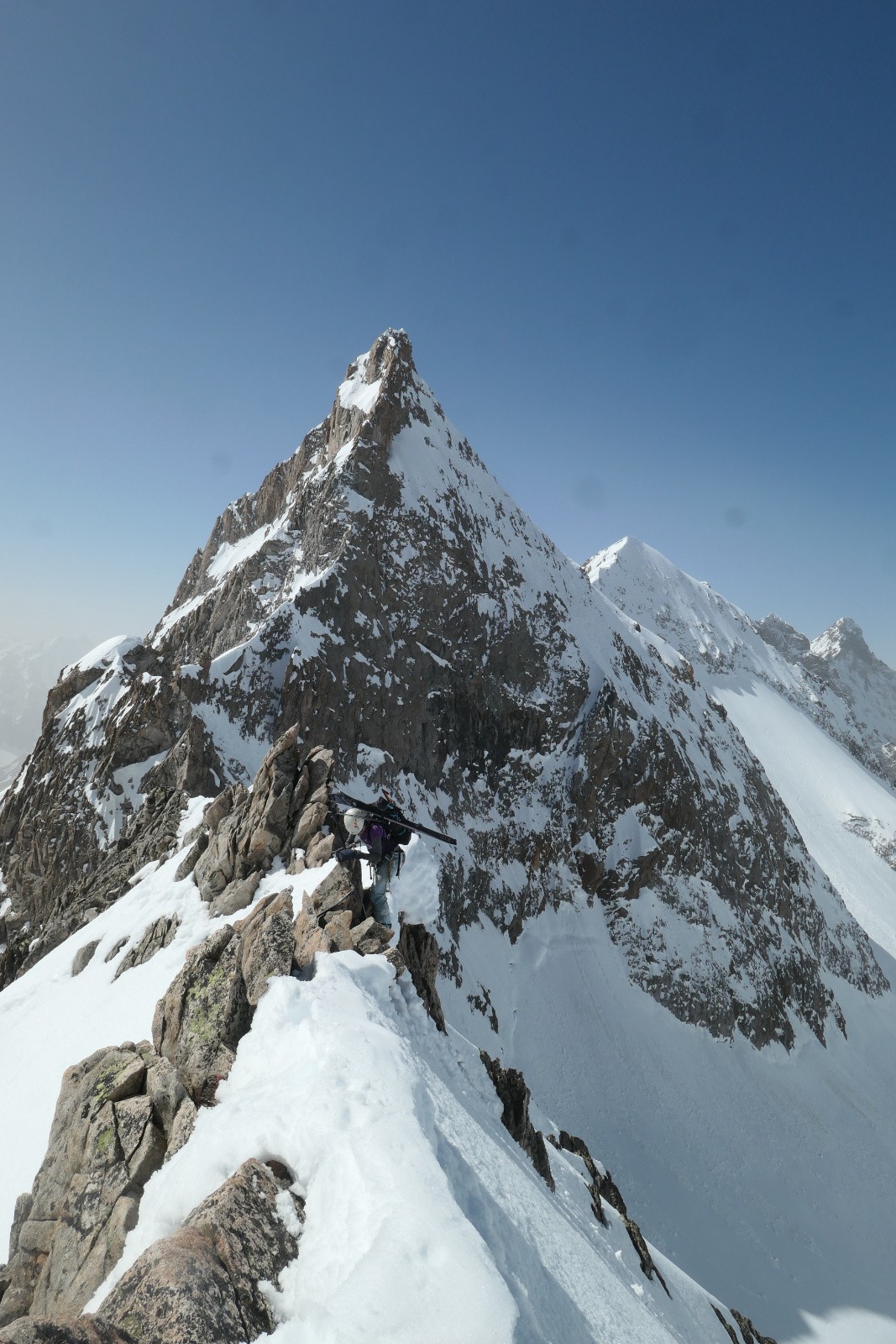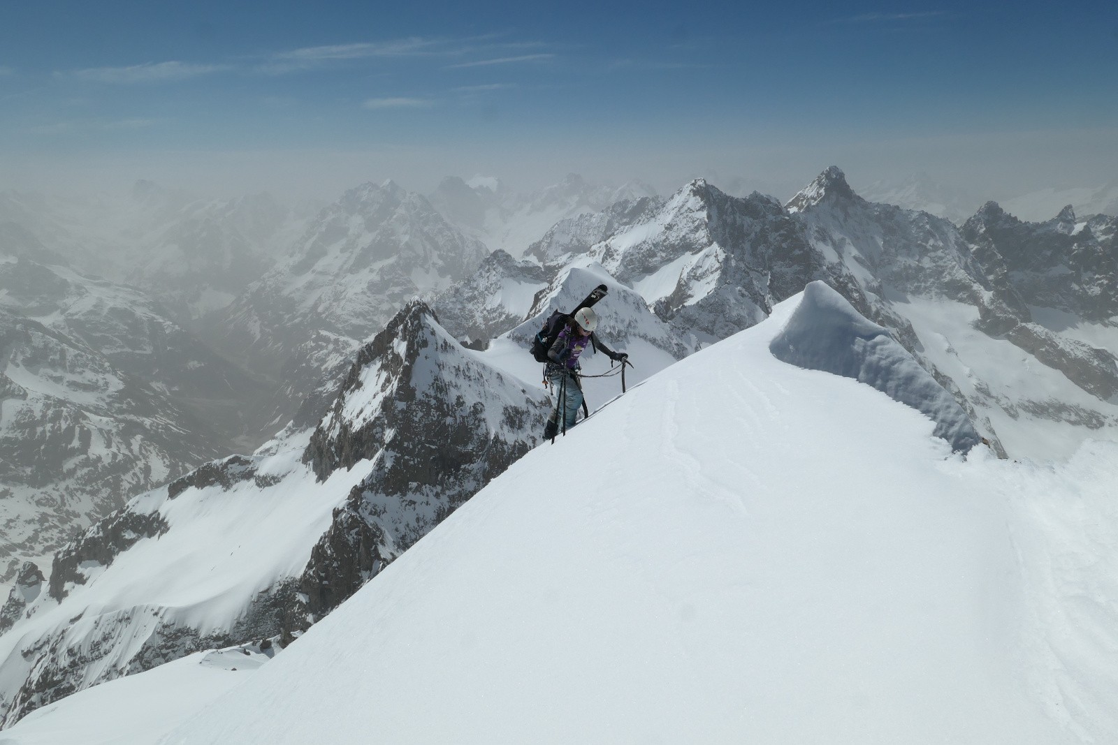 La fameuse arête commence par un passage en rocher. Le rocher a l'air plutôt bon, je m'étonne de trouver ludique cette portion expo de grimpette en crampons. Quelques passages en neige, puis de nouveau du caillou. On rejoint un replat et là la suite semble plus teigneuse. L'arête est bien effilée en rocher puis en neige, Emeric passe devant attaquer la section, c'est aérien on est bien concentrés mais ça passe. Ensuite on hésite à poursuivre dans la neige ou continuer sur l'arête rocheuse. La neige étant pourrie proche des rochers on préférera l'arête plus safe. Replat suivant, un belle pente de neige pas trop raide, on en profite pour repasser à ski remonter la moquette. Une section plus raide pour arriver à l'antécime à 3600m. Quand je pense pouvoir repasser à ski je vois Emeric passer à pied. Oula, c'est quoi la suite? Au menu du midi (car il est environ midi) on nous propose une espèce de double corniche la première plonge à gauche, la seconde à droite. Hum appétissant, je file voir ça ! Encore un truc pas mal expo pas mal aérien, bon si je mets les pieds d'un côté de l'arrête et les piolets de l'autre normalement j'irai pas bien loin, ça passe. De l'autre côté de la double corniche, je vois pas encore bien mais ça a pas l'air si débonnaire. Une traversée encore un peu expo mais en bonne neige. Emeric me rejoint et me dit, c'est pas raide ni expo, ça va. Ah ben si tu maîtrises je te laisse aller voir! Après ce dernier passage un peu engagé on finit gentiment à ski jusqu'au sommet sur des pentes bien plus débonnaires. On trouve même une trace de montée, la lameuse trace qu'on pensait trouver sur l'arête mais qui partait en fait de la face SW.