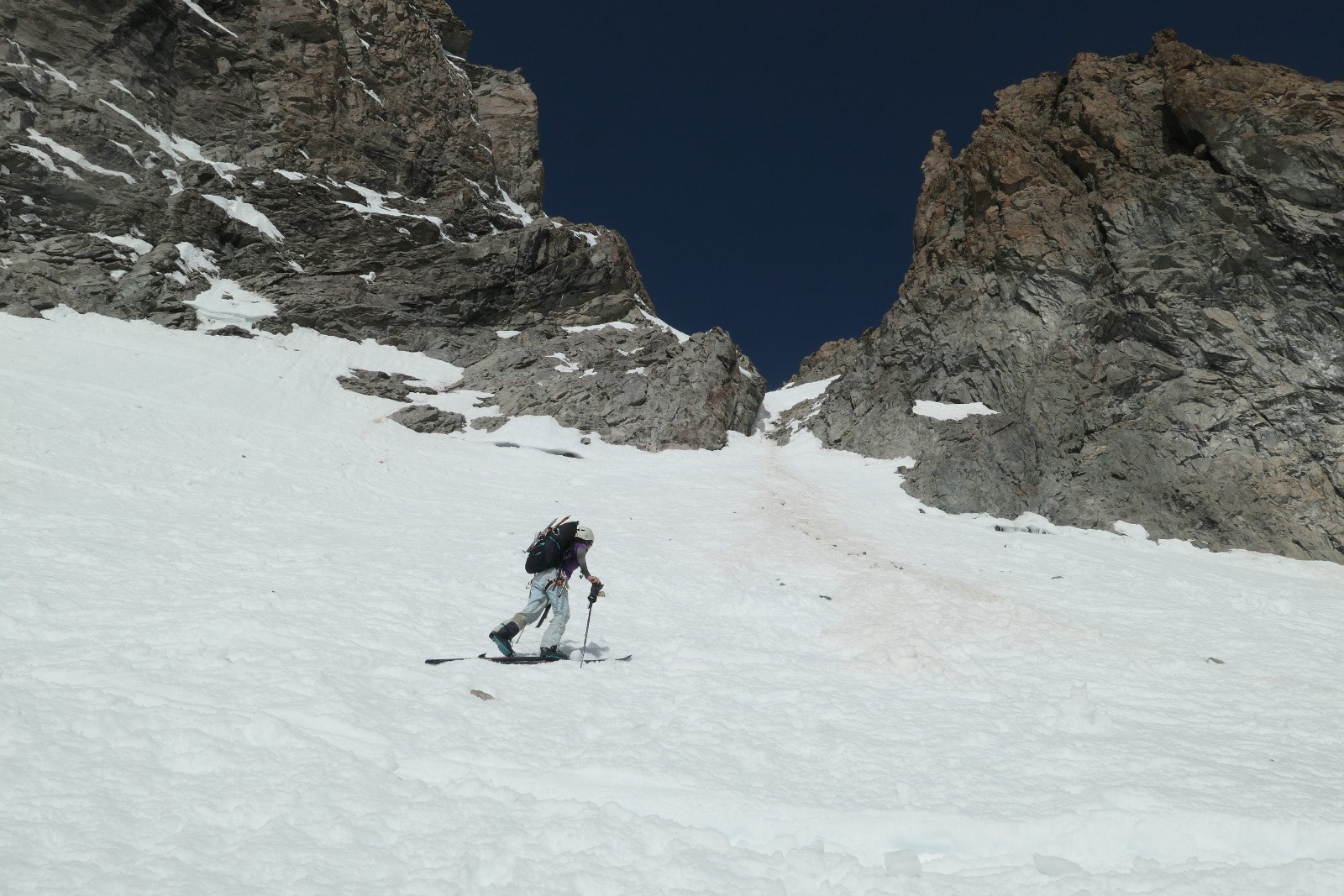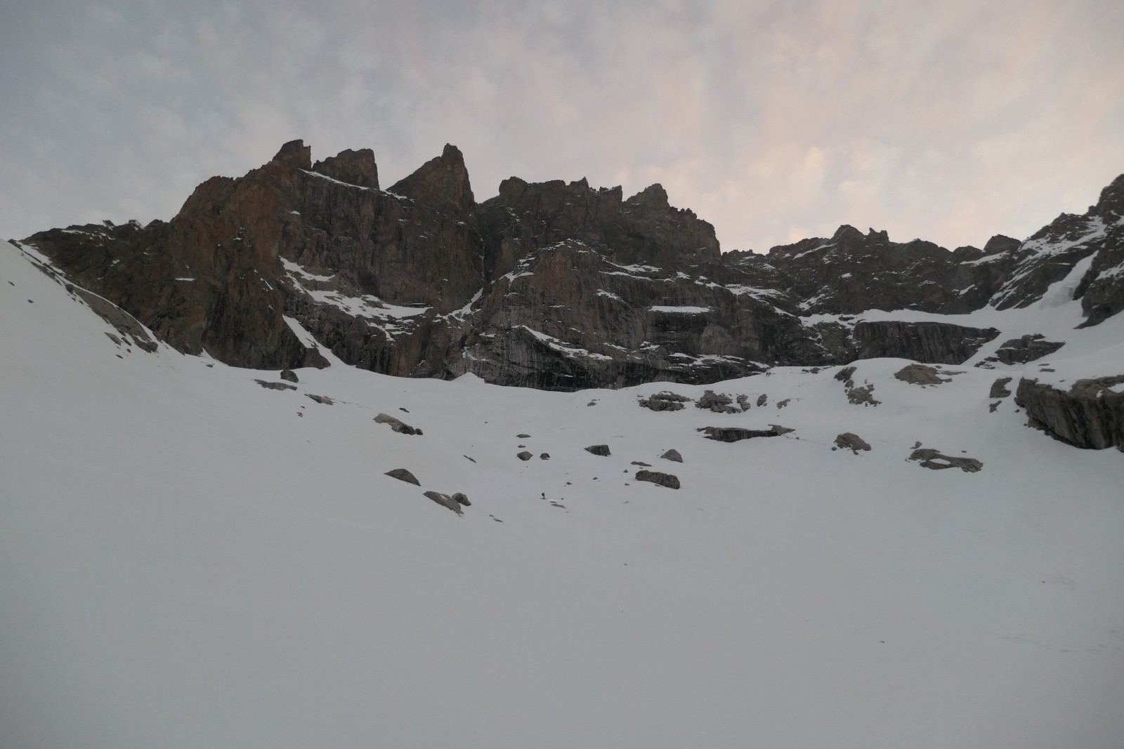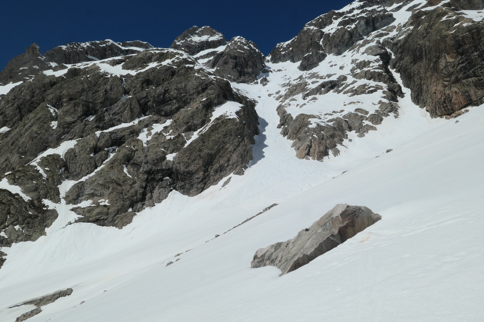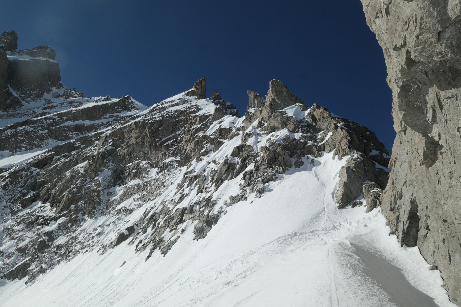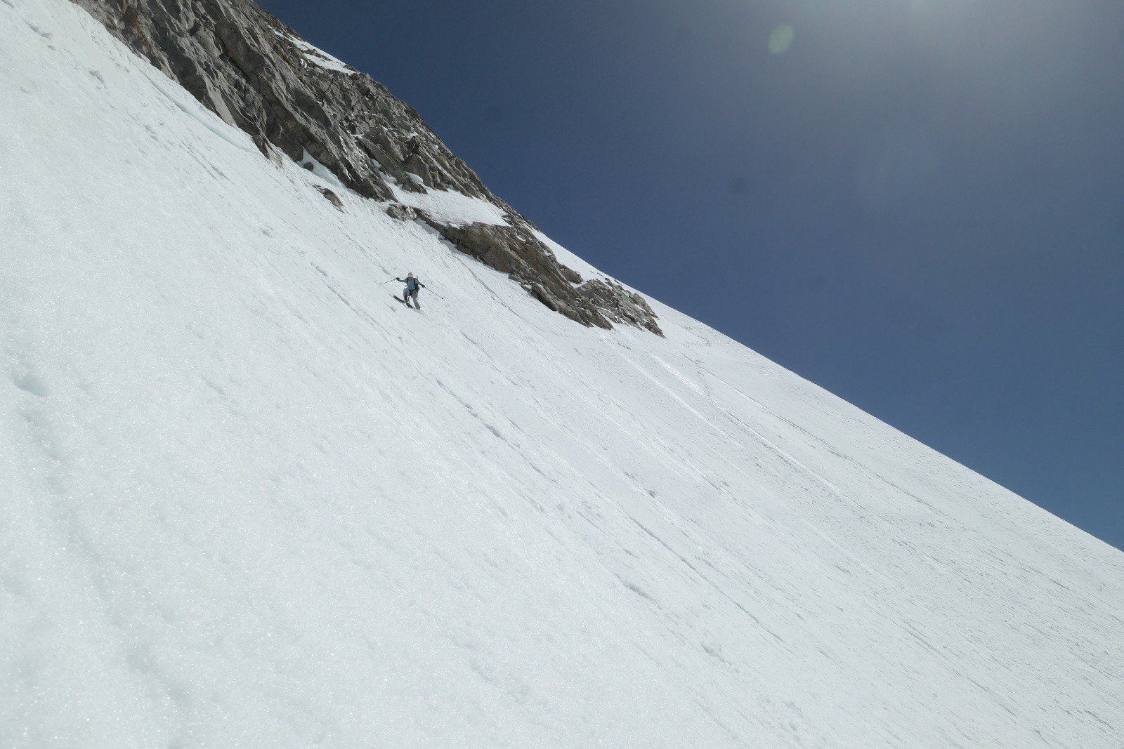 Première difficulté, la gestion de l'horaire : on veut passer la brèche E assez tôt que éviter la surchauffe de la neige et les chutes de pierre. Mais pas trop tôt non plus car on descend SW. La longue traversée d'arête pas si évidente nous aura finalement largement occupé le temps du décaillage!