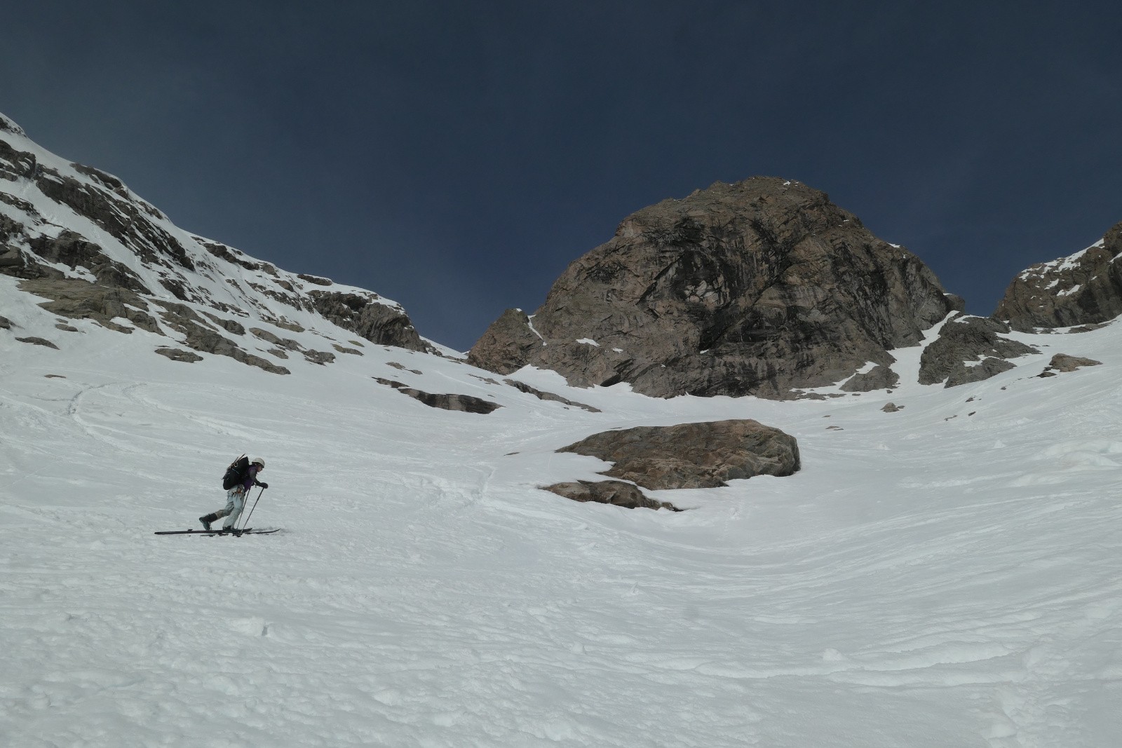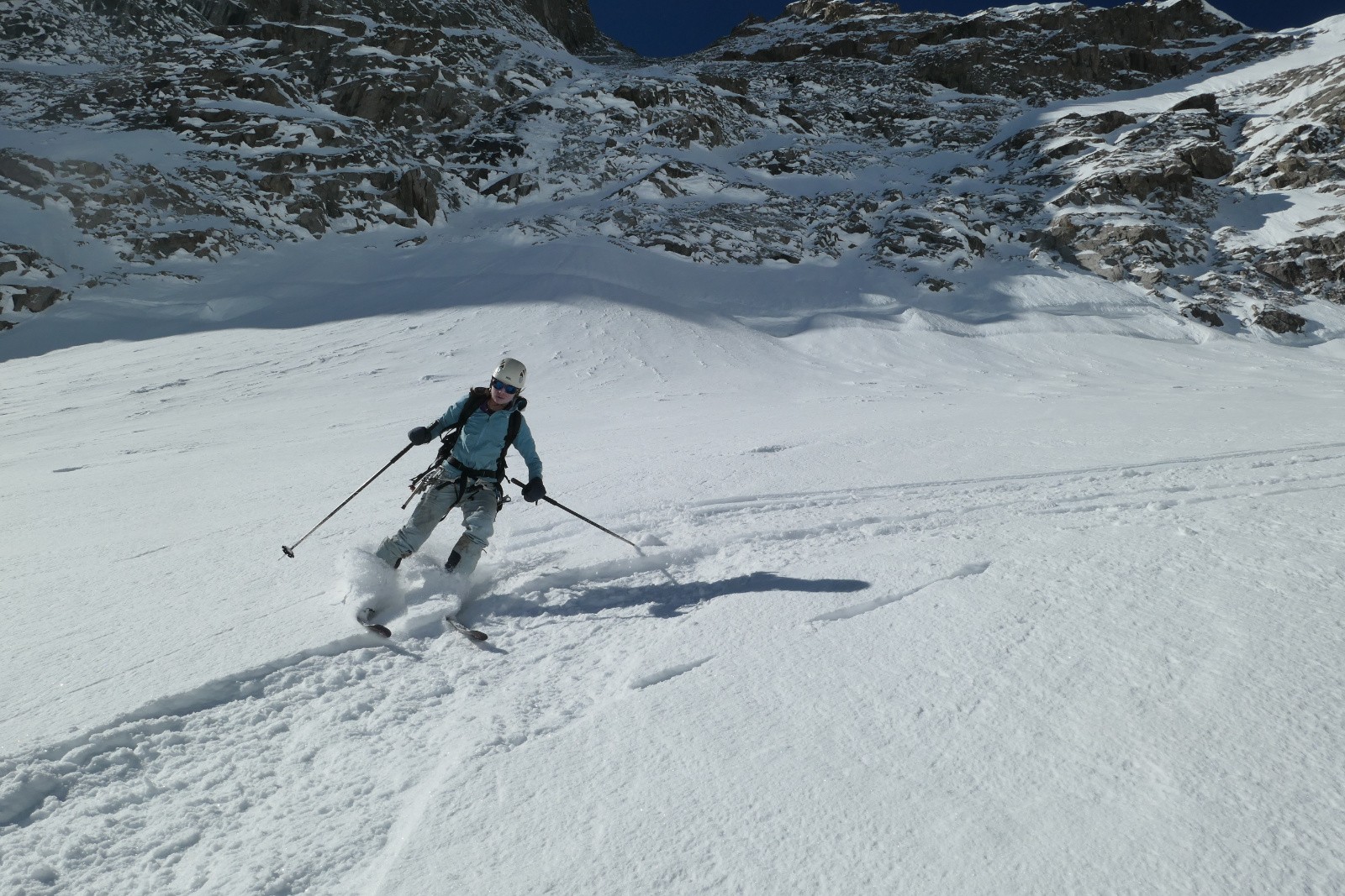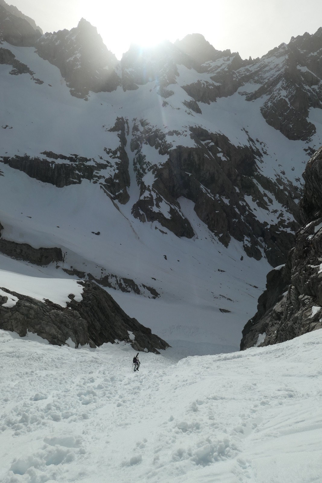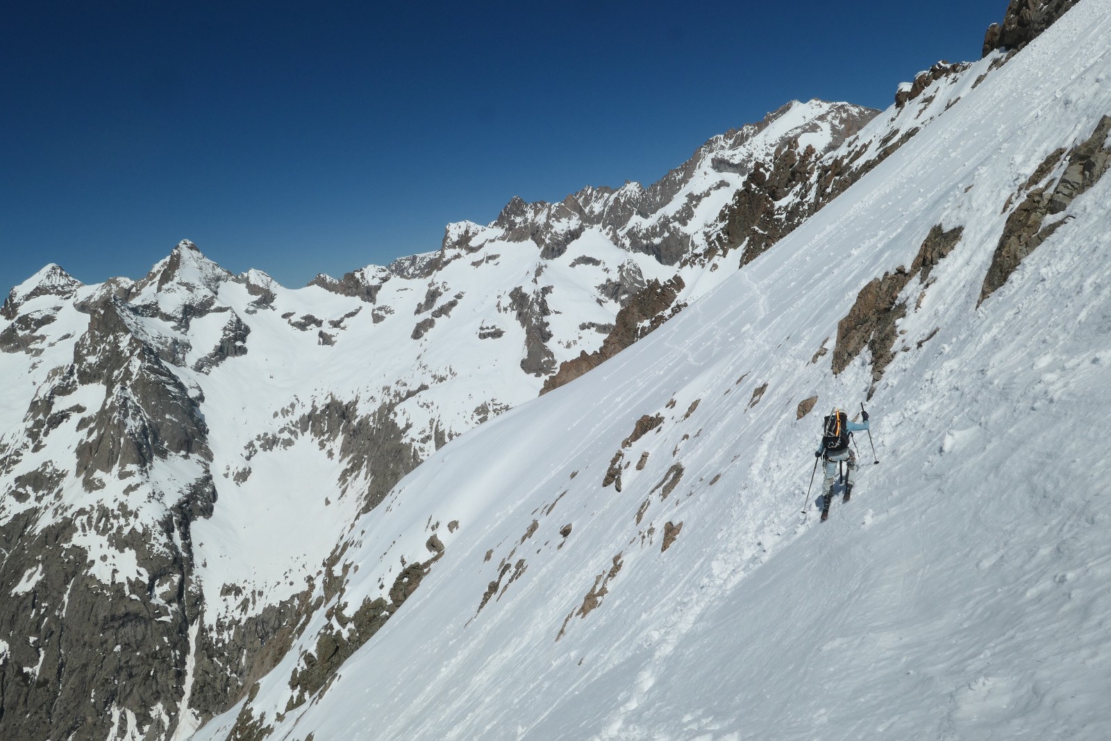 Jeudi 5h30 nous partons en direction du Col de la Grande Ruine. On connait déjà le col du Pavé et le Clos des Cavales, c'est l'occasion de découvrir une autre option. On passe sous le fameux Pic Maître, c'est vrai que la face est impressionnante. Le détour étant un peu long, on poursuit sagement vers le col ! La montée est jolie et assez efficace, 9h30 nous y voilà déjà. Clairement trop tôt pour descendre en SW, on opte donc pour une première descente en est en allégeant un peu les sacs au col. Bonne poudreuse et transfo, du ski bien sympa.