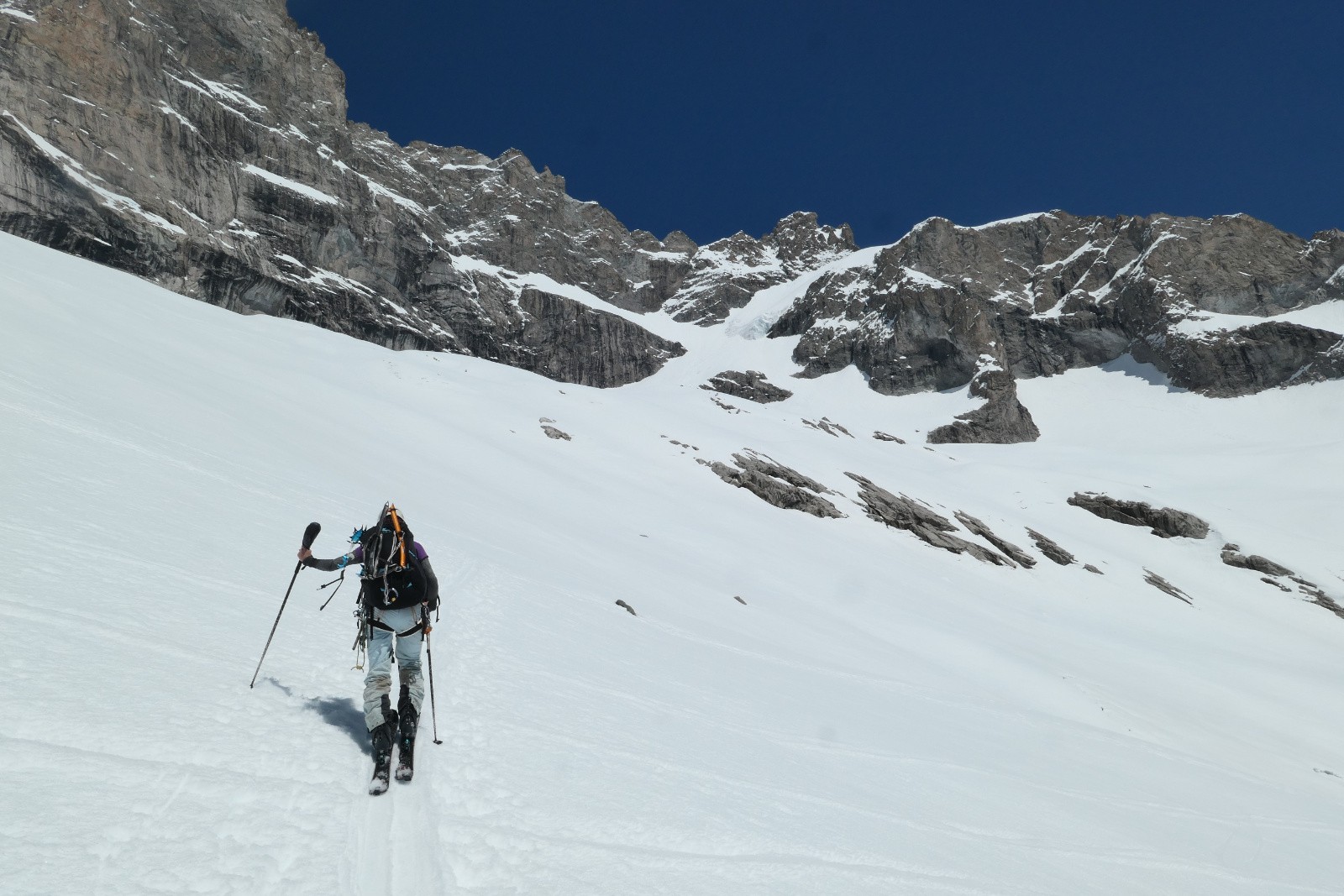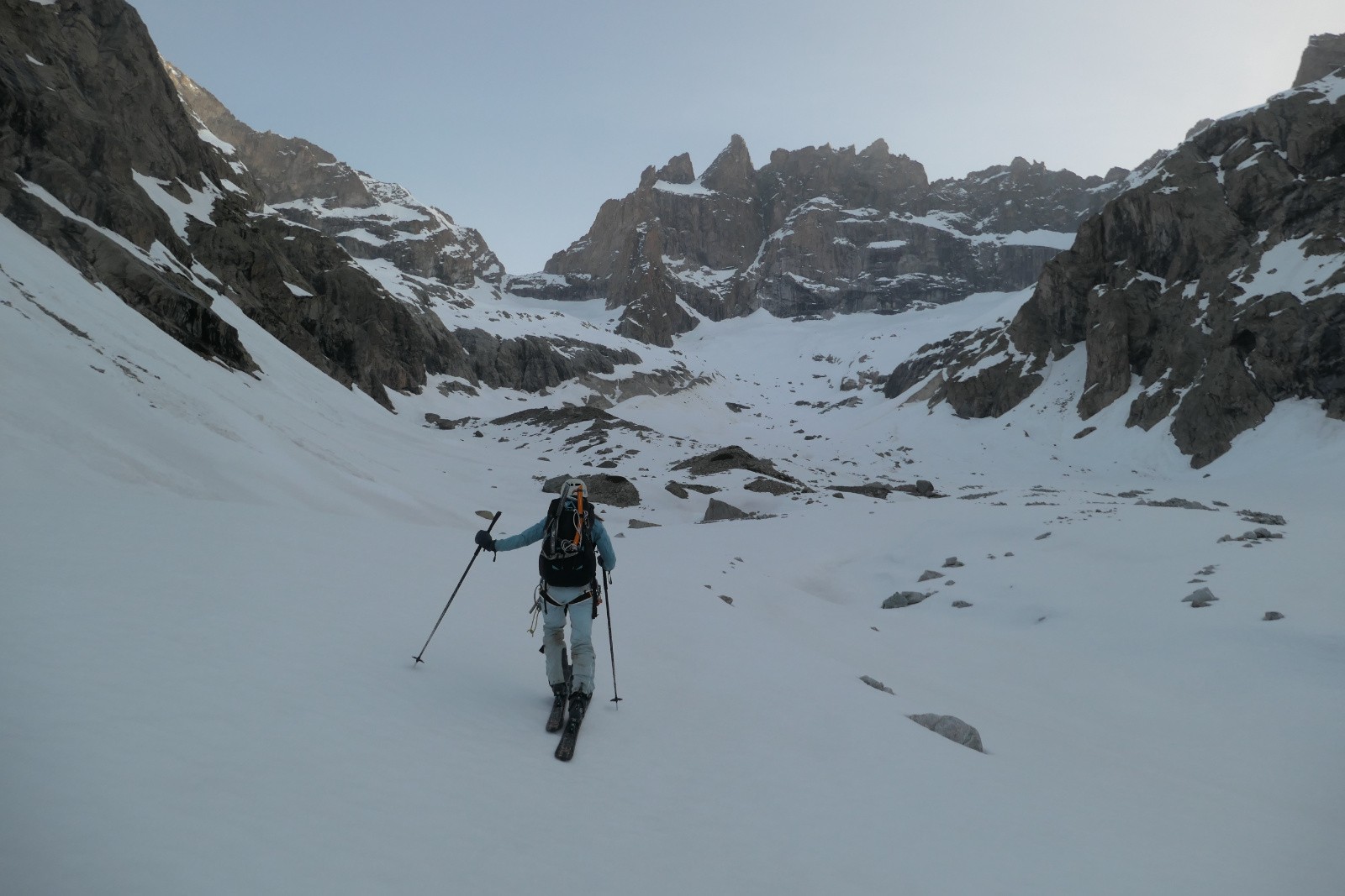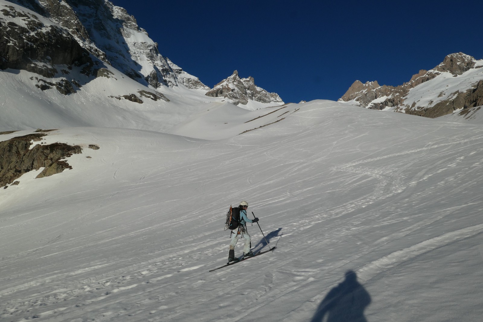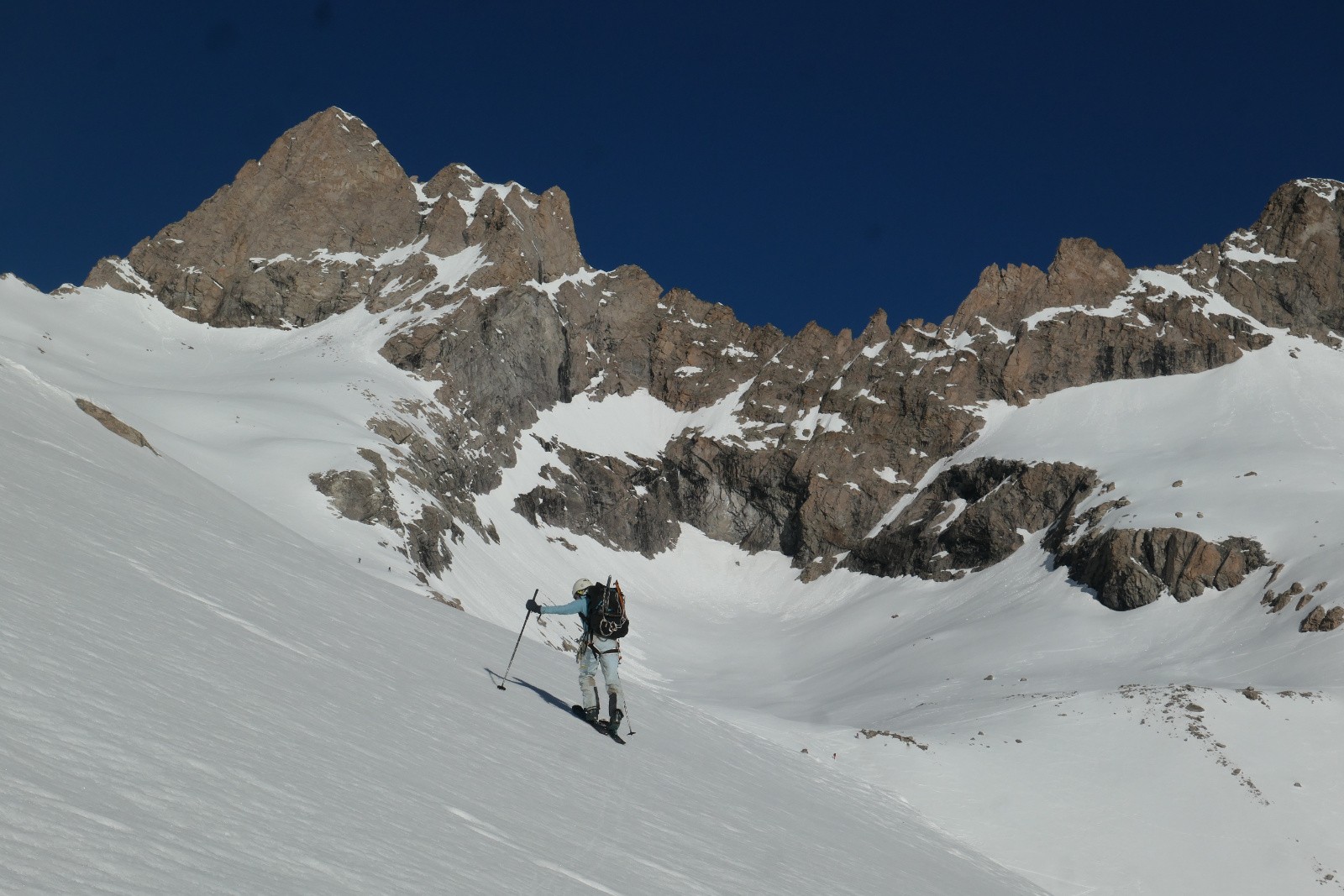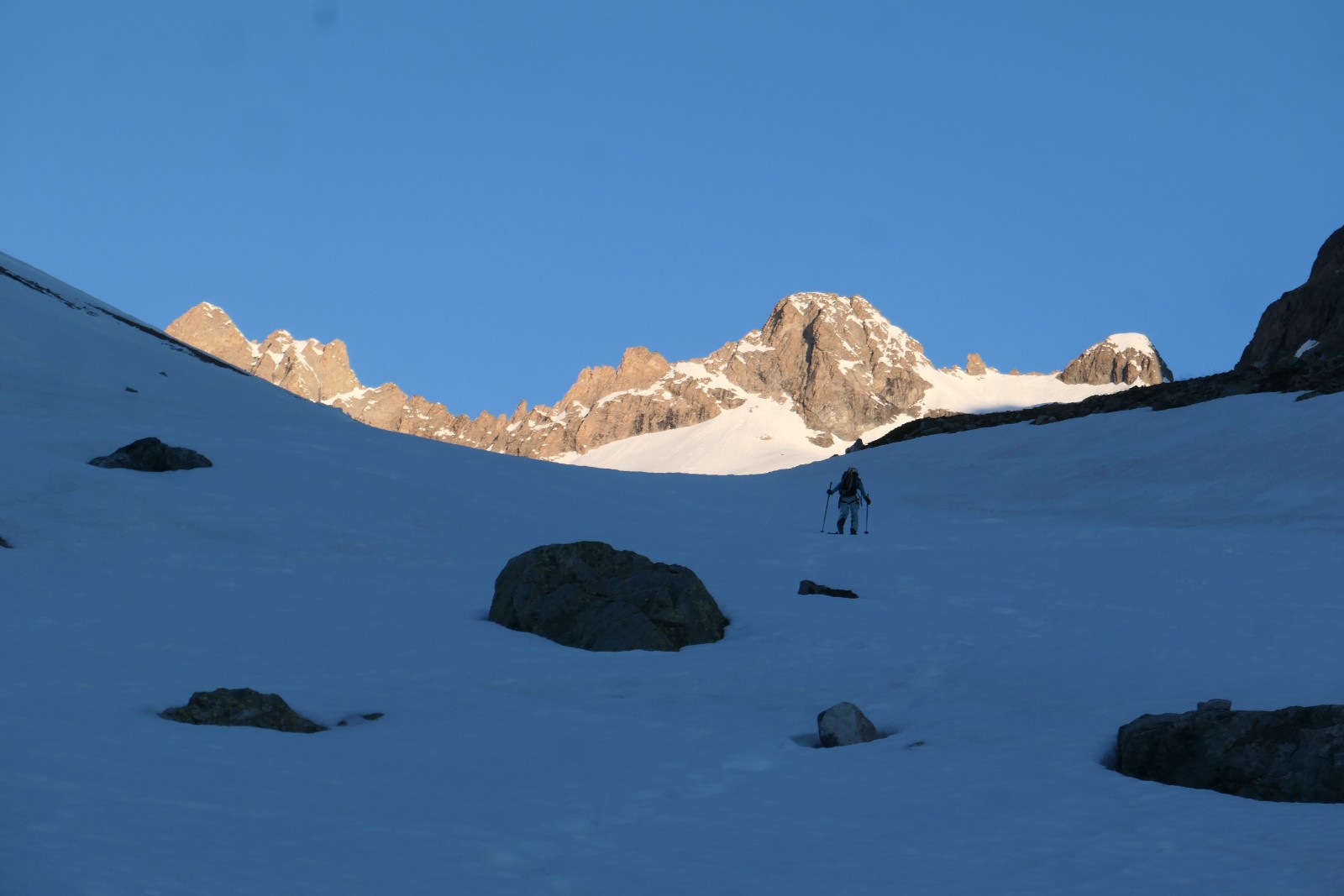 Jeudi 5h30 nous partons en direction du Col de la Grande Ruine. On connait déjà le col du Pavé et le Clos des Cavales, c'est l'occasion de découvrir une autre option. On passe sous le fameux Pic Maître, c'est vrai que la face est impressionnante. Le détour étant un peu long, on poursuit sagement vers le col ! La montée est jolie et assez efficace, 9h30 nous y voilà déjà. Clairement trop tôt pour descendre en SW, on opte donc pour une première descente en est en allégeant un peu les sacs au col. Bonne poudreuse et transfo, du ski bien sympa.