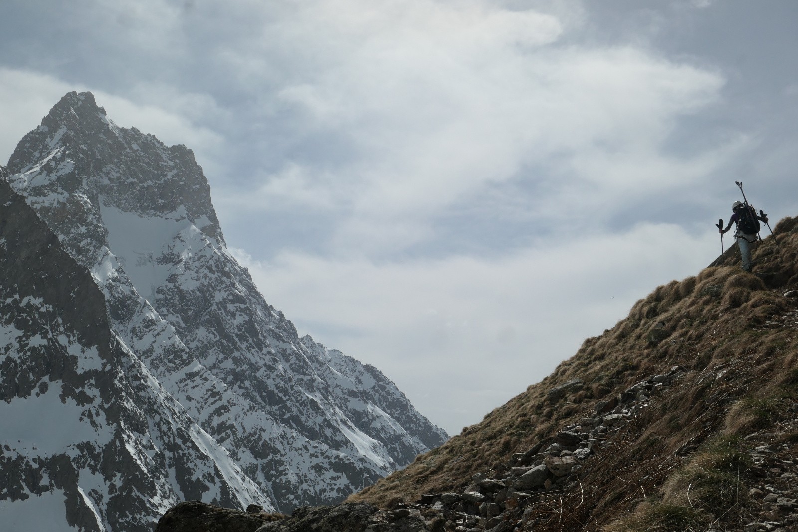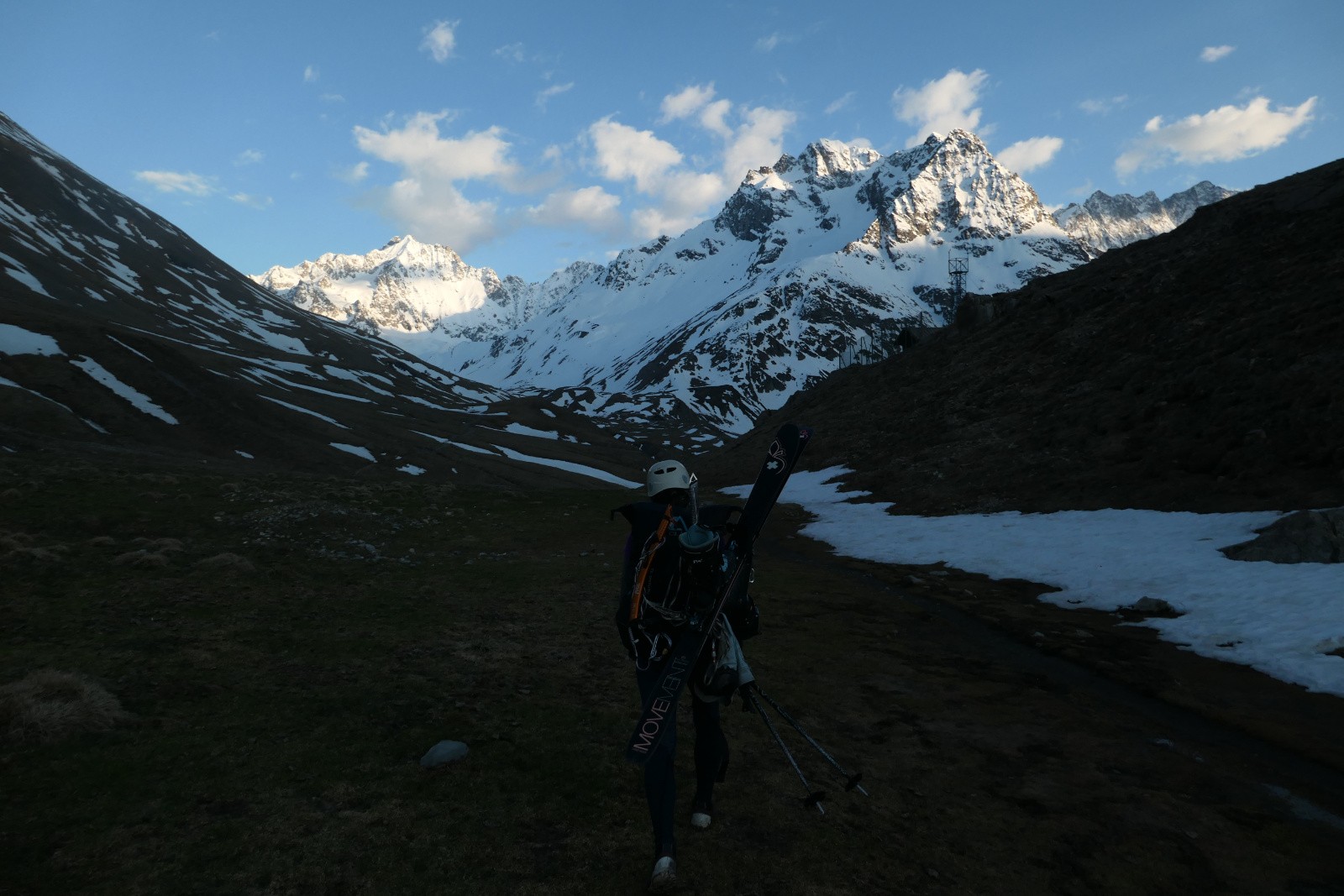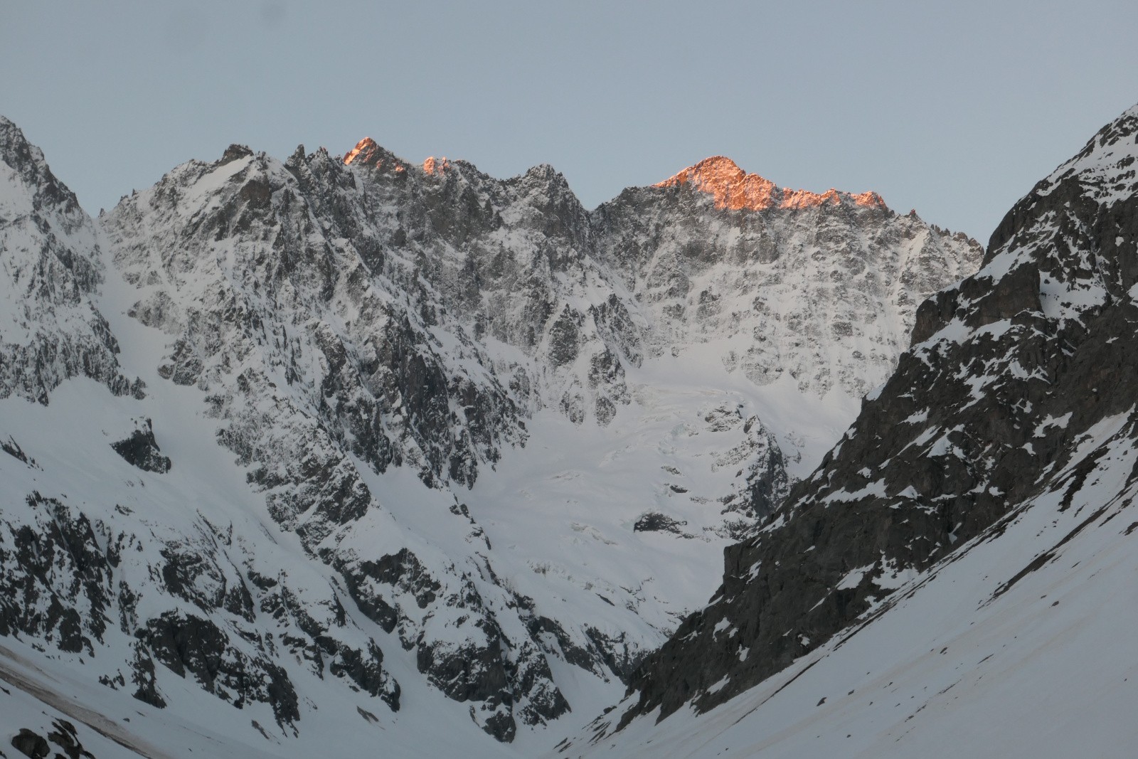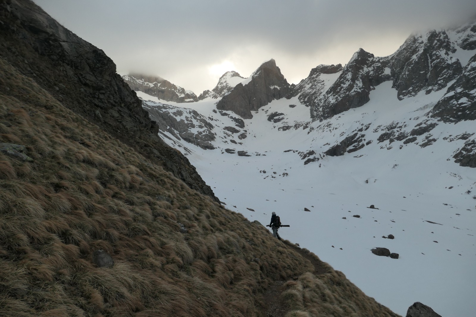 Jeudi 5h30 nous partons en direction du Col de la Grande Ruine. On connait déjà le col du Pavé et le Clos des Cavales, c'est l'occasion de découvrir une autre option. On passe sous le fameux Pic Maître, c'est vrai que la face est impressionnante. Le détour étant un peu long, on poursuit sagement vers le col ! La montée est jolie et assez efficace, 9h30 nous y voilà déjà. Clairement trop tôt pour descendre en SW, on opte donc pour une première descente en est en allégeant un peu les sacs au col. Bonne poudreuse et transfo, du ski bien sympa.