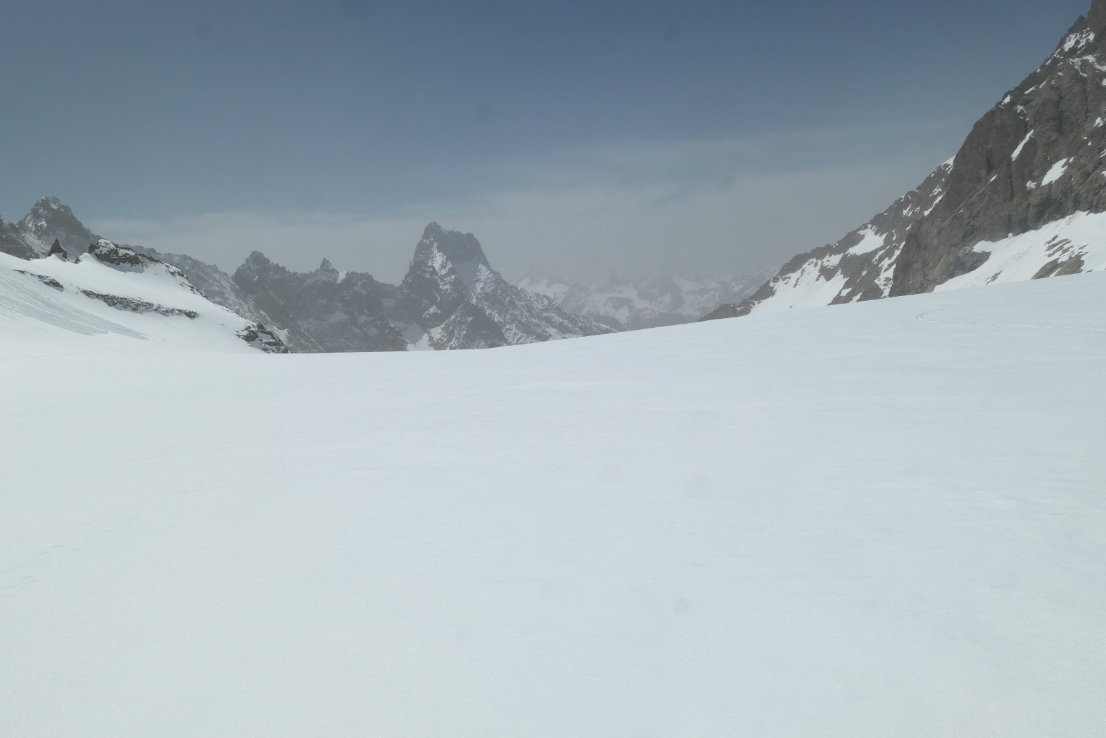 De nouveau au col à 11h ça nous paraît être le bon horaire. On traverse au dessus des barres puis on remonte un peu la pente SW qui commence juste à décailler. On stoppe vers 3300m, au-dessus c'est en boulettes.