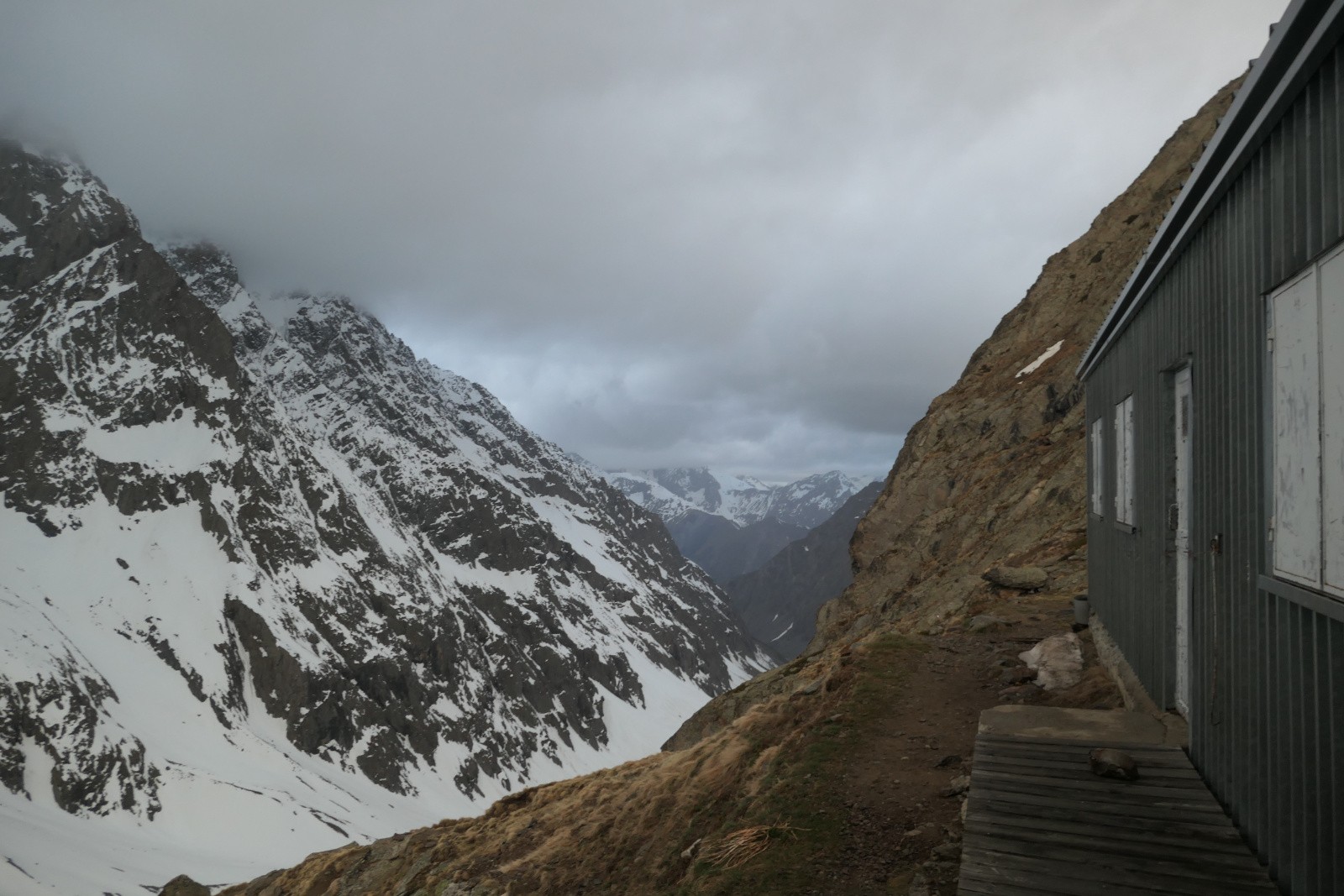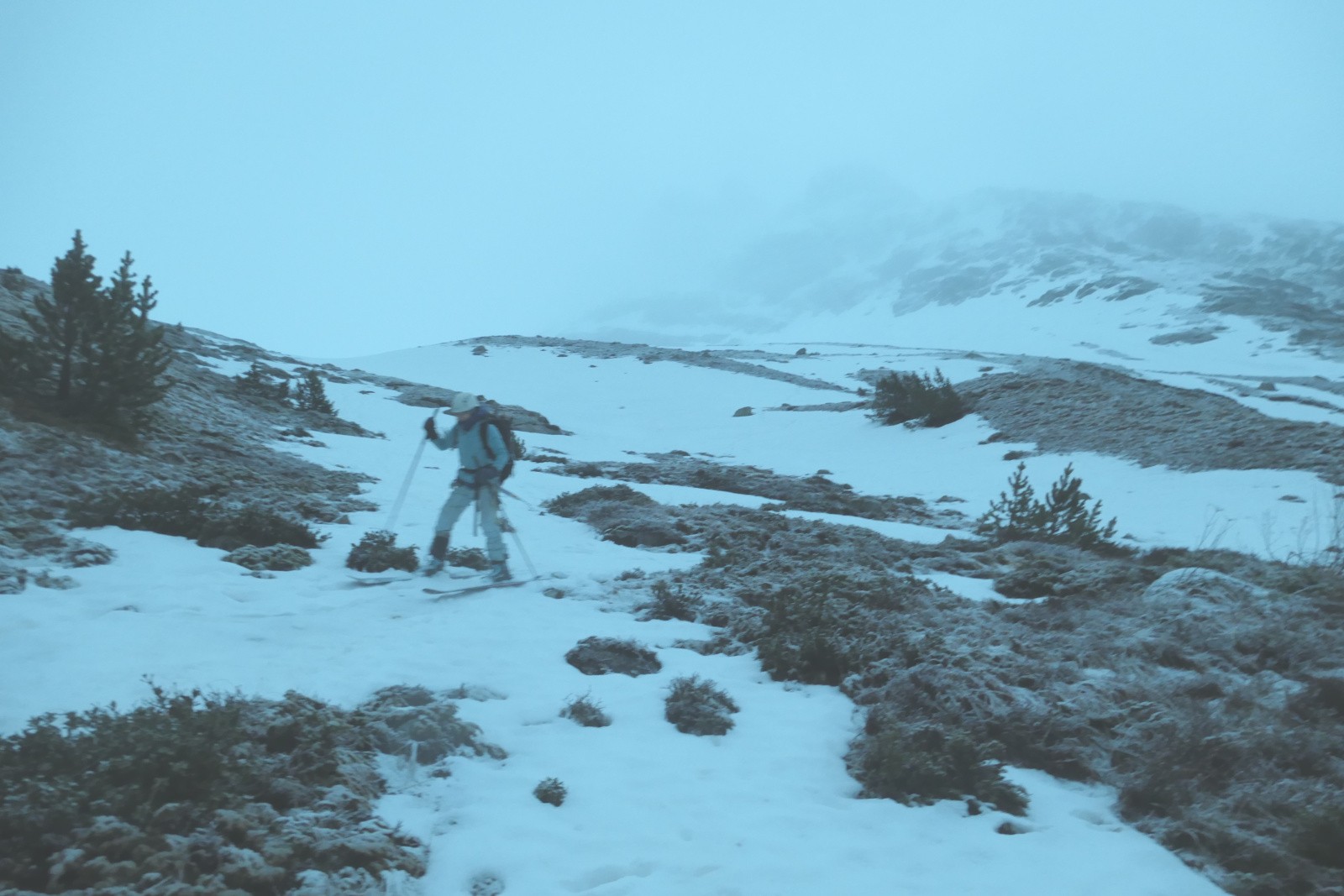 Départ du refuge 6h. Je sors mettre les peaux, tient il pleut. Bon, on va patienter un peu. On fait un check météo et radars avec Justin. Quelques averses musclées passent puis vers 7h ça semble plus sec. On salue nos hôtes et partons sous quelques rares gouttes.