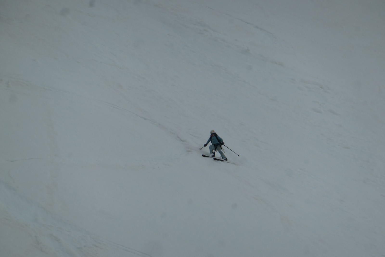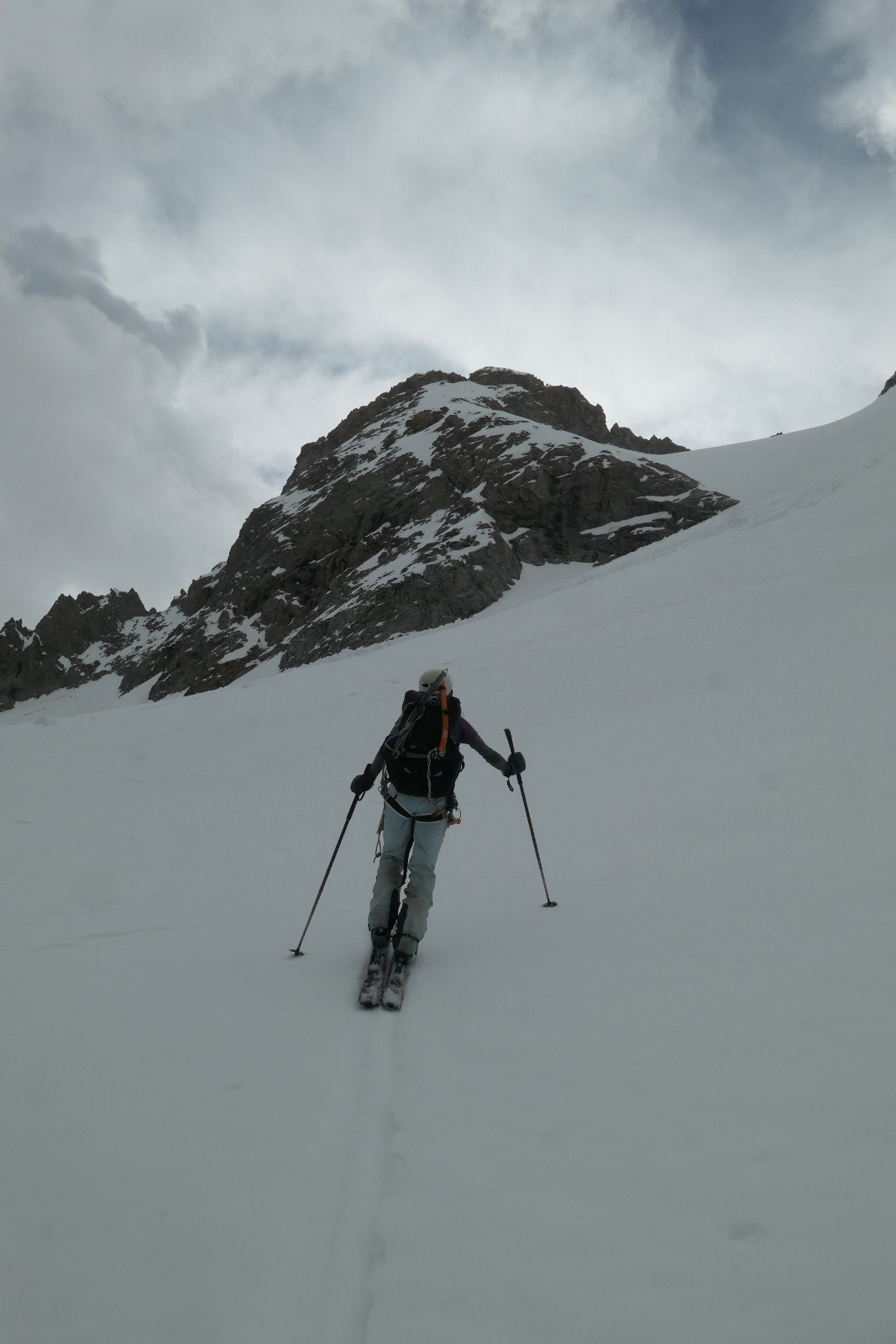 La face du col du Replat a été balayée en son centre par les coulées de la veille. En montant on trouve un regel de surface au-dessus de 3000m environ. La pente est plus soutenue que ce que j'imaginais en regardant la carte mais ça passe bien en ski. La météo alterne entre soleil et averse, il fait pas si moche. Au col on descend direct, tant pis pour le sommet vue la qualité de la neige.