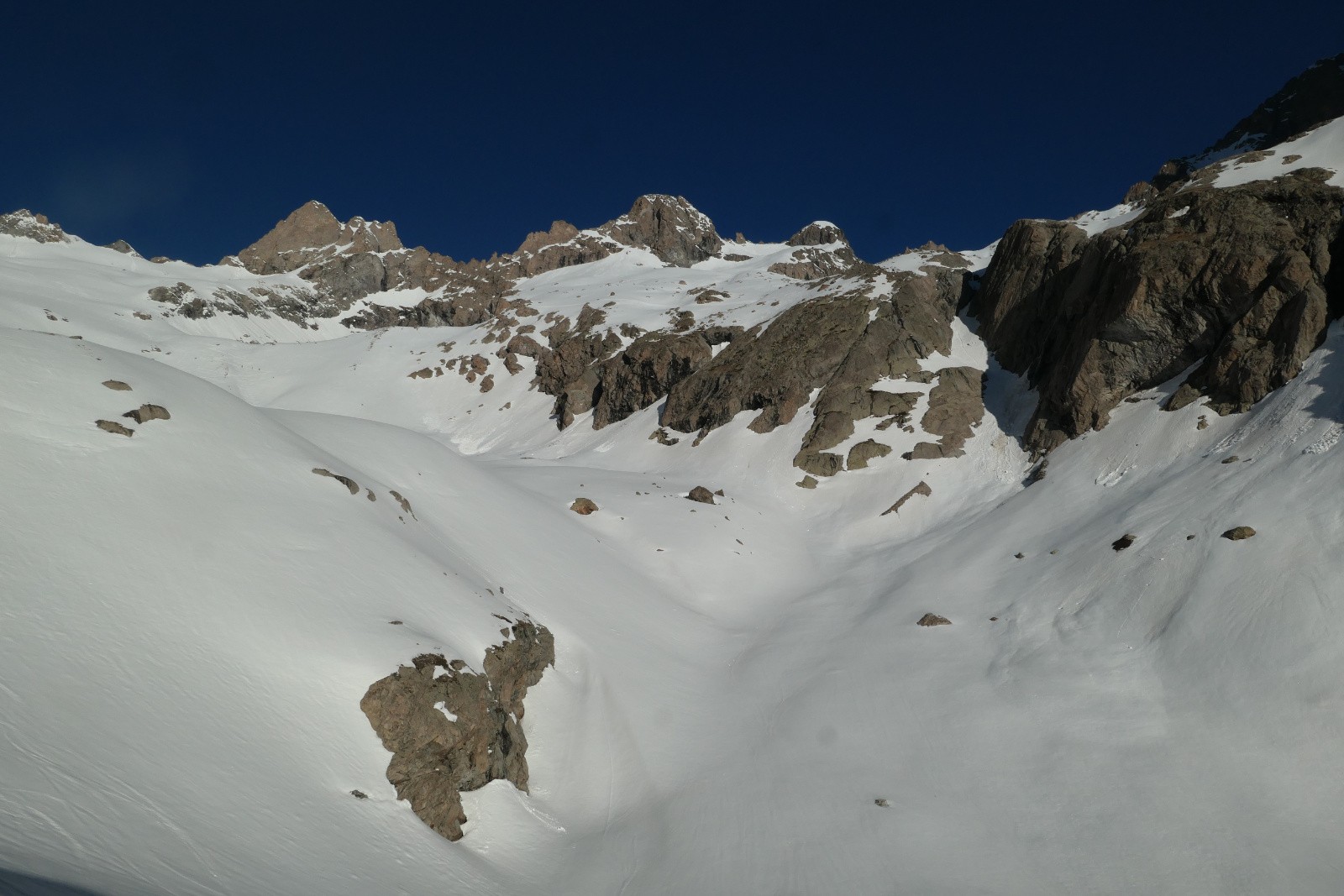 Vendredi 02/05 : Neige transfo dans la face SW du Râteau. Bon regel et bon décaillage. Poudre lourde dans le vallon. Neige un peu pourrie en bas. Une courte étroiture en neige/glace et cailloux sur le haut de la brèche du râteau en E. Neige assez tassée dans le reste de la face, un grosse coulée a bien purgé la face ces deux derniers jours, neige assez trafolée par les passages sur les côtés.