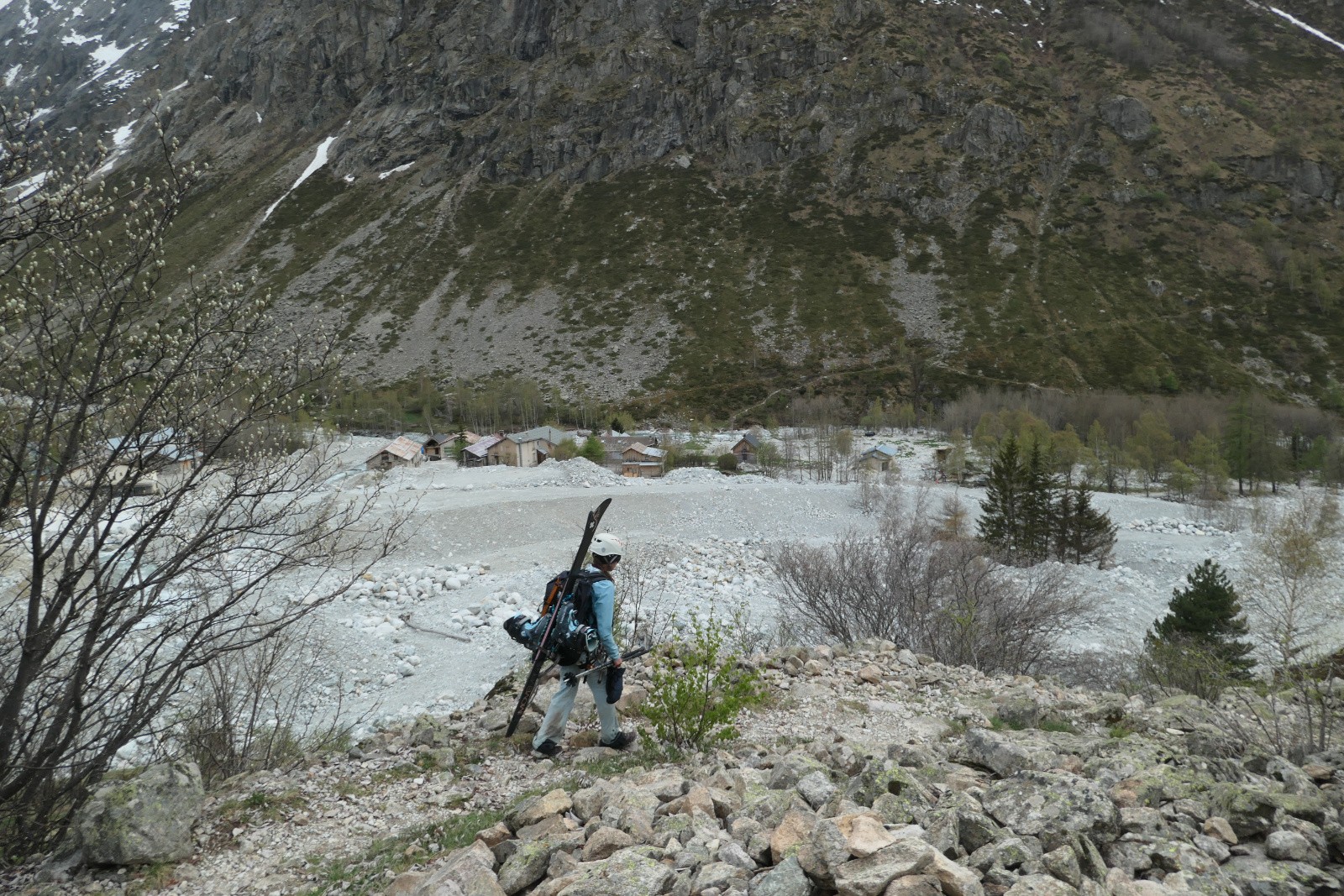 Le petit couloir du haut manque de neige, il se passera à pied. Descente assez pourrie sur quelques centaines de mètres ensuite dans la neige pourrie. Dommage c'est une belle face très skiante. Entre 2700 et 2400m, c'est plus tassé et on fait du ski assez sympa. Environ 100m à pied sur une section déneigée entre 2400 et 2300m puis on rejoint le fond du vallon. De là on se laisse glisser sous le Châtelleret, on déchaussera vers 2000m après pas mal de bricolage et de pousse bâton pour chercher les langues neige. Rapidement on retrouve le chemin qui nous mène jusqu'à la Bérarde. Le chemin a été reconstruit depuis la coulée de boue d'il y a deux ans et est facile à suivre en rive droite.