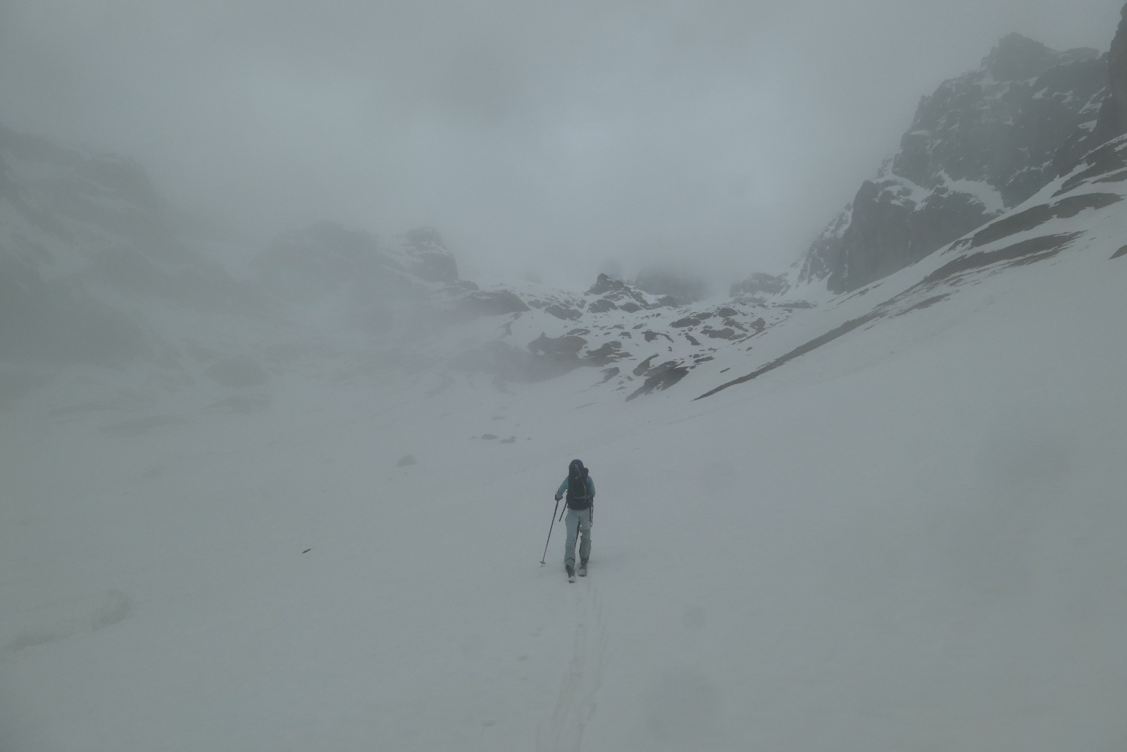 Au réveil, il y a du mieux sur la météo, il ne pleut pas mais il neige. On remet un réveil à 5h, préférant décoller de jour voir ce que dit la visibilité. 5h, ça semble un peu plus dégagé, on prend le petit dej et on plie bagages. Au départ c'est tout bâché et humide. On n'a pas idée du BERA ni de l'évolution de la météo, passer par le col de la Temple et sa traversée expo nous paraît pas l'idée du siècle. On descend donc en direction du Carrelet, si jamais ça se dégage on tentera Coste Rouge pour rejoindre le Pré de Madame Carle, sinon on stoppe le tour et on rentre par la Bérarde.