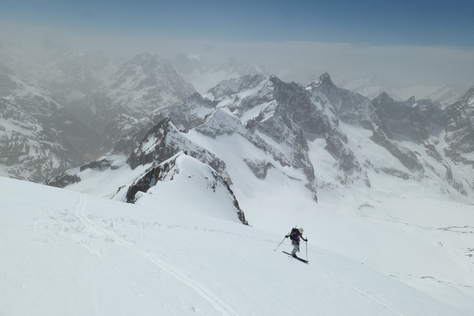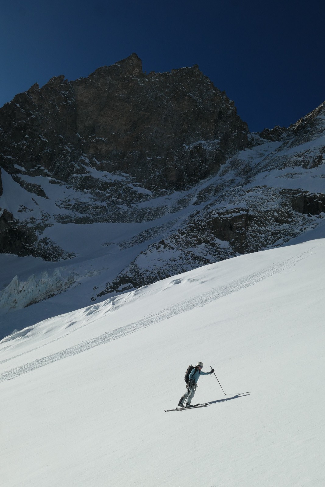 Au sommet un petit vent nous cueille, juste de quoi mettre une veste et pas trop traîner. La Meije si proche offre un panorama extraordinaire! Début de descente facile dans une neige presque un poil trop lourde. On s'engage ensuite sur l'épaule en moquette à poils courts. Ça plonge sacrément et on voit pas la suite c'est impressionnant. Encore quelques virages bien raides et expo mais en neige rassurante sur l'épaule avant de filer à droite sur la suite de la face. La pente s'adoucit peu à peu. On arrive au dessus de la rimaye. Elle est plutôt bien ouverte. On aurait pu la contourner par le côté mais on l'a vue trop tard. Tant pis un tout droit fera l'affaire, après l'arête qu'on vient de se taper on n'est plus à un saut de rimaye près. Fin de la face, c'était un itinéraire vraiment beau!