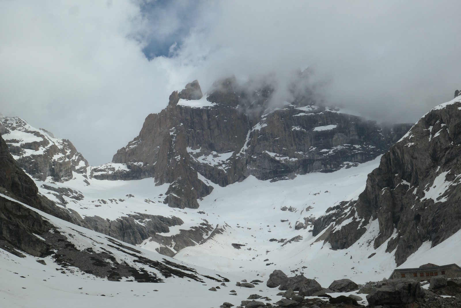 14h, on pourrait descendre par la Bérarde mais ça va être long et la journée est bien avancée. On préfère rester une nuit au refuge et miser sur le beau temps du lendemain.