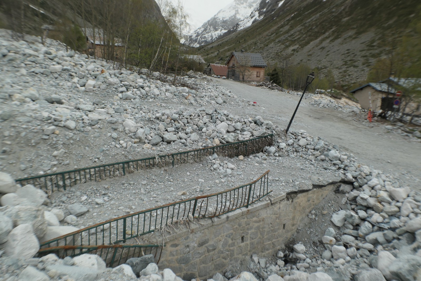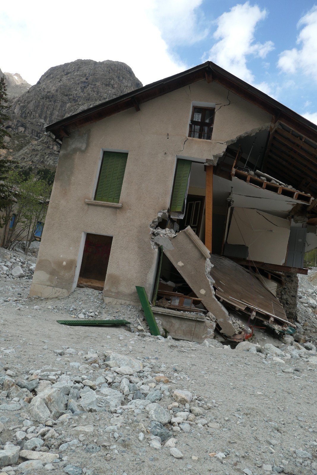 On arrive classiquement à la Bérarde par en haut, le village se dessine, coupé en trois. Le torrent des Etançons sinue dans son nouveau lit. La traversée du village est assez glauque. Des gros numéros en peinture orange sur tous les bâtiments. Des maisons coupées en deux qui font penser à des maisons de polypocket qu'on peut ouvrir en leur milieu.