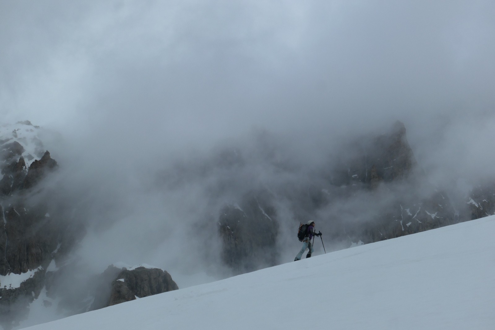 15h30, putin Emeric y a une méga éclaircie de l'espace, ni une, ni deux nous voilà skis aux pieds devant le refuge. Euh, tiens mais il pleuvrait pas un peu là? 100m plus haut on est trempés, on n'a pas capté plus de réseau pour afficher BERA ou météo. Demi-tour.