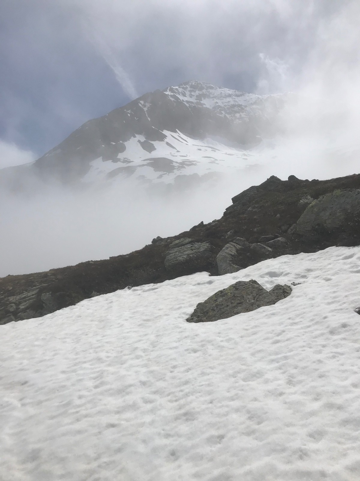 Itinéraire suivi : au parking ce matin, une seule voiture de randonneurs à pied qui s’étonner de voir quelqu’un monter avec des skis sur le dos. La neige apparaît bien avant les lacs, mais elle n’est réellement skiable qu’à partir de 2100 m. C’est également l’altitude à laquelle le brouillard voulais bien laisser la place au ciel bleu.Malheureusement, plus haut, la neige glisse sous les skis et rend la montée comme la descente très pénible