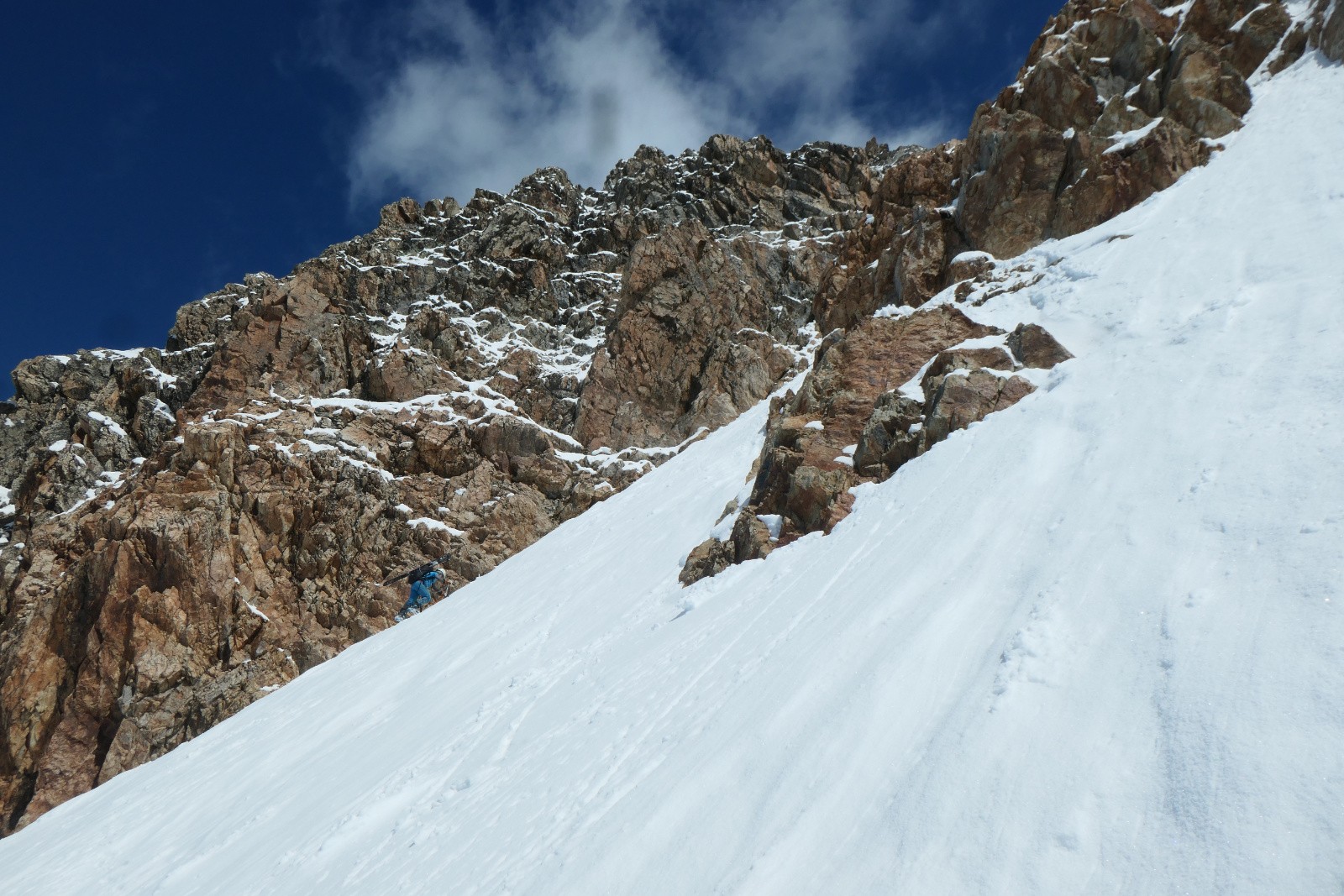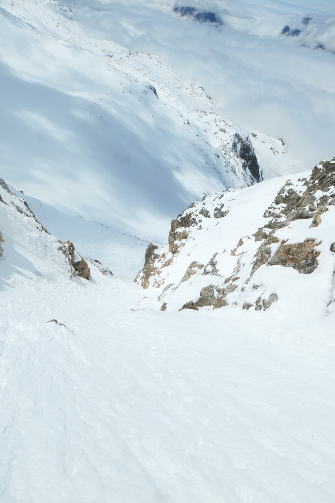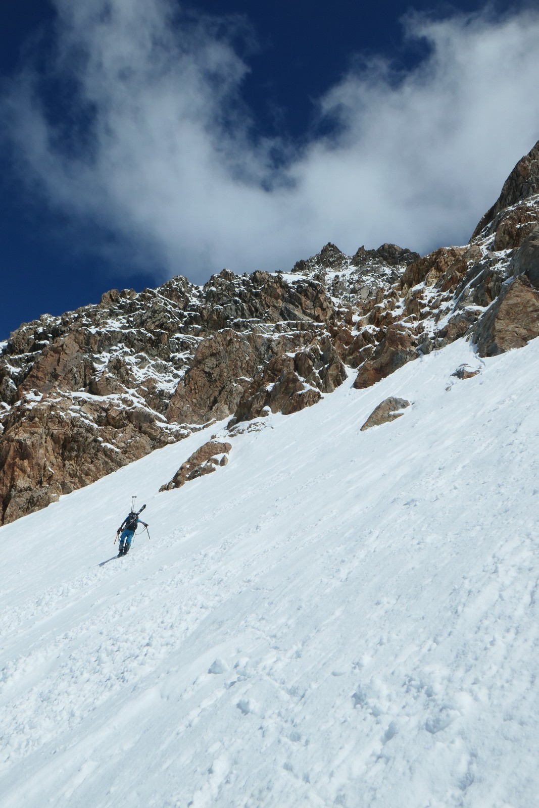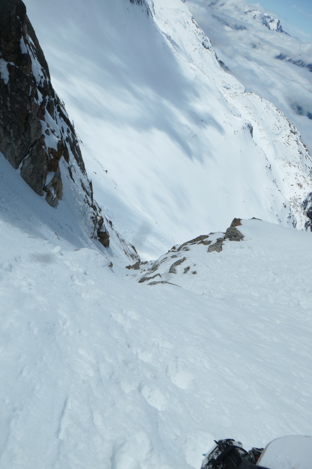 À la sortie du couloir le glacier est en neige croûtée pas vraiment revenue qui zippe un peu. Arf, ben zut elle est où la transfo avec bon grip?! Bref ça se descend mais c'est pas aussi bon que prévu.