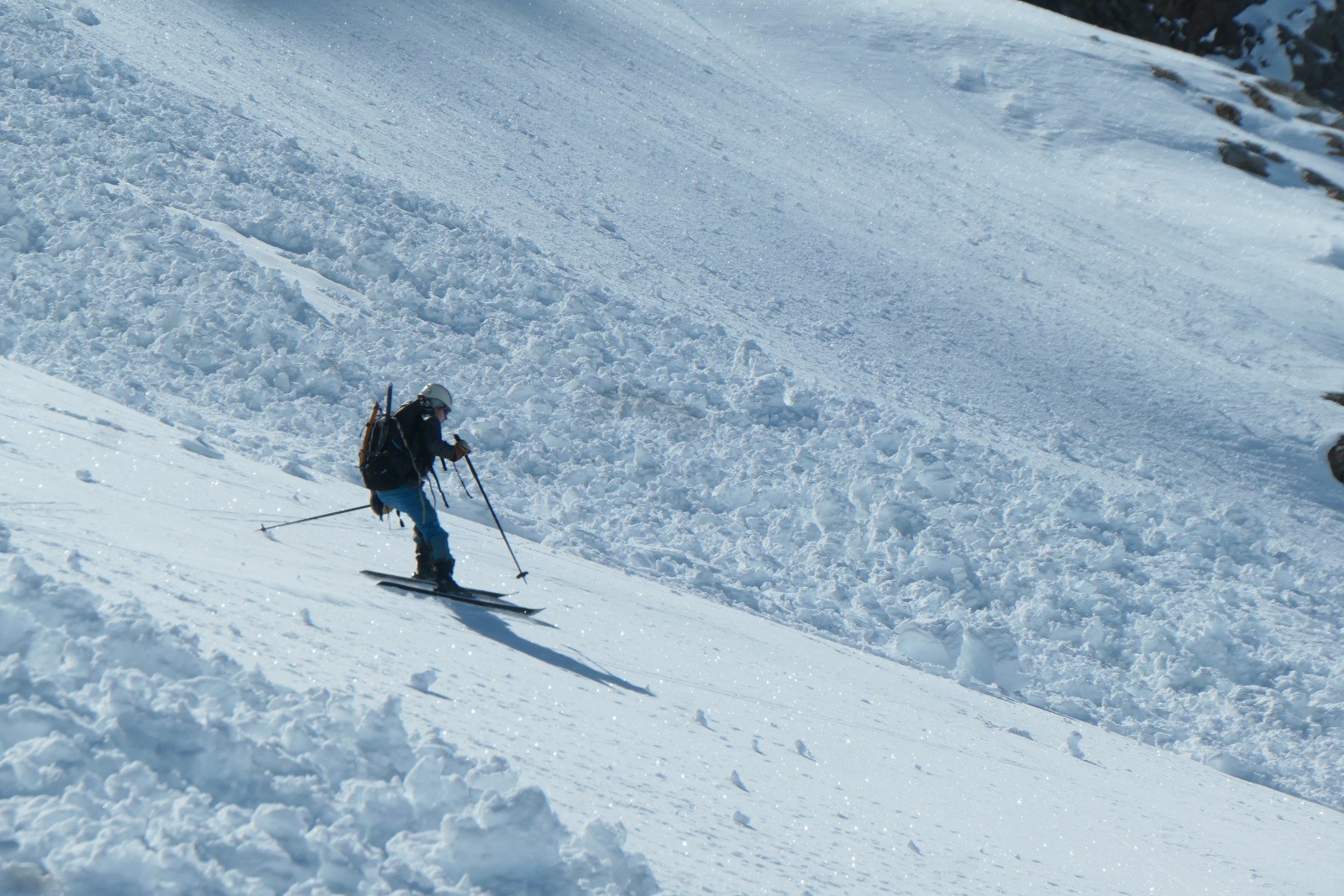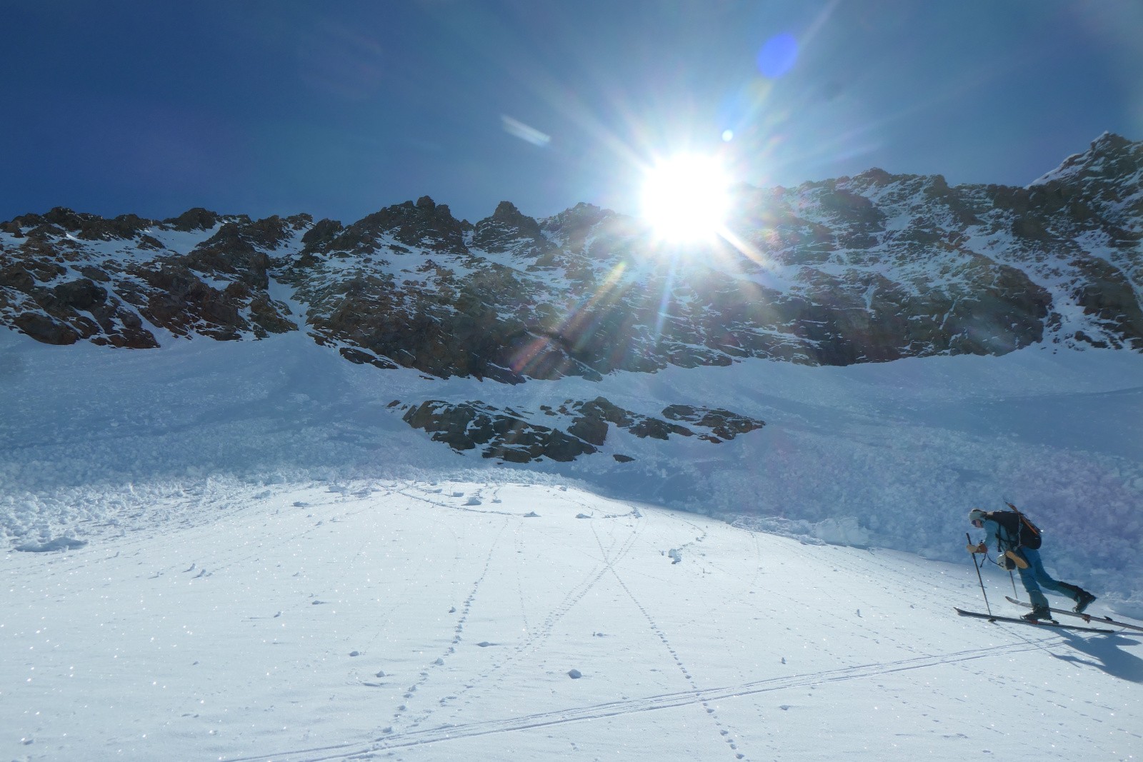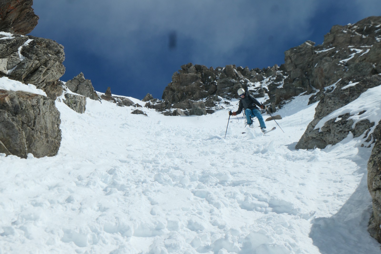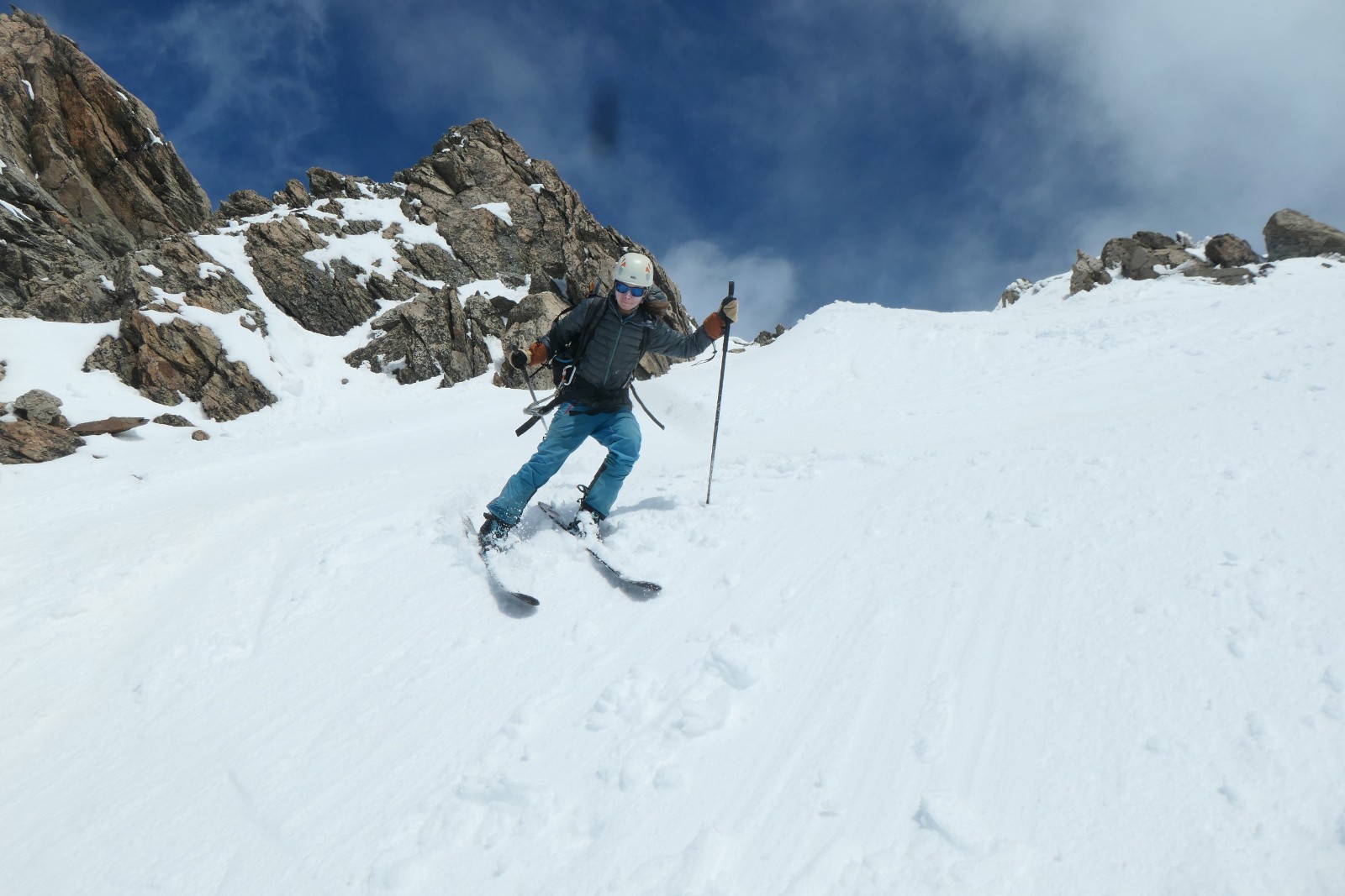 À la sortie du couloir le glacier est en neige croûtée pas vraiment revenue qui zippe un peu. Arf, ben zut elle est où la transfo avec bon grip?! Bref ça se descend mais c'est pas aussi bon que prévu.