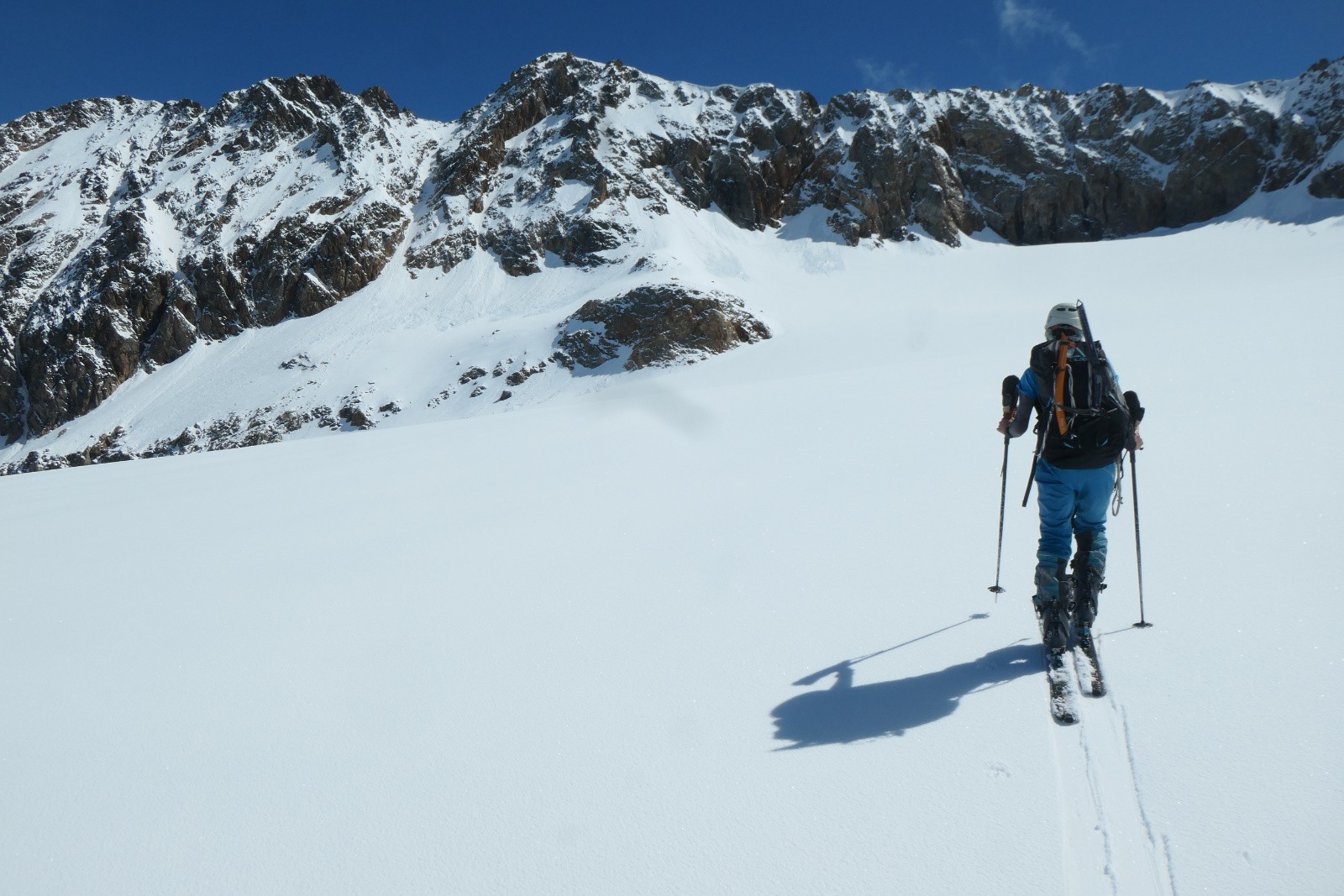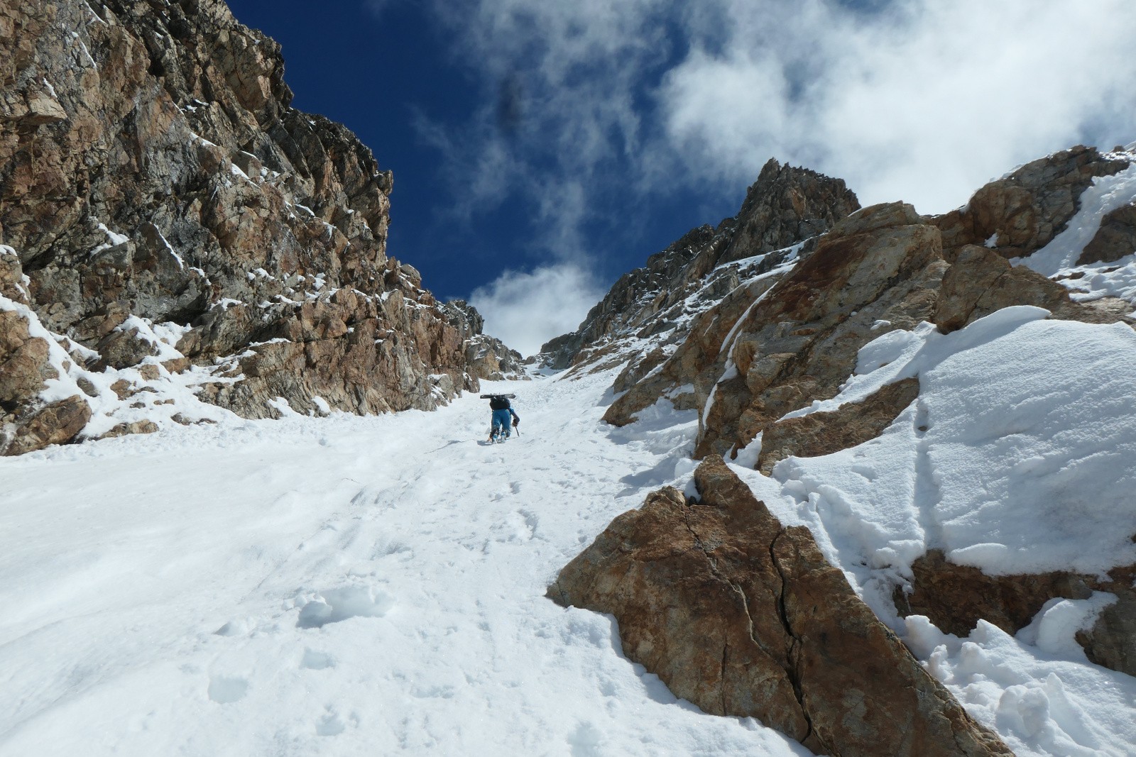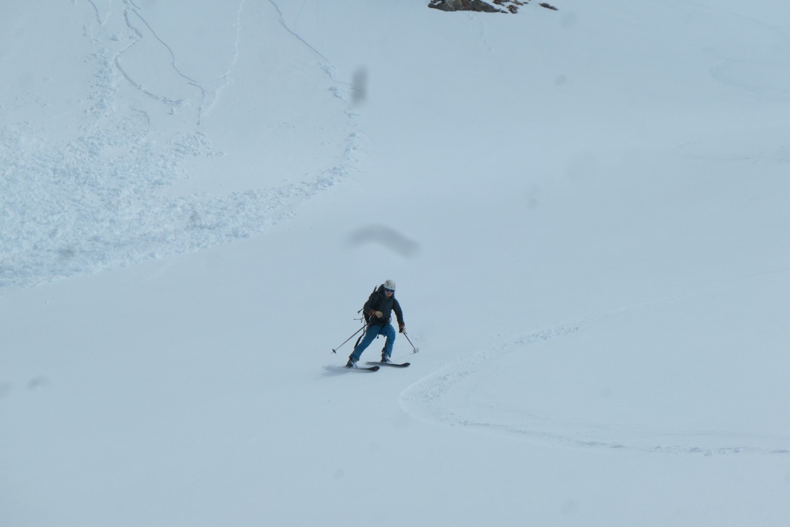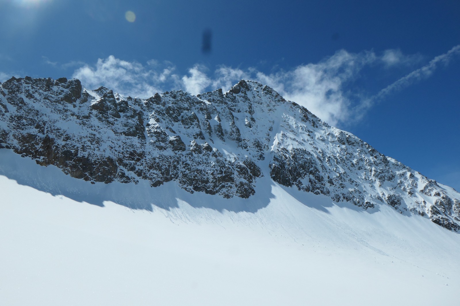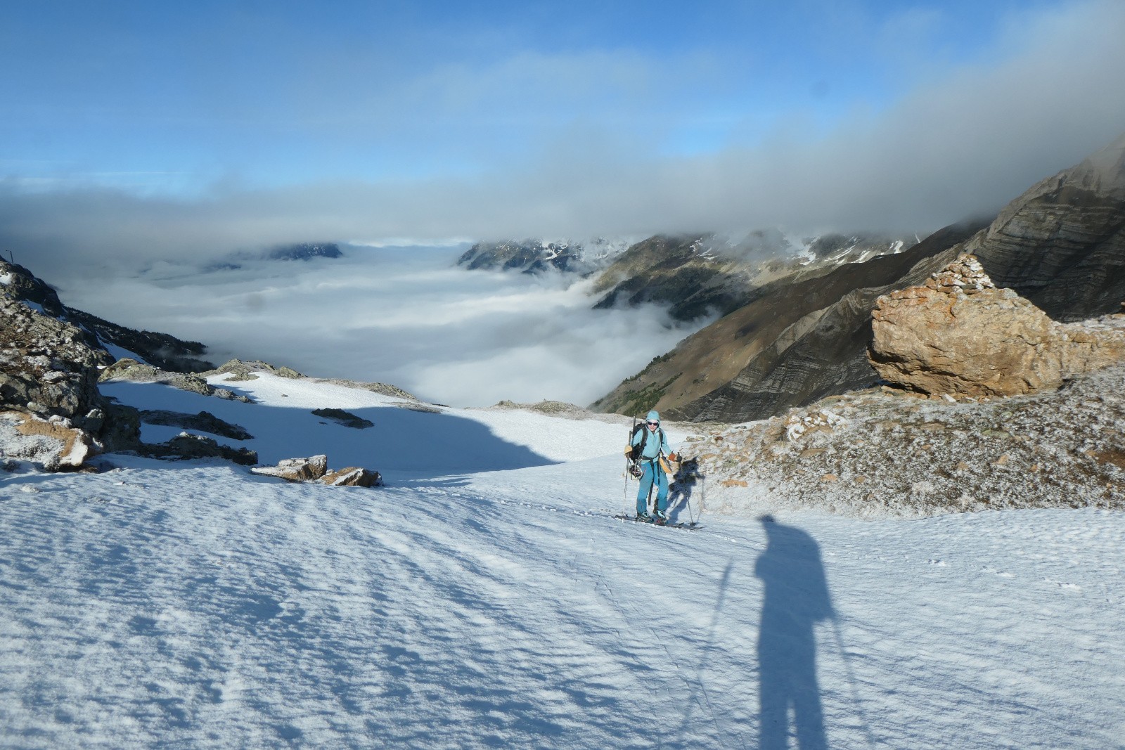À la sortie du couloir le glacier est en neige croûtée pas vraiment revenue qui zippe un peu. Arf, ben zut elle est où la transfo avec bon grip?! Bref ça se descend mais c'est pas aussi bon que prévu.