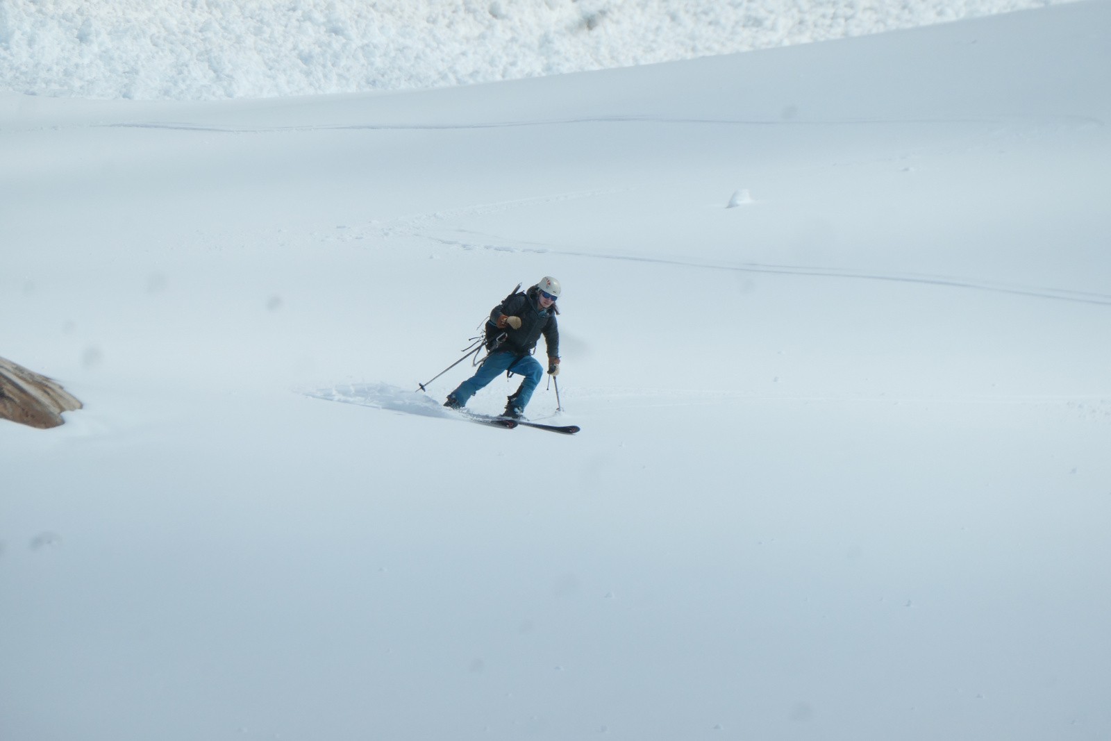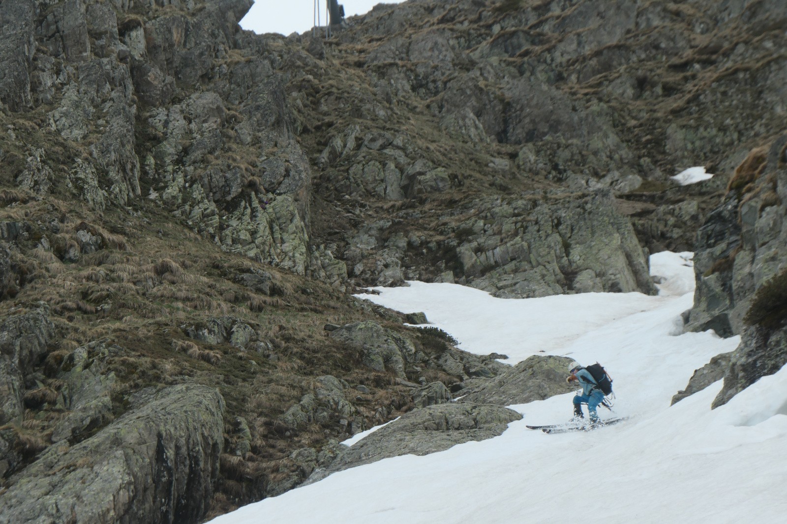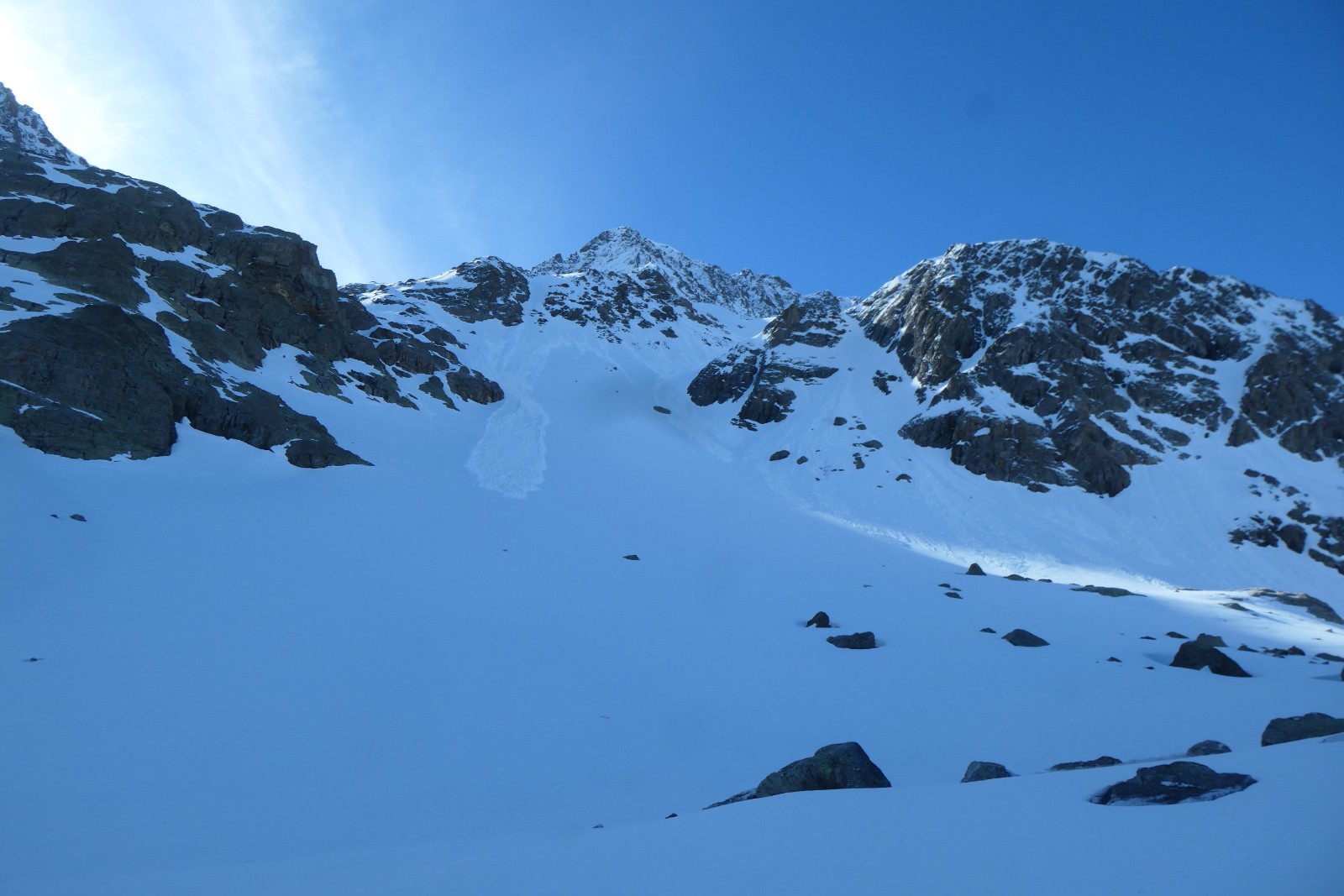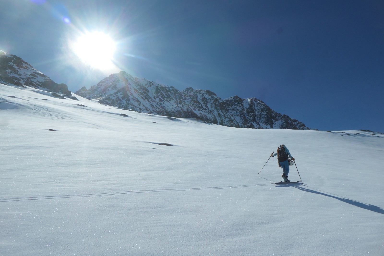 À la sortie du couloir le glacier est en neige croûtée pas vraiment revenue qui zippe un peu. Arf, ben zut elle est où la transfo avec bon grip?! Bref ça se descend mais c'est pas aussi bon que prévu.
