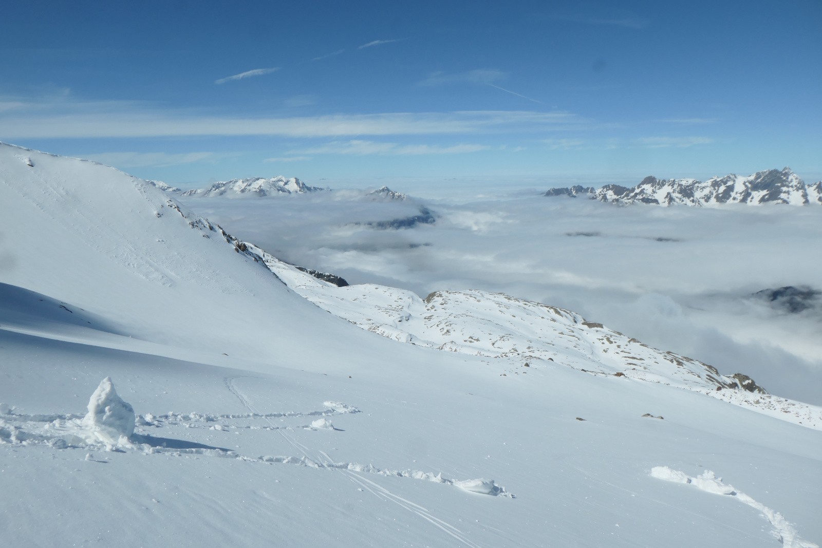 Conditions nivo et activité avalancheuse : plaques de surfaces dans le couloir S qui a en partie déjà purgé. Plutôt stable sur l'itinéraire. Pointe sommitale de la cime de la Barbarate un peu plaquée en surface également.
