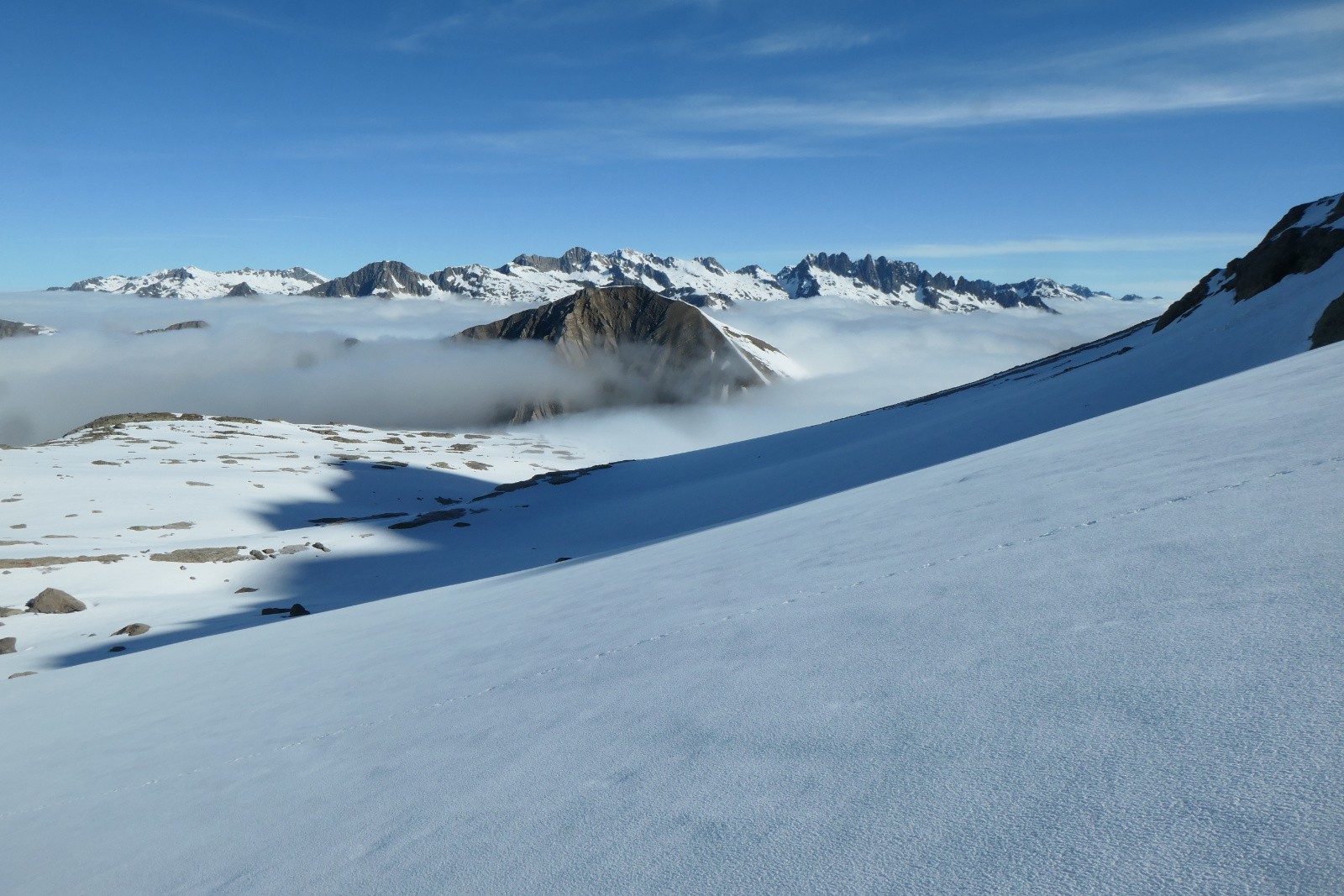 Météo/températures : Beau, mer de nuages vers 1800->2200m. Ça s'ennuage vers 13h. Vent NNE qui se renforce en journée,