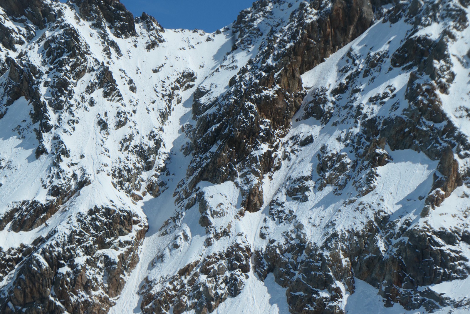La suite de la montée est assez efficace en neige dure. On sort les couteaux pour les sections raides, la neige est lisse, la descente s'annonce géniale! On poursuit jusque sous le couloir W, il est sacrément moins rempli que l'an dernier. L'entame est peu large et goulottée, pas mal de cailloux sur la première partie. Ça se remonterait mais la descente fait pas rêver. Emeric propose la NW du pic Bayle qui semble plus blanche. On regarde le topo. 5.3/E4... option rapidement éliminée. Finalement on dépeaute un coup pour aller voir ce que dit le couloir S de la Barbarate.