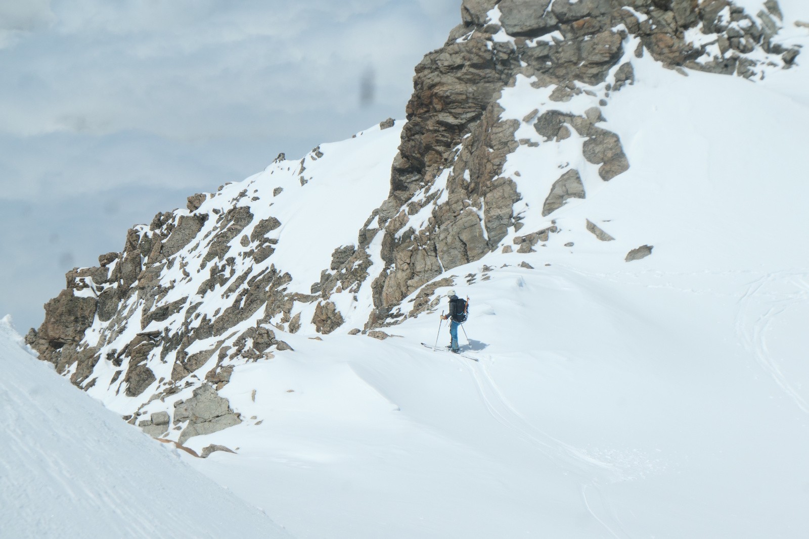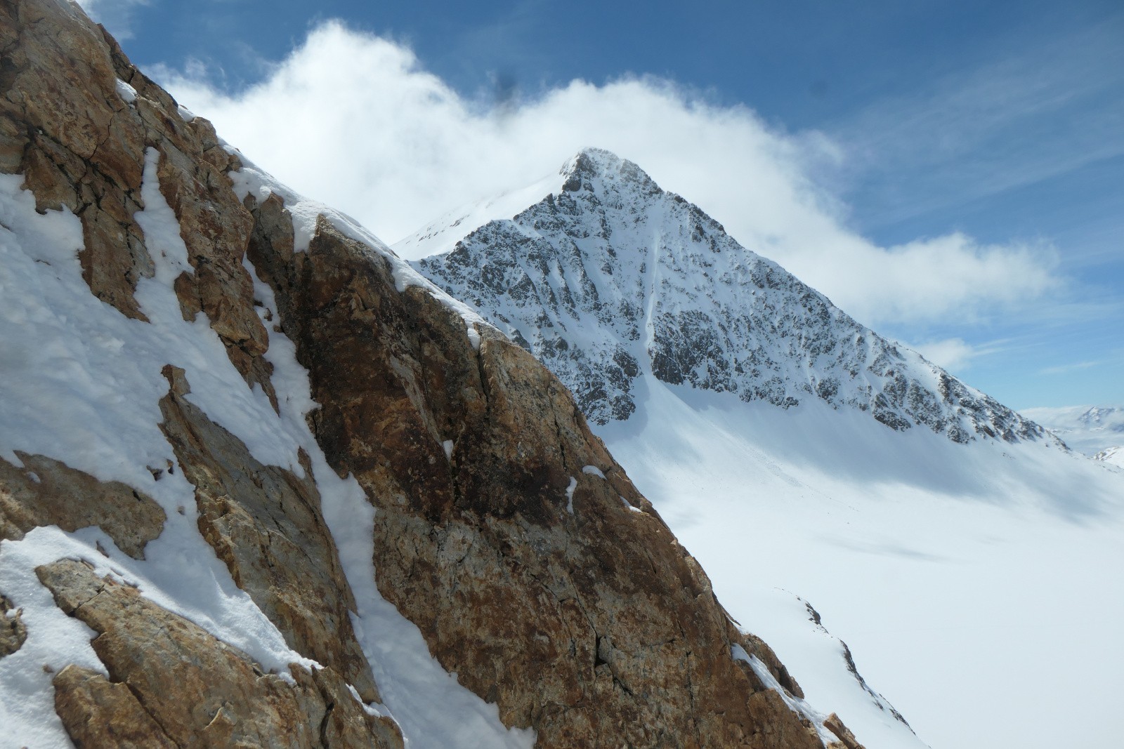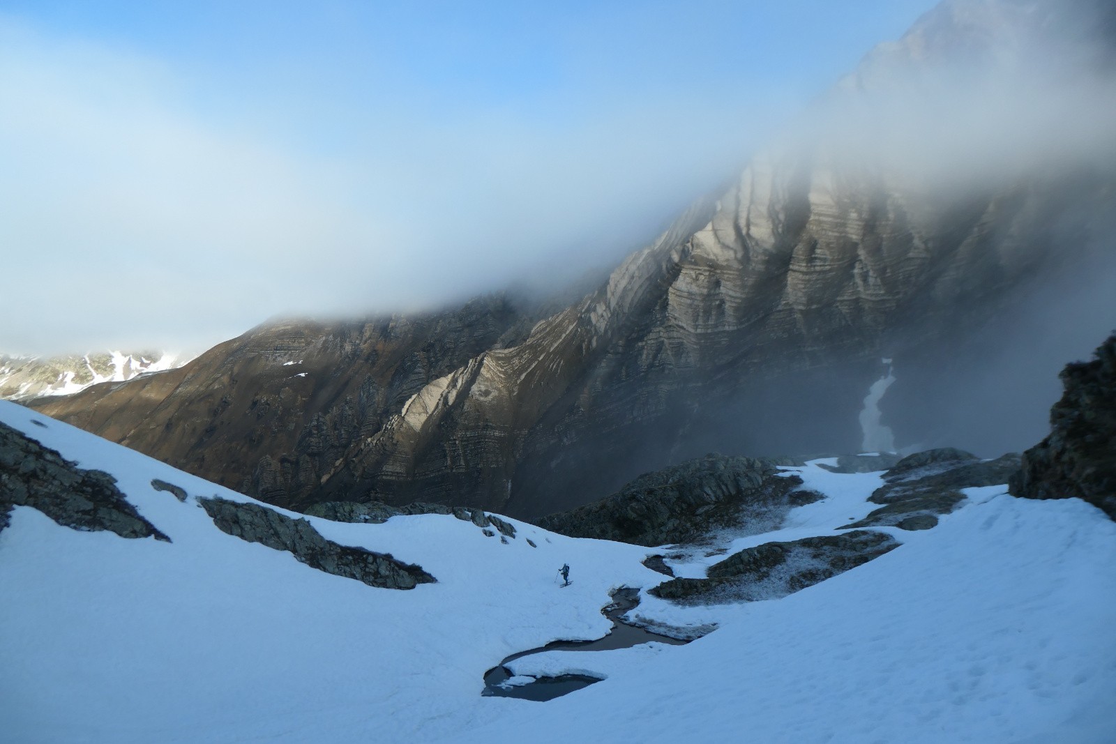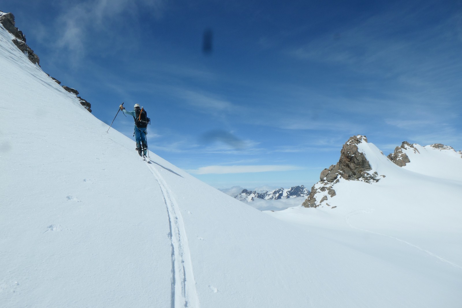 On pensait pouvoir atteindre facilement le sommet de la Barbarate mais c'est raide et en cailloux. On s'arrête donc 30m en-dessous et dépeautons sans tarder car les nuages sont en train d'envahir l'Etendard. Quelques virages sympa sur le haut et dans les parties décaillees, sinon ça sera pas du grand ski car c'est peu lisse et en neige plutôt dure, on y est un peu tôt. Pas grave c'est quand même joli et la suite de la descente va être top!