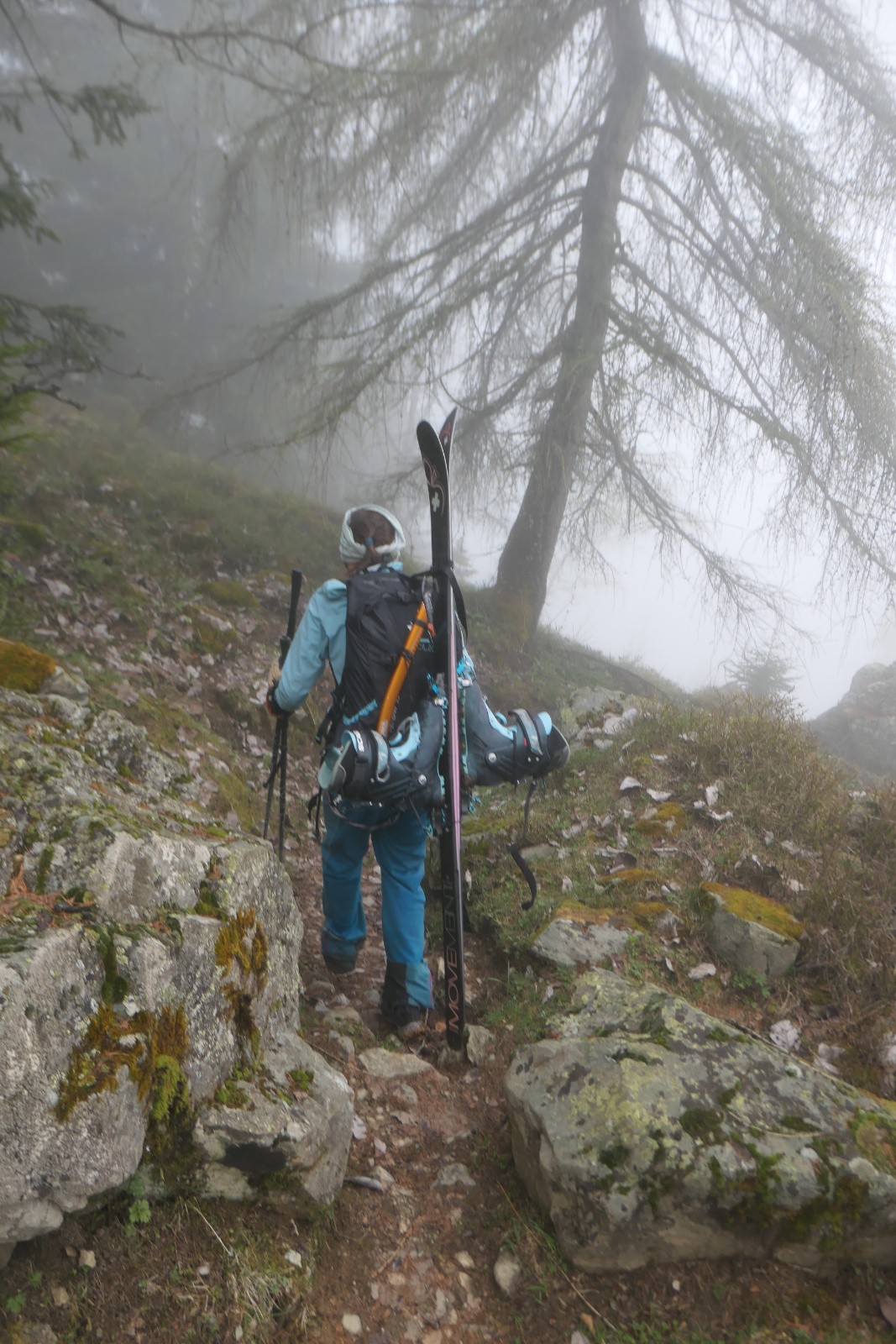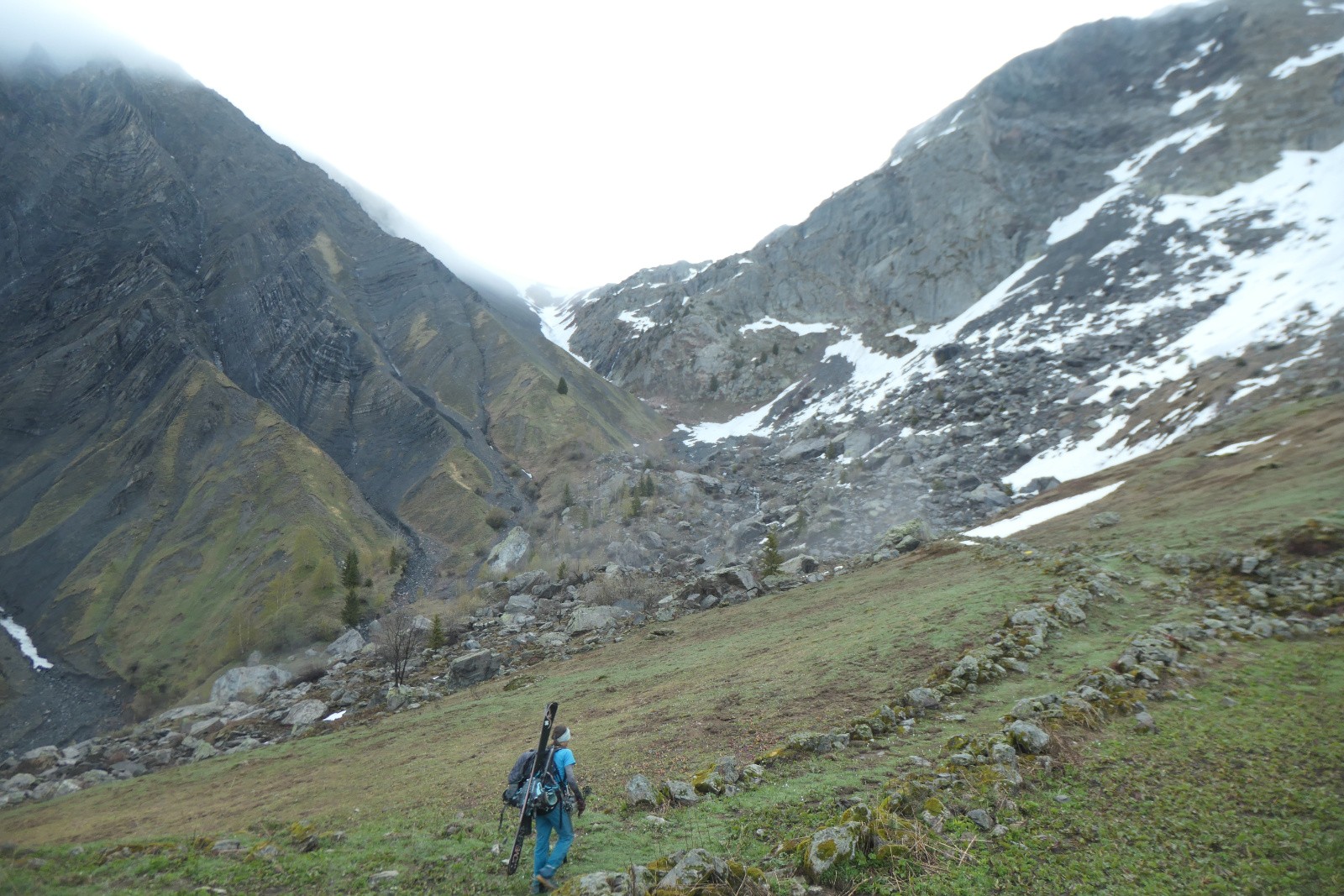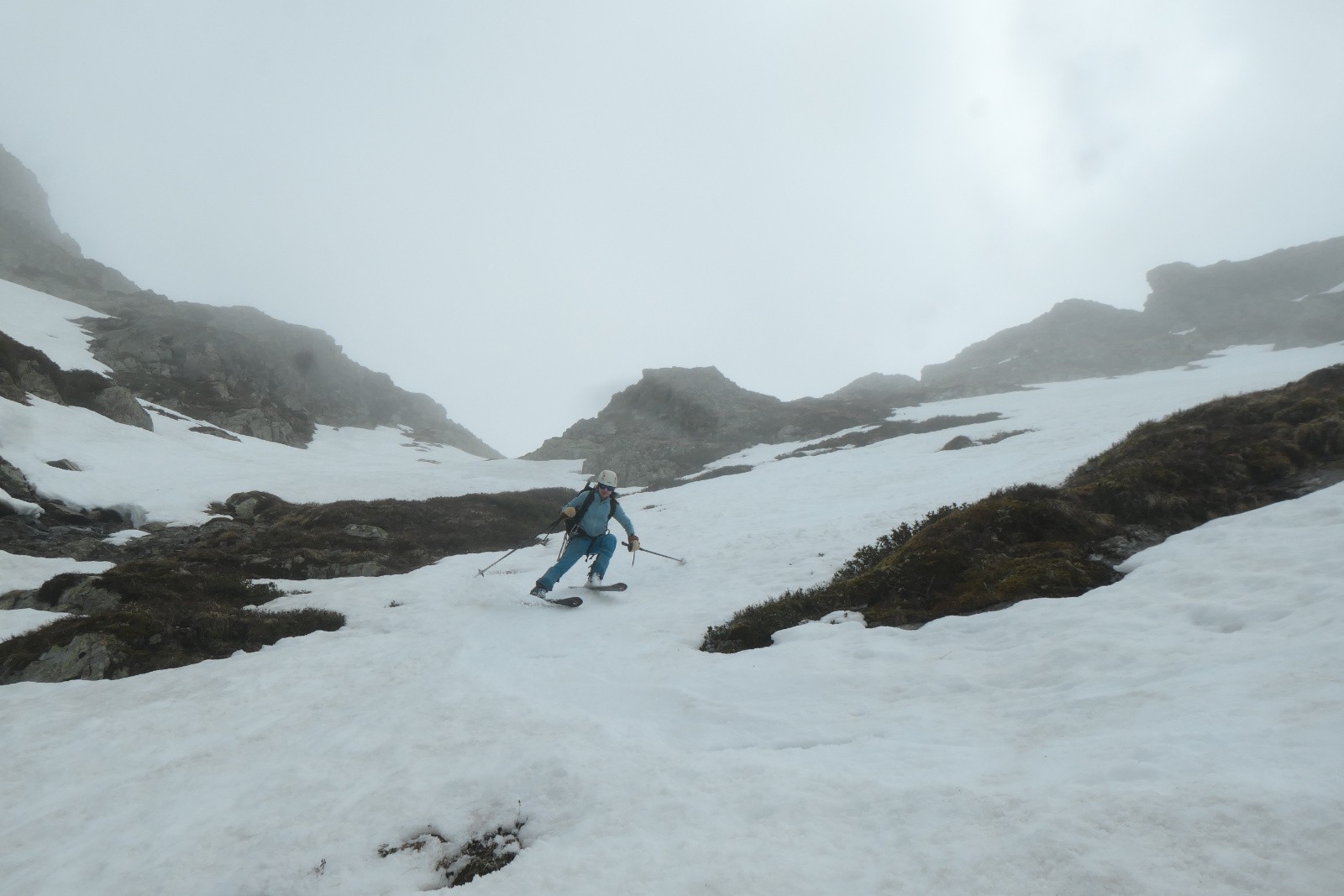 Sous le glacier, quelques super virages puis rapidement on est dans la collante. Décidément, on s'est planté sur la moquette 5*! La mer de nuages et la neige fraîche ont pas du faire bon ménage. On traverse sous le Lac de la Jasse pour rejoindre la suite de la descente. On y voit pas grand chose dans le nuage, et on s'oriente au gps pour passer au mieux les ressauts. Neige bien tassée type névés bien skiante. La mer de nuages offre un bel effet de style avec les sommet. Emeric gérera l'orientation à la perfection et on déchausse à 1850m juste à côté du chemin de montée.