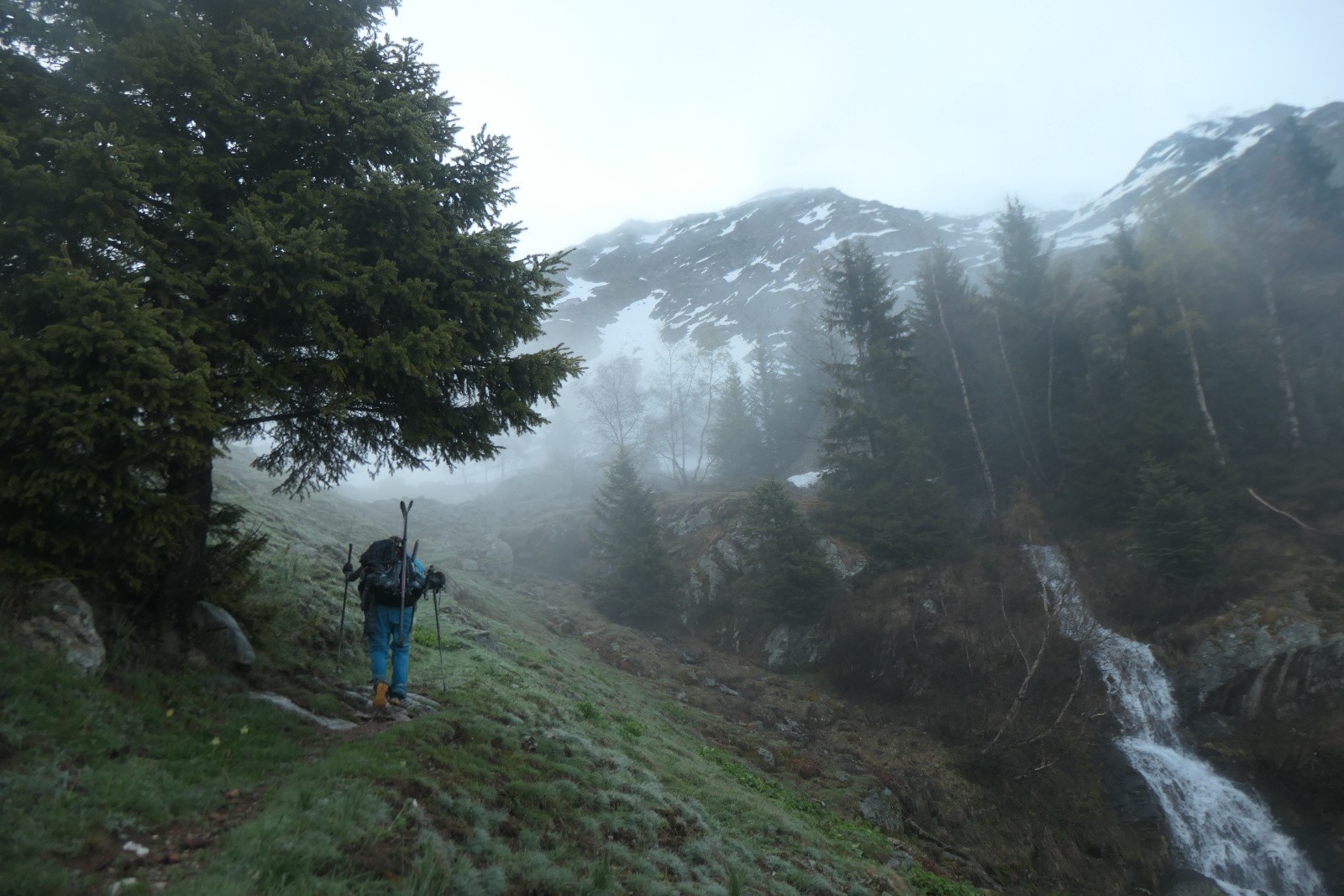 Départ à 1370m, sur une piste assez raide, nous voilà partis pour une petite session portage d'environ 800m. Si le démarrage du sentier pour le col du Couard est bien marqué par un panneau de randonnée, le balisage ensuite est assez succinct. On prend le plus large qui est selon notre analyse une piste de VTT en terrain de type glaise où on hésite par endroit à monter à quatre pattes. On rectifie un peu plus haut pour prendre le véritable sentier. C'est plus confort par contre le torrent a eu la même idée que nous, prendre le sentier. De quoi mouiller les chaussettes!