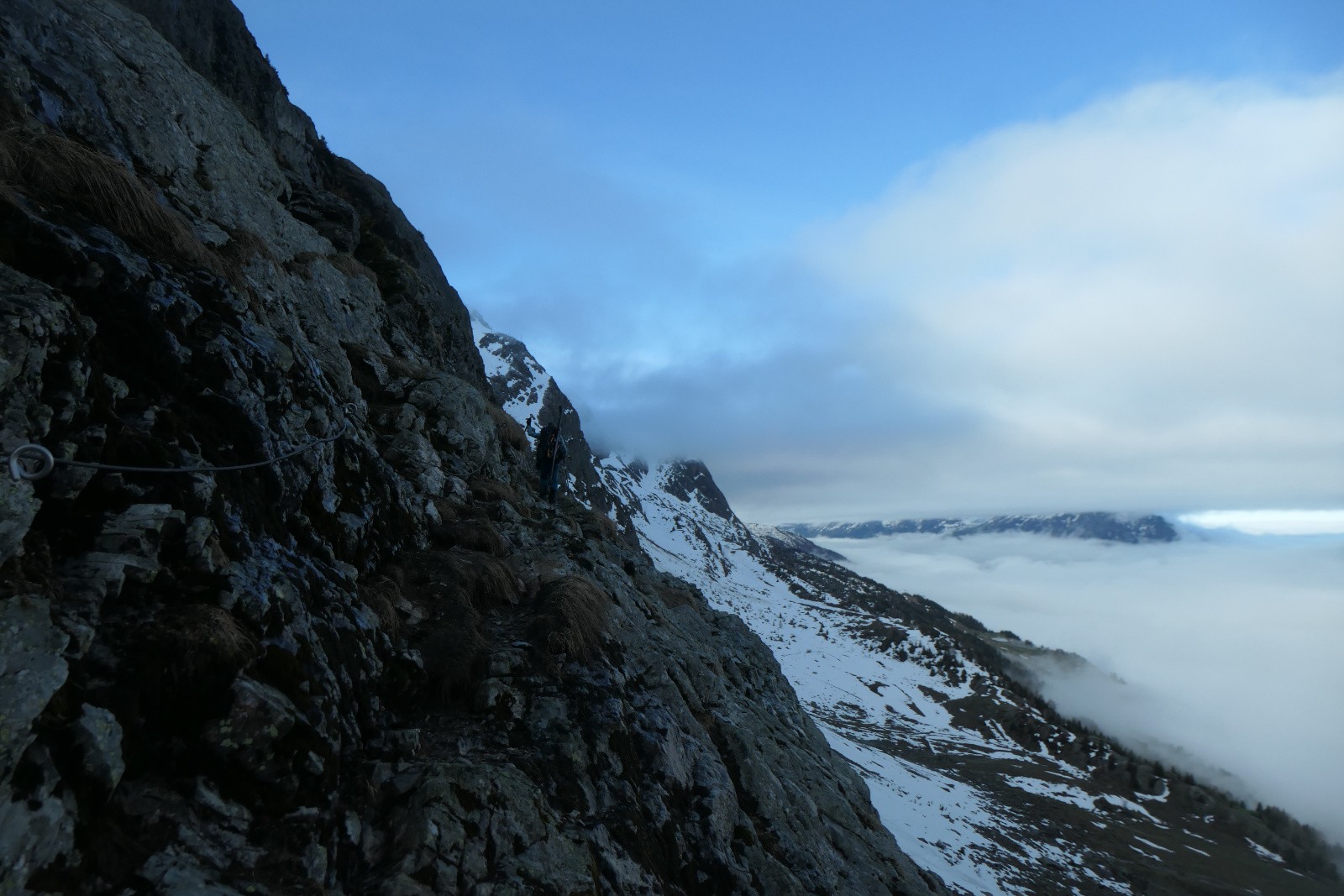 Passé le replat du Vallonnet, le chemin est plus technique et serpente dans les barres avec plusieurs passages câblés. Très sympa! On atteint ensuite un replat vers 2150 où on chausse et on regagne rapidement le col du Couard.