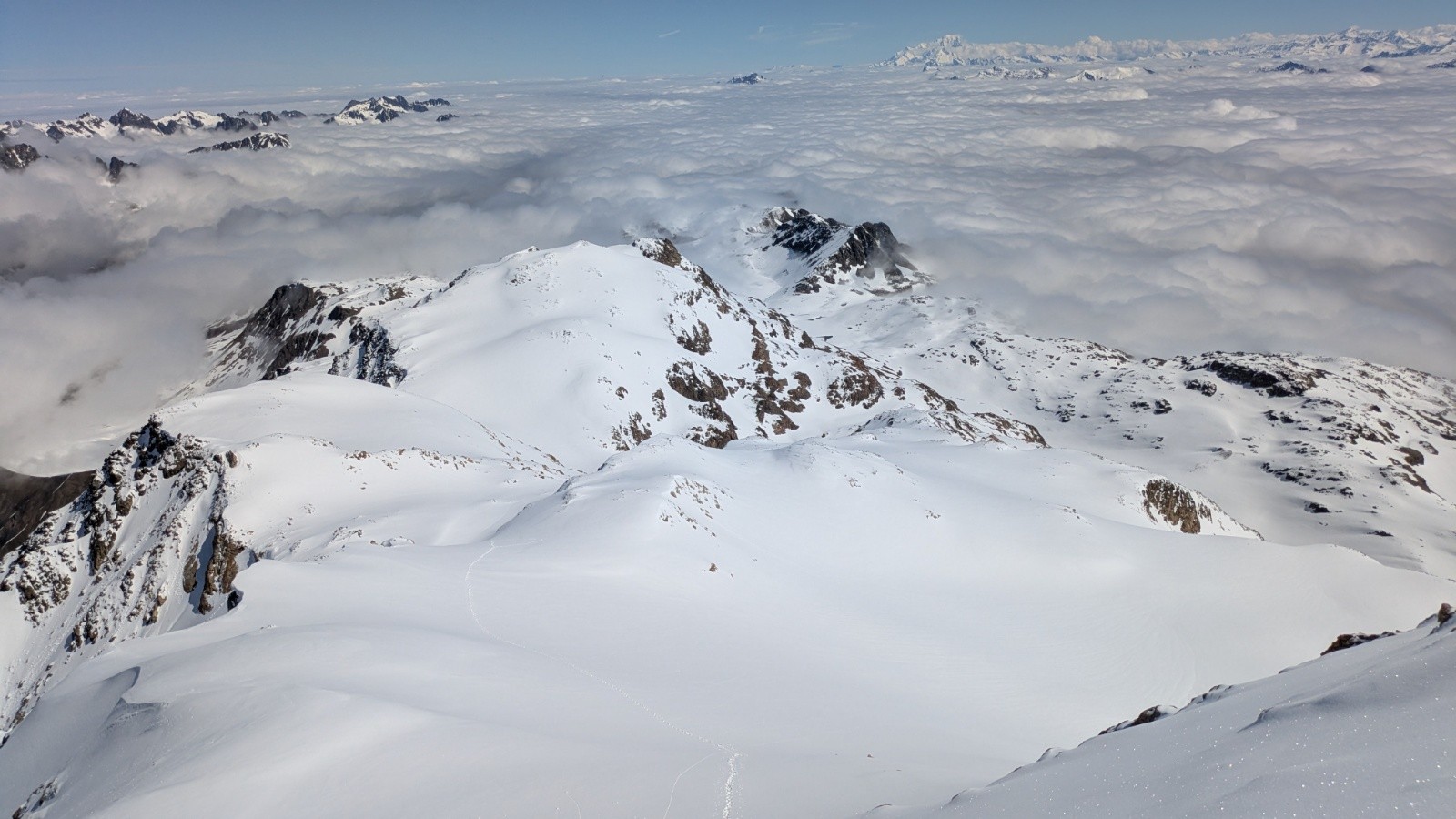 Conditions pour le ski : bon regel, neige de névé sous 2100m, au dessus 5mm de poudre adoucissent le fond dur; au dessus de 2400m, peut etre 1cm de poudre sur fond dur la où ca n'a pas vu le soleil. Sinon, crouté. Béton dans le raidillon pour atteindre 3000m. 10cm de poudre au dessus de 3000m en face Est des cimes des cochettes, mais on est arrivé vers 11h30 et c'était bien humide en Est et encore bien correct en Nord. Remontée des aiguillettes vers midi dans 10cm de neige ultra humide, et descente vers la voiture un peu mieux mais quand meme moquette a poils bien longs
