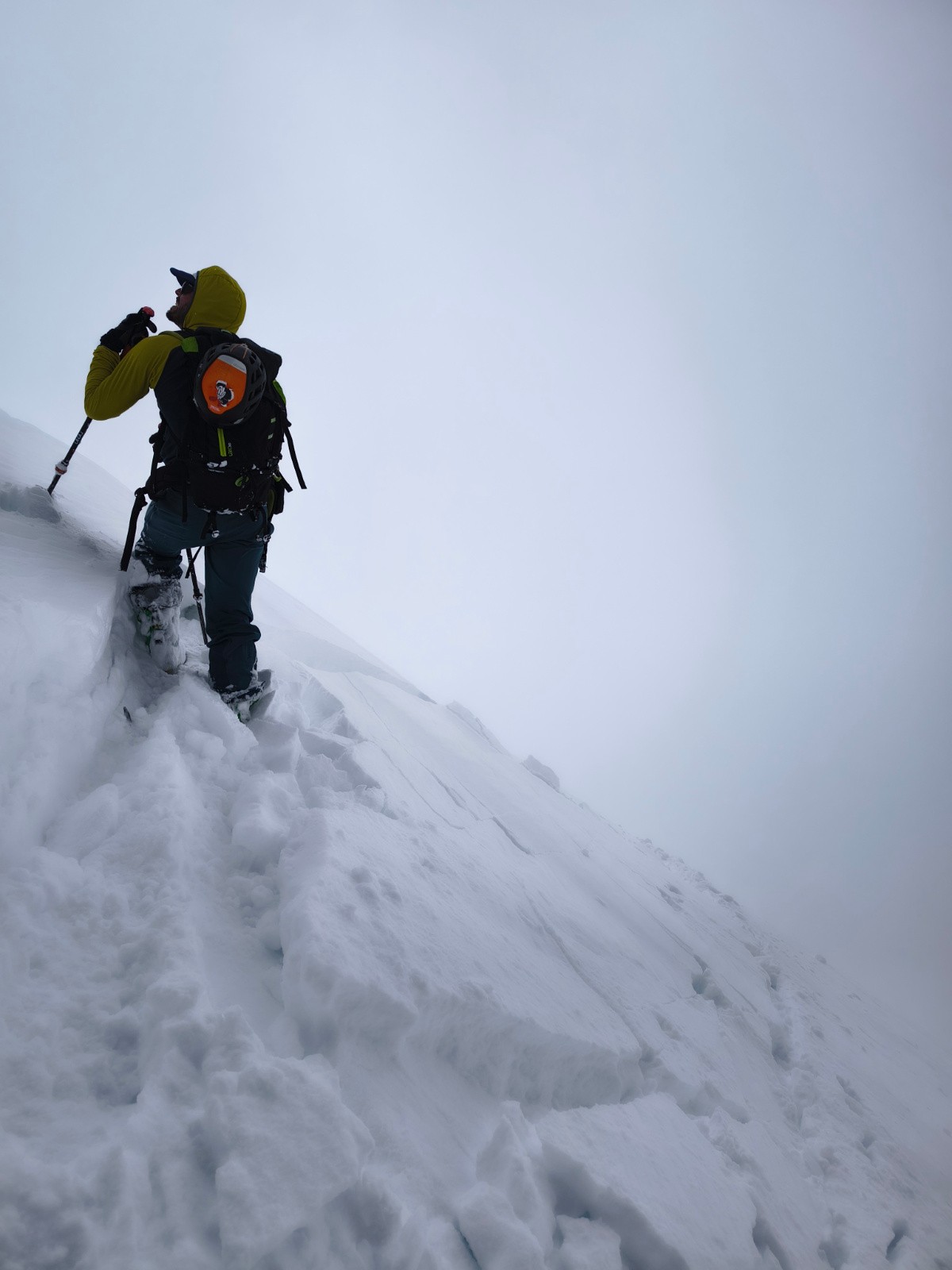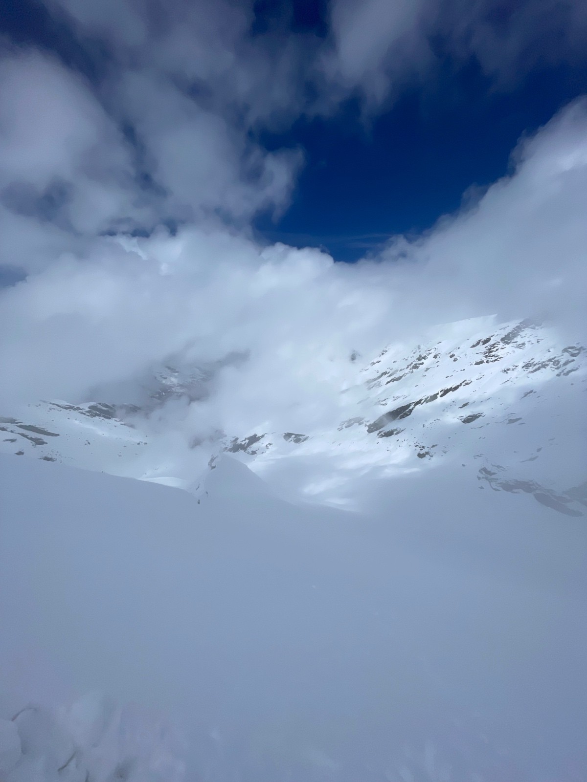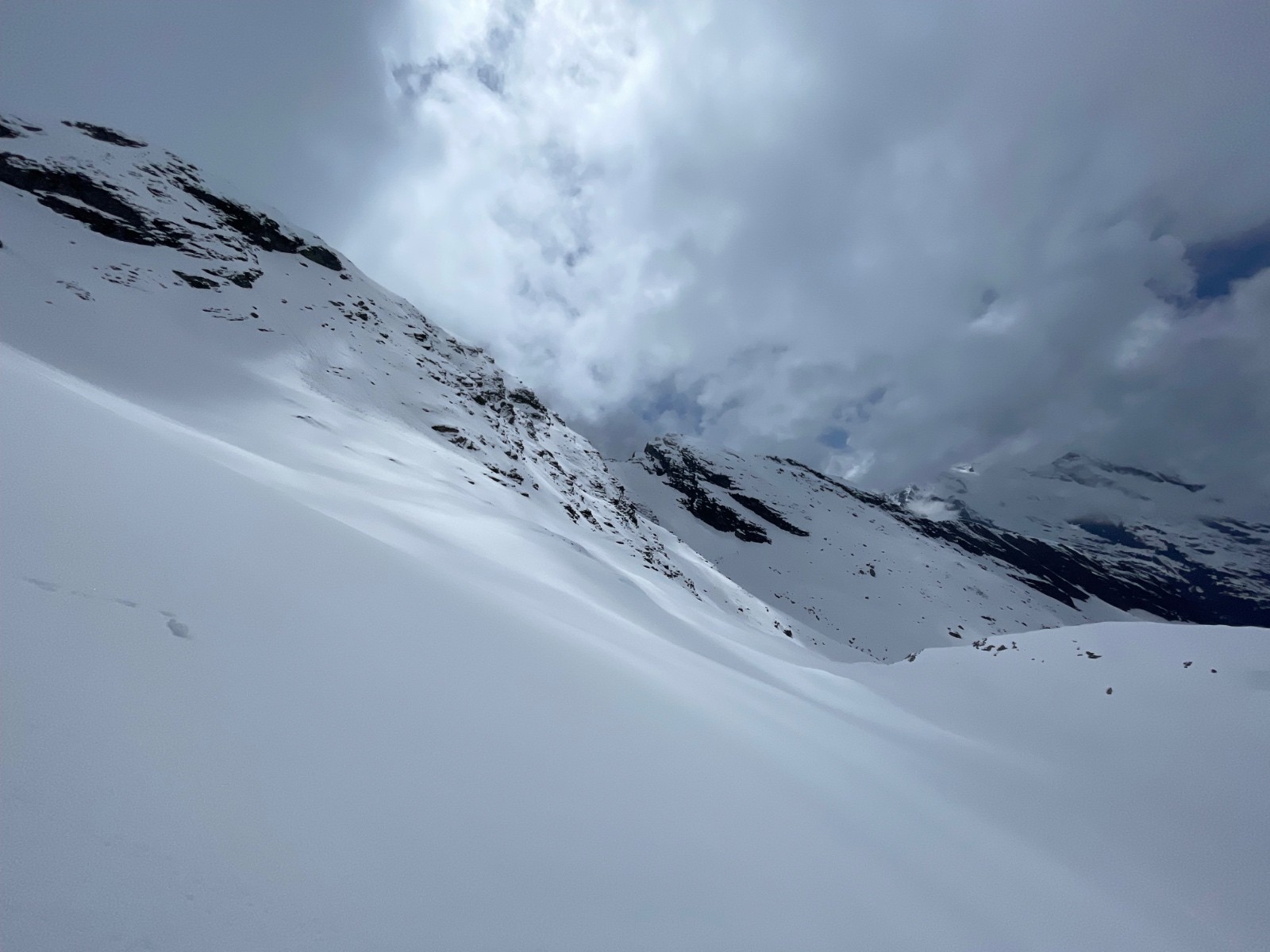 Qualité de la neige : de 2300 m à 2800 m, avec le soleil brulant qui réchauffe les 10 cm de fraîche, la neige est ultra collante et pourrie en profondeur, attention aux genoux. De 2800 à 3100 m, on perd (un peu) le côté pourrie mais on garde vigoureusement le côté collant. Par contre, entre >3200 et 3672 m, on change de saison. Là haut c'est l'hiver. On trouve rapidement 30 cm de poudre, puis 40 cm voire 50 par endroit sur la partie haute. Le manteau a peu (voire pas) chauffé à ces altitudes pour le moment. Résultat, le fond est dense et on skie une poudre digne d'un mois de février. Mais la prudence doit être de mise -> paragraphe suivant !