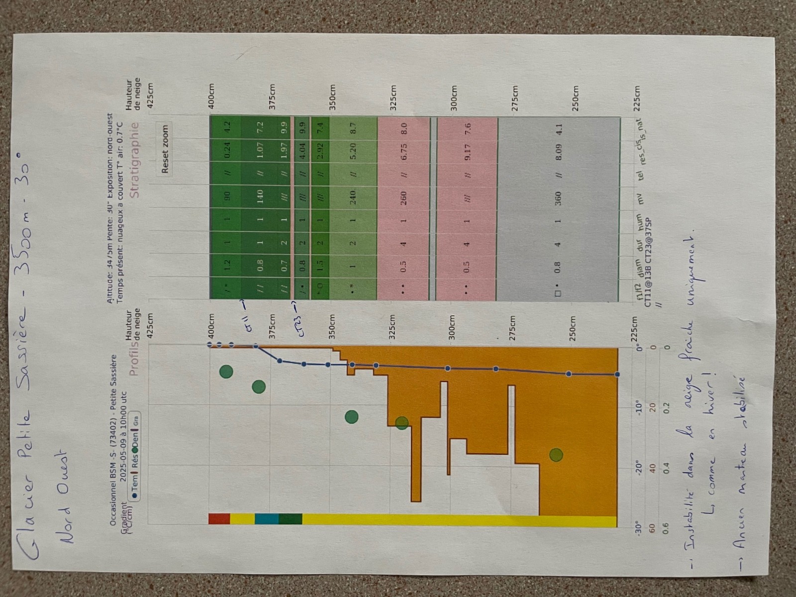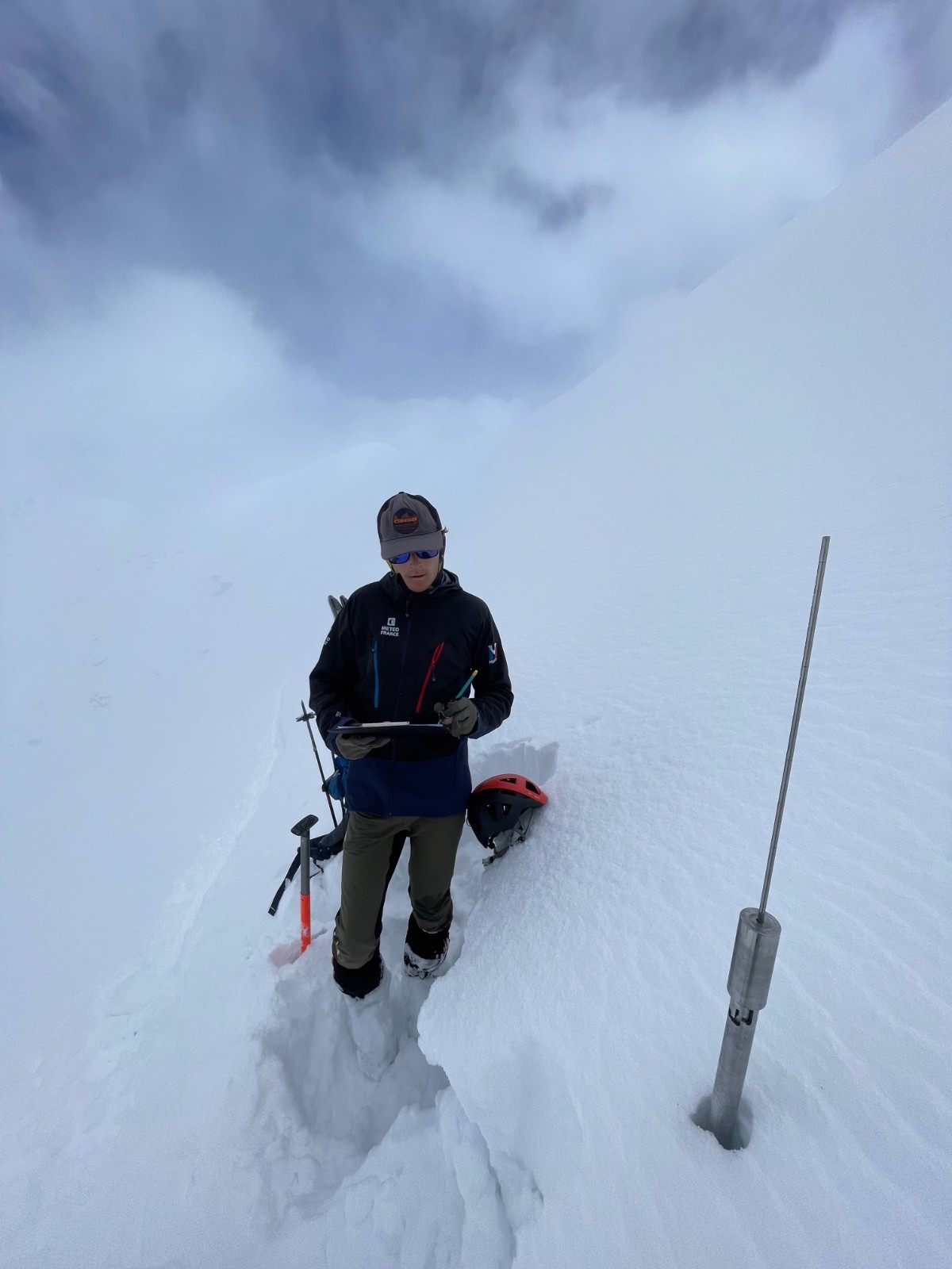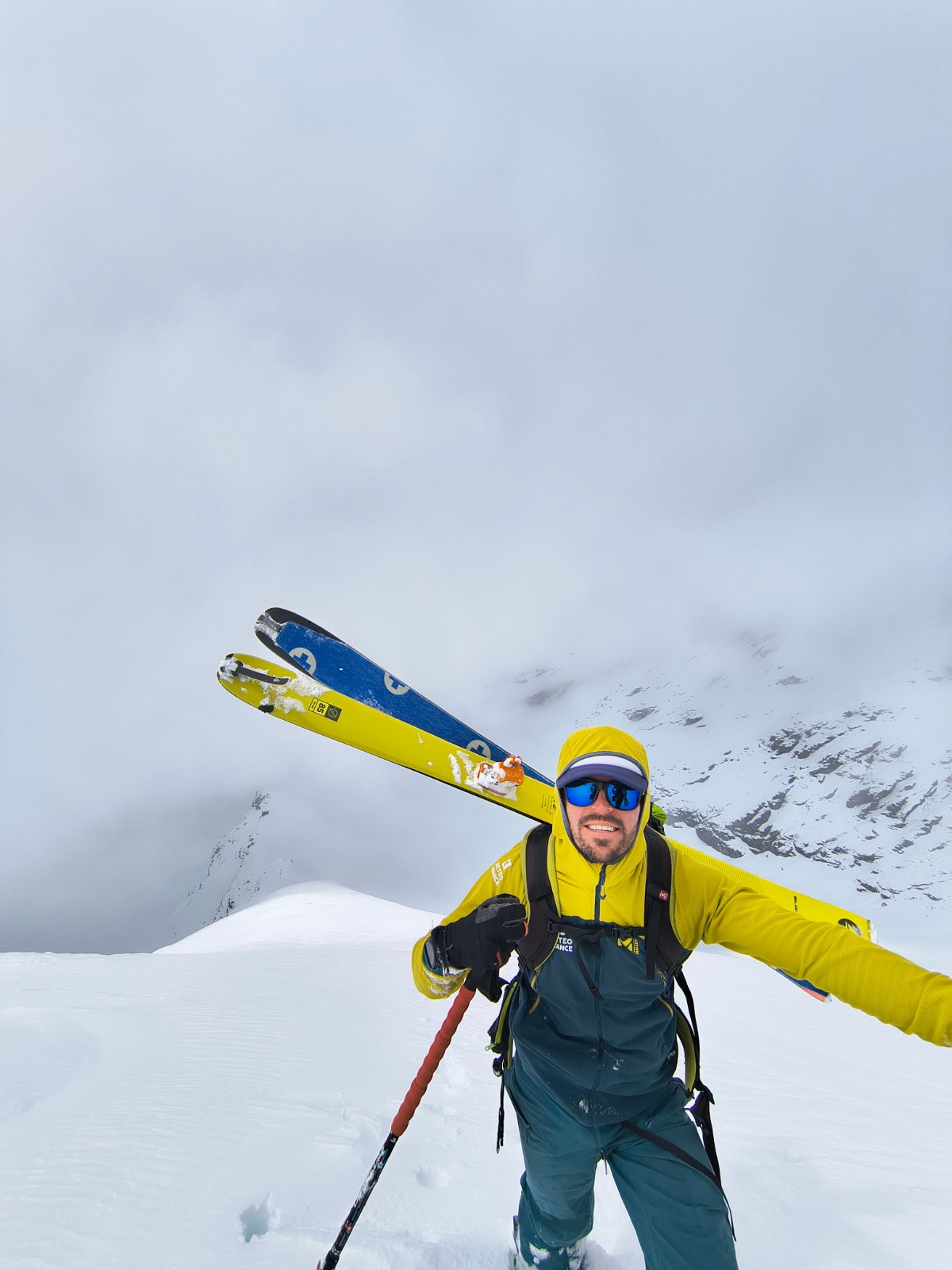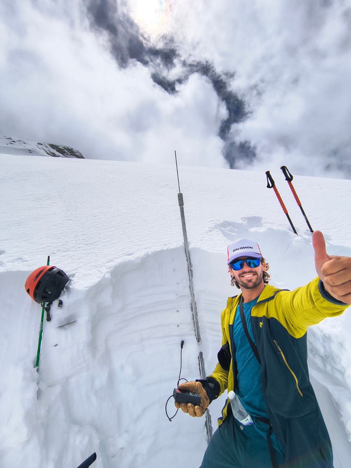 Qualité de la neige : de 2300 m à 2800 m, avec le soleil brulant qui réchauffe les 10 cm de fraîche, la neige est ultra collante et pourrie en profondeur, attention aux genoux. De 2800 à 3100 m, on perd (un peu) le côté pourrie mais on garde vigoureusement le côté collant. Par contre, entre >3200 et 3672 m, on change de saison. Là haut c'est l'hiver. On trouve rapidement 30 cm de poudre, puis 40 cm voire 50 par endroit sur la partie haute. Le manteau a peu (voire pas) chauffé à ces altitudes pour le moment. Résultat, le fond est dense et on skie une poudre digne d'un mois de février. Mais la prudence doit être de mise -> paragraphe suivant !
