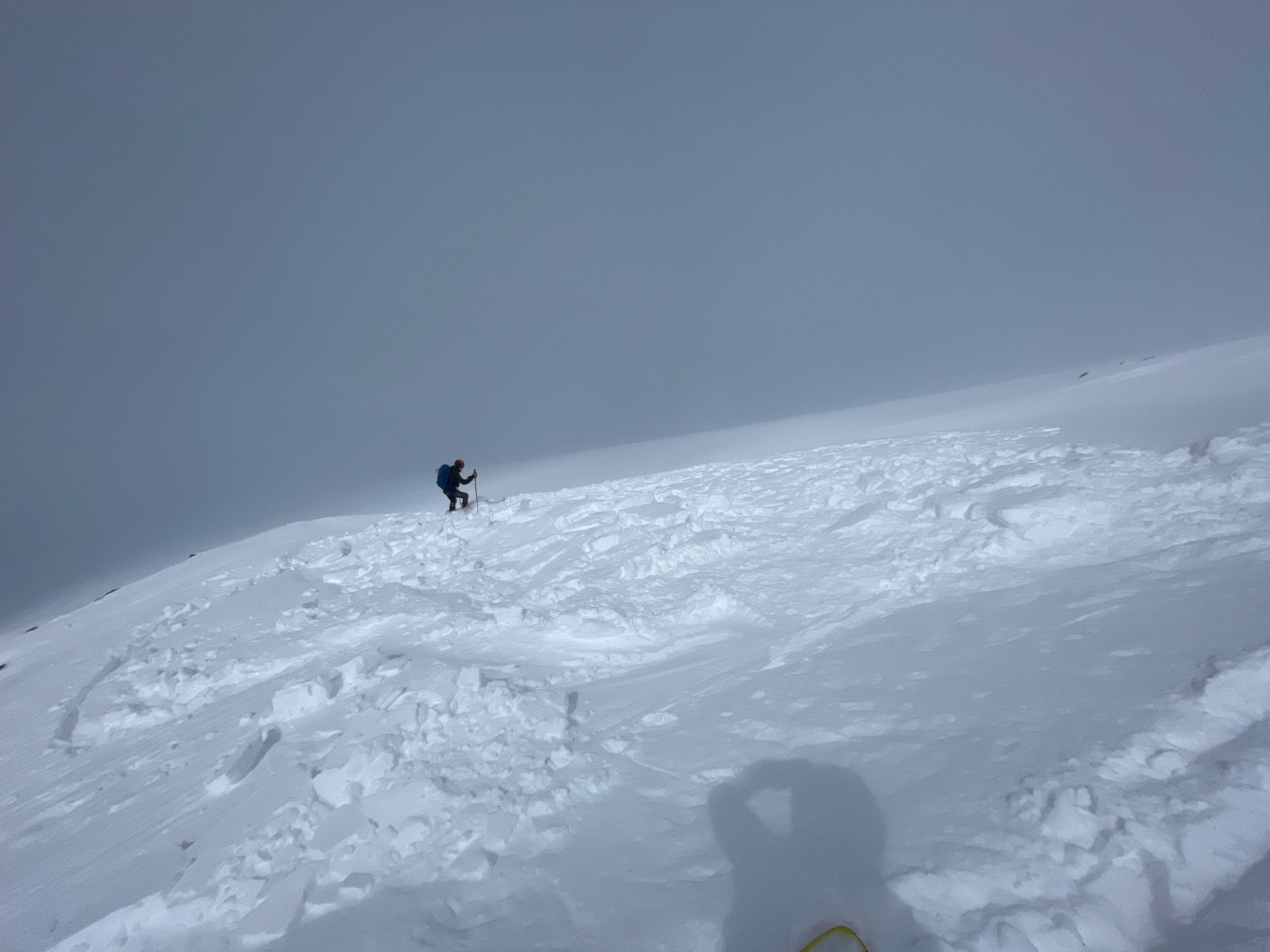 Activité avalancheuse : des boulettes et purges de surface quand la neige fraîche s'humidifie trop. Deux plaques à vent déclenchées en altitude (cassures 20-30 cm, une toute petite T1 à la montée et une vraie T1 de 20 m de large à la descente).