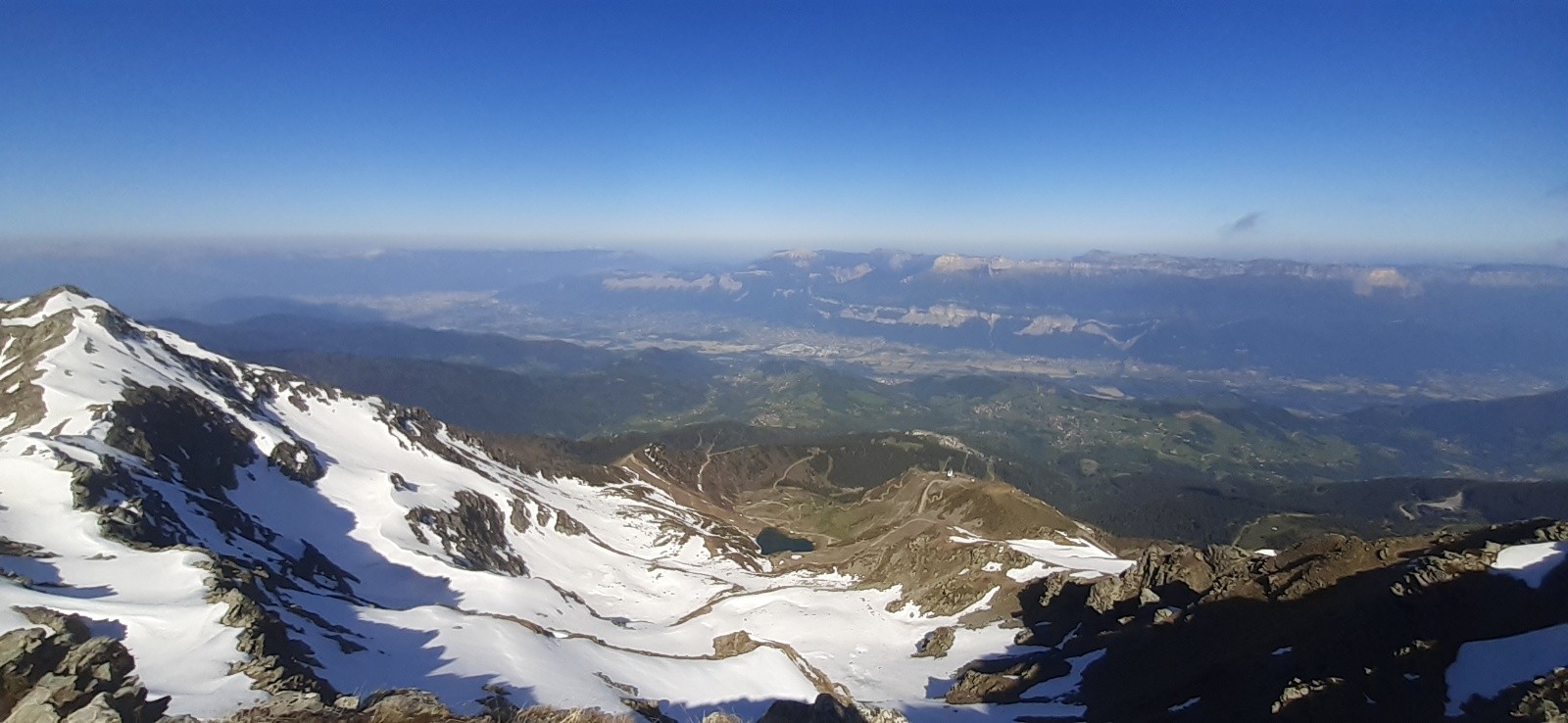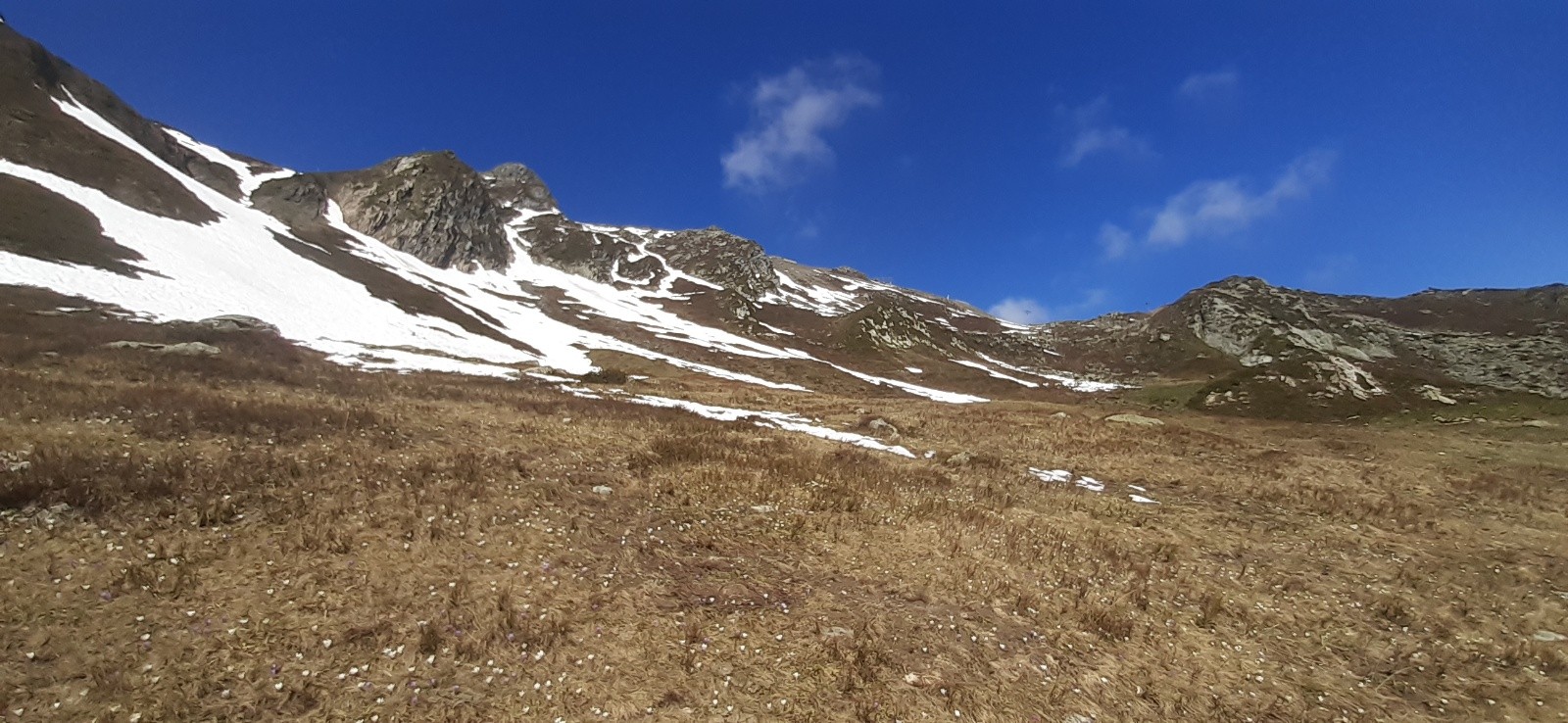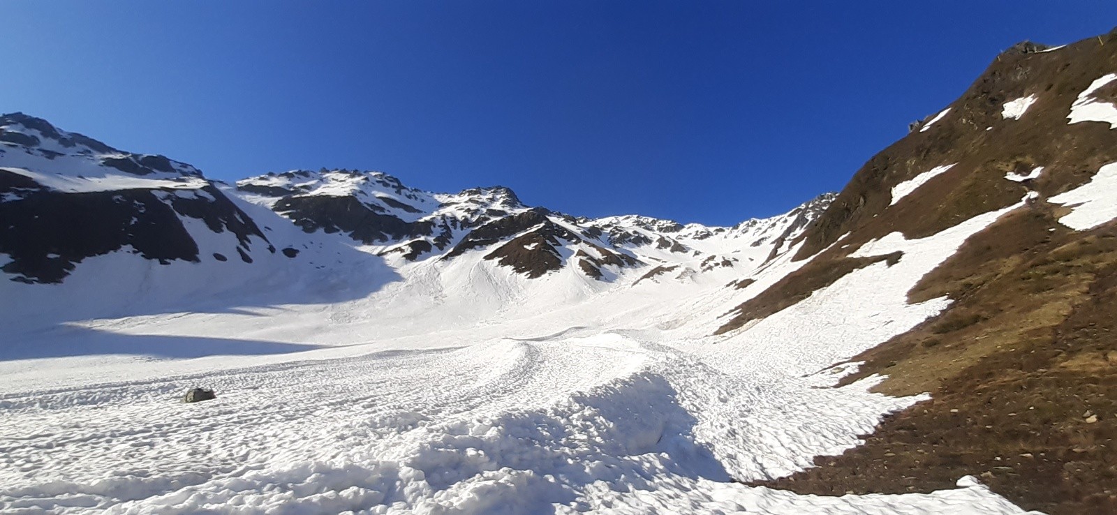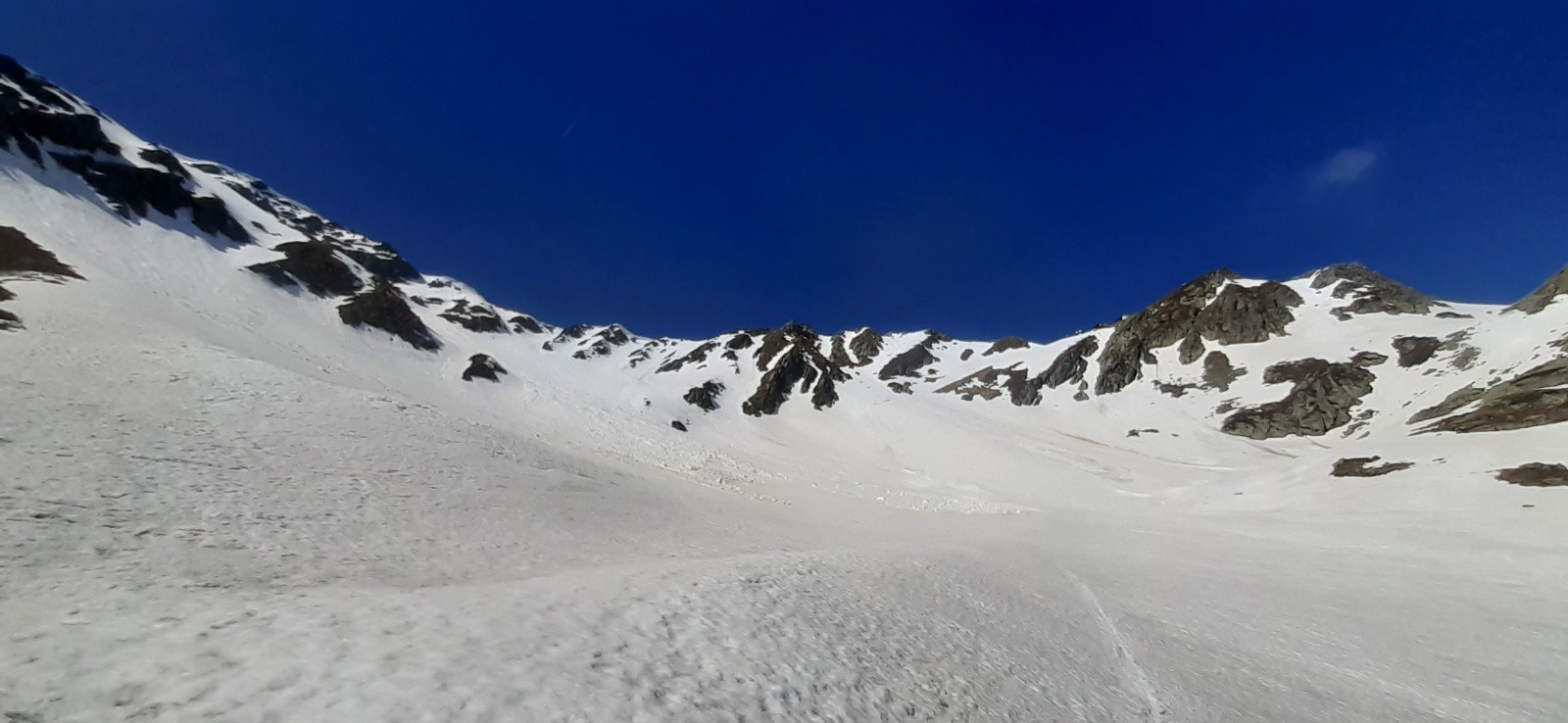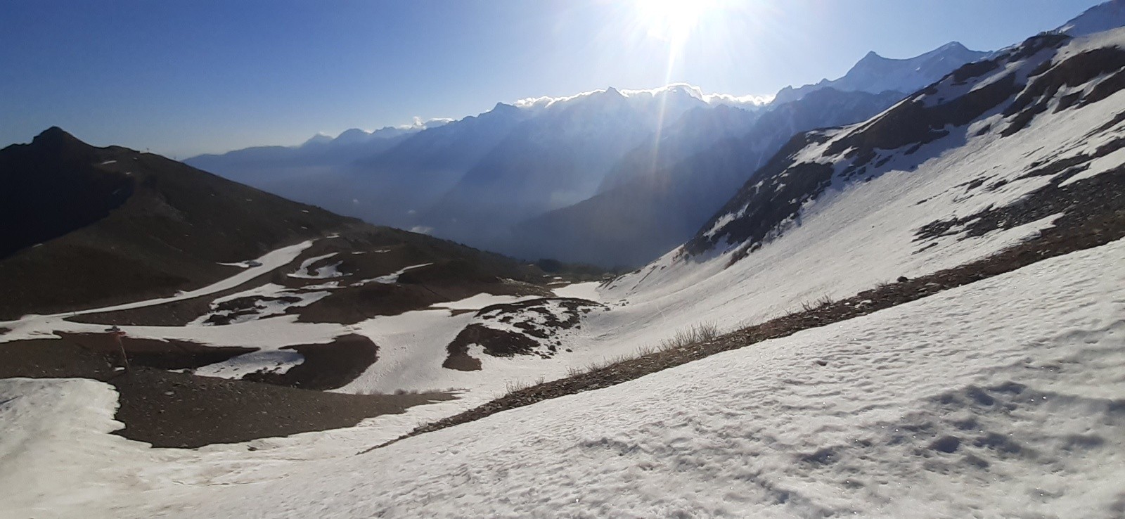 Entre le Fond du Pra et le pylone du TS de l'Oursière presque plus de neige (quelques névés) descente avec les skis en faisant du saute névé, remontée en portage.