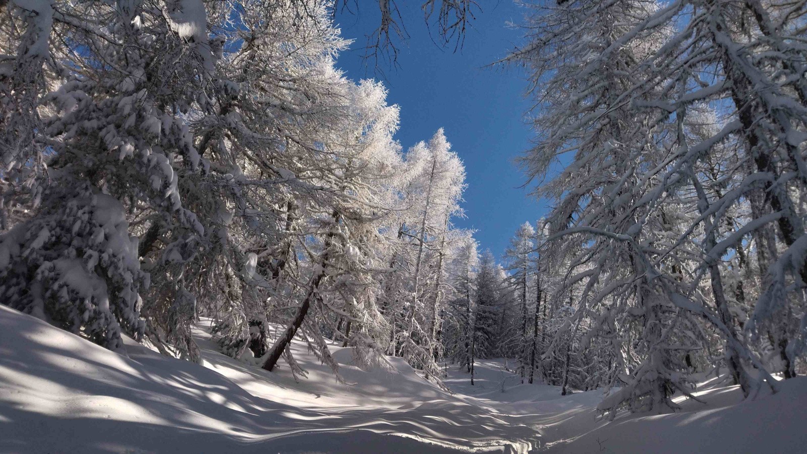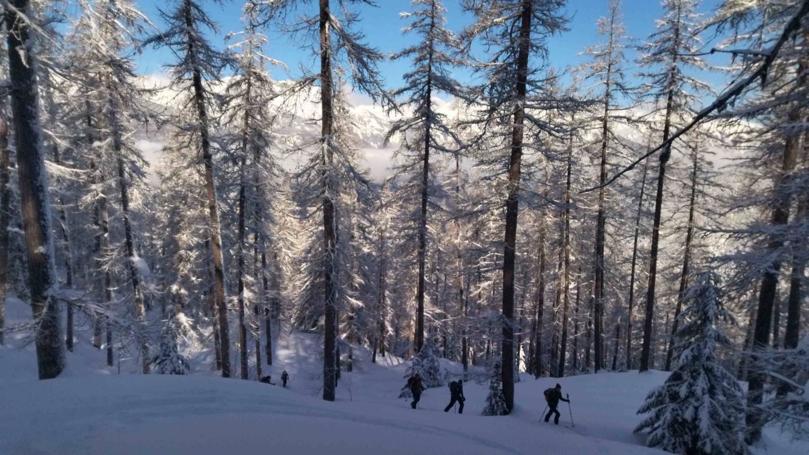 skier dans le mélézin ça nous change des forêts de sapins denses et peu skiantes