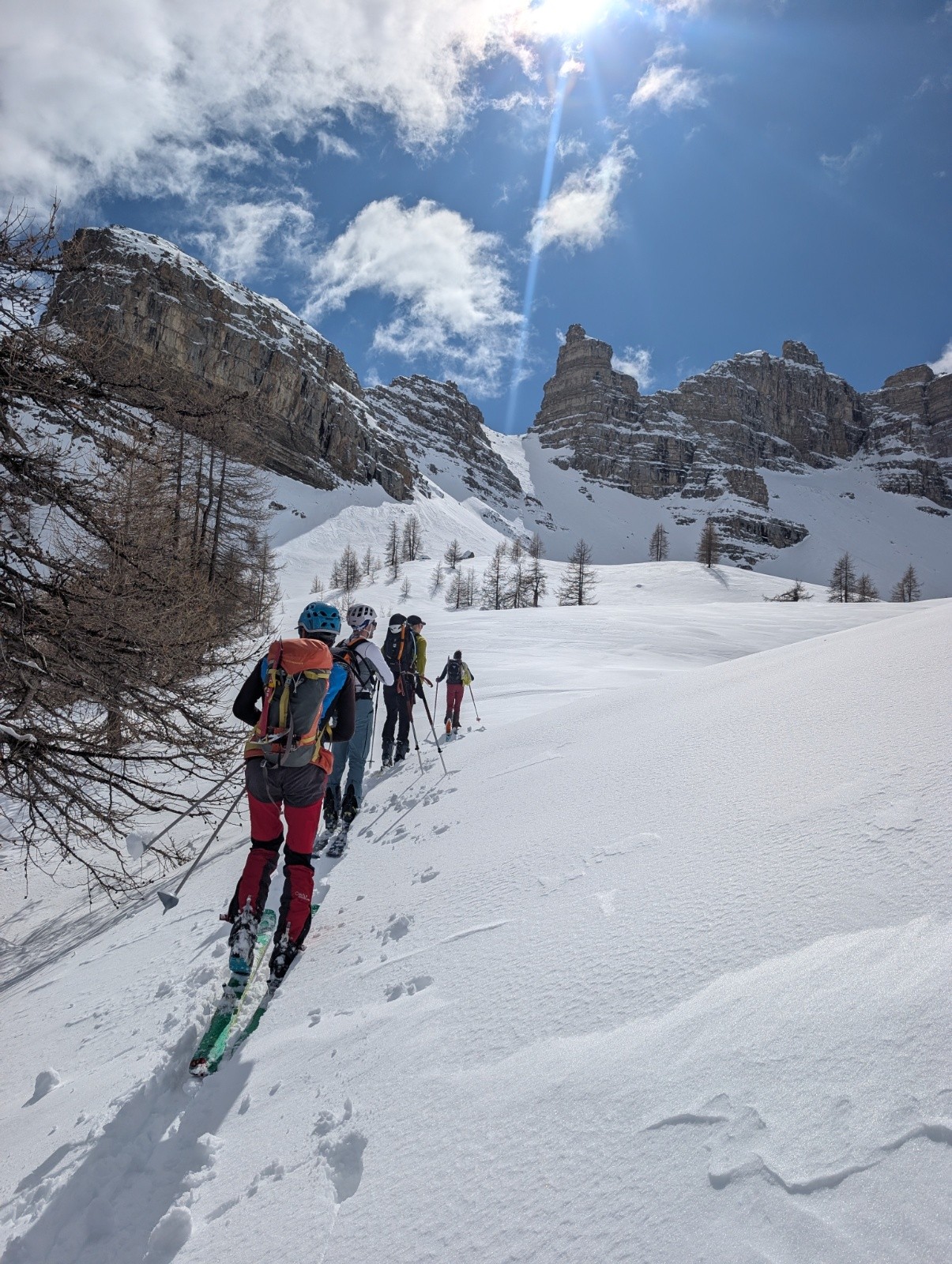 Mon compagnon de cordée n'étant pas dans un grand jour. Je fais équipe avec le groupe des éclaireurs qui m'acceptent parmi eux bien que je n'ai pas suivi la formation "initiation 2.2 coller/décoller ses peaux de phoques sans mettre de miettes de sandwich dessus du CAF."