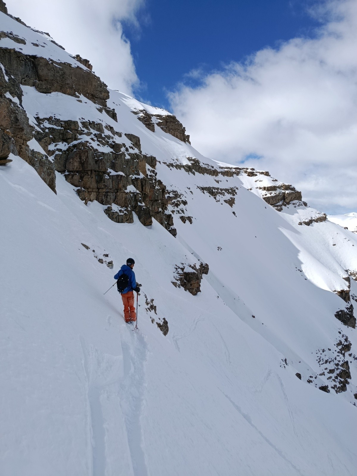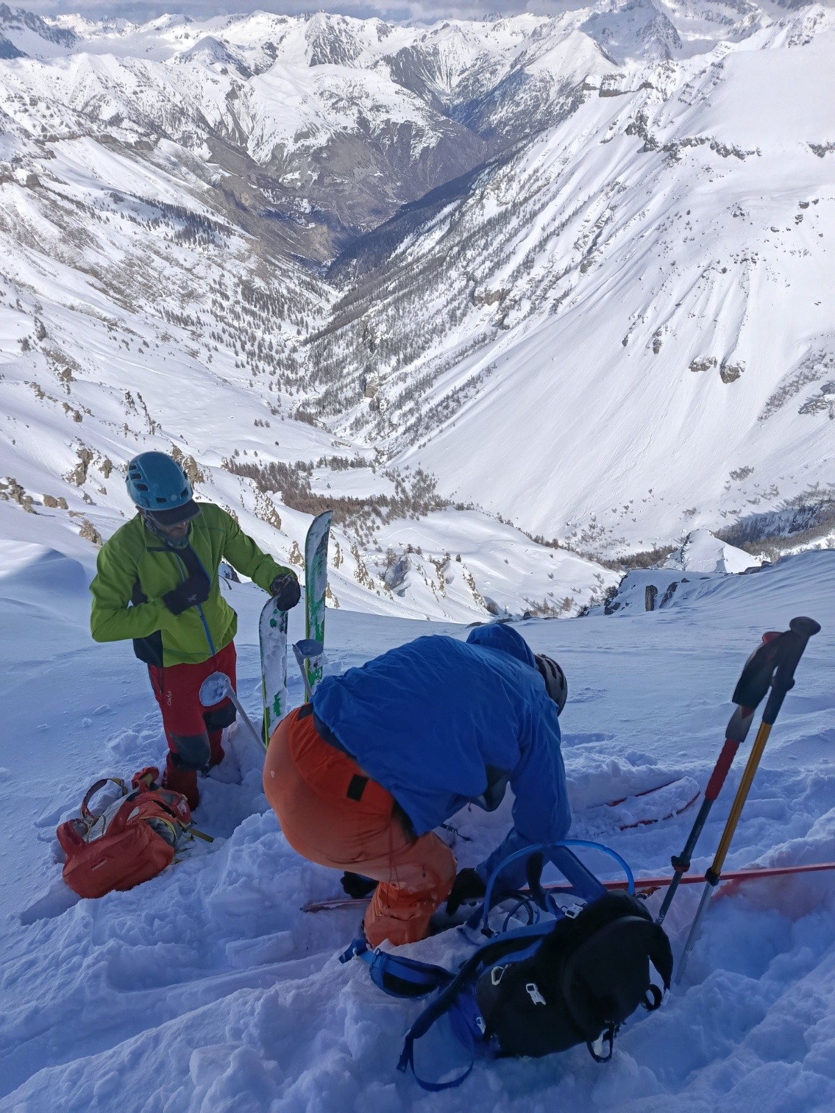Bon ensuite fin de montée un peu galère pour arriver sous le fort carra. Sans surprise, l'entrée de la face est raide et engagée. Une petite plaque qui part sous le poids du 3eme skieur.