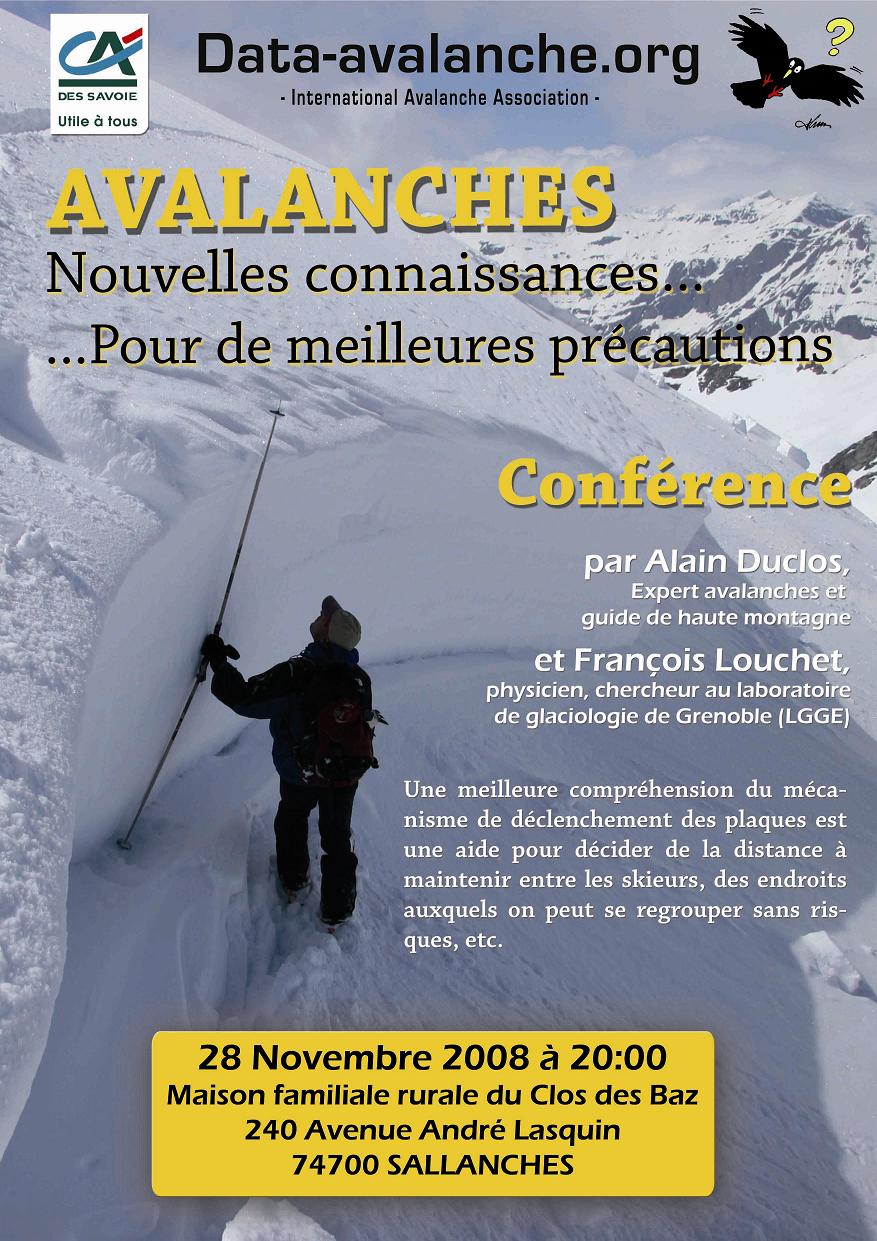 Une rencontre de la pratique et de la théorie est proposée avec Alain Duclos (guide et nivologue) et François Louchet (physicien spécialiste de la rupture), ça se passe le 28 Novembre 2008, à 20h00, Maison Familiale du Clos des Baz, 240 Avenue André Lasquin, 74700 Sallanches »