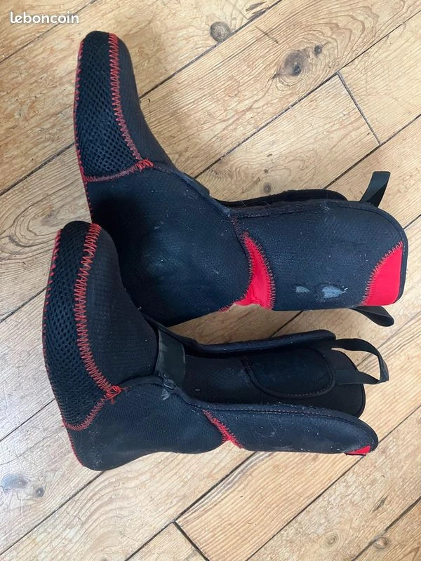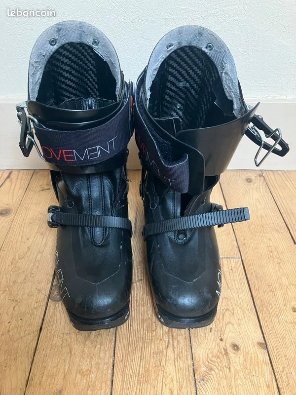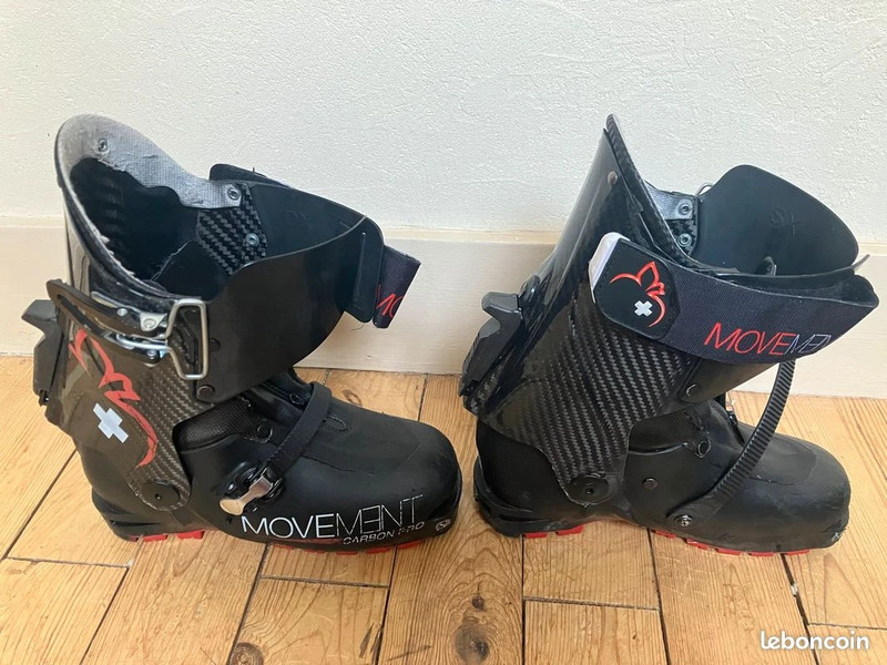 Chaussures à inserts movement carbon pro. Collier en carbone. Chaussures de rando très légères (1800g la paire) avec beaucoup de débattement (75°). Taille 24,5 (guide des tailles movement dans les photos, correspond à un 38). Très agréable à porter. Passage position montée à descente très facile et rapide. Bon maintien en descente avec le collier carbone. En très bon état, quelques traces d’usures sur la coque. Prix neuves 699€.